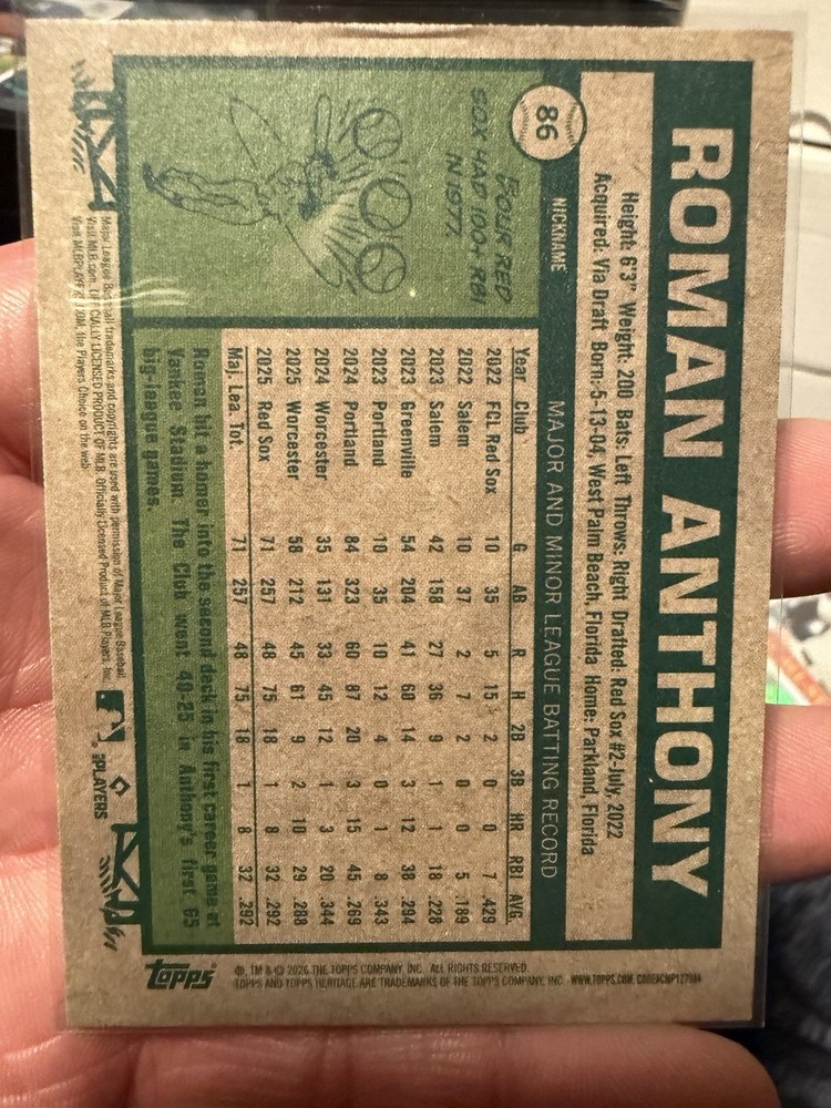 The Topps 2026 Heritage Roman Anthony RC #86 Roman Empire Nickname variant is a highly sought-after sports trading card featuring the rookie player Roman Anthony from the Boston Red Sox. This original card is part of the 2026 Topps Heritage set and is made of high-quality card stock. The card showcases the unique Roman Empire nickname variant and is a great addition to any baseball card collection, especially for fans of the Major League Baseball league.