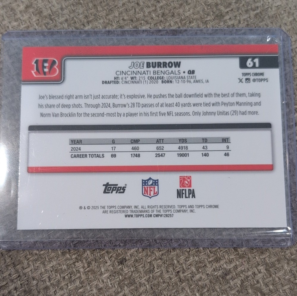 Topps Chrome 2025 Joe Burrow Green Leather 43/99 #61 Cincinnati Bengals Football