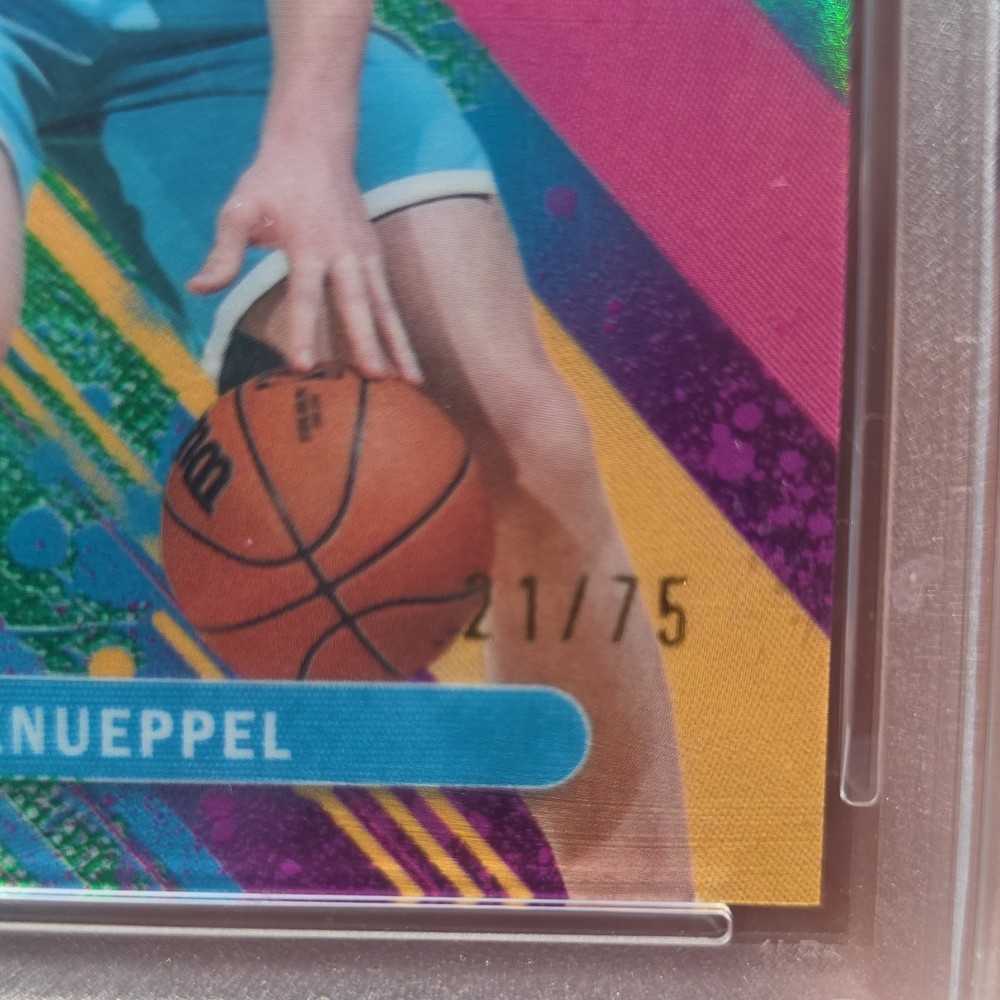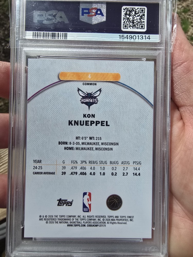 The Topps Finest Kon Knueppel #4 Green Refractor Hornets PSA 10 Serial 21/75 is a limited edition sports trading card featuring the basketball player Kon Knueppel from the Charlotte Hornets. This card is part of the 2025-26 Topps Finest set and has been professionally graded as a PSA 10, making it a highly collectible item for NBA fans and trading card enthusiasts. With only 75 of these green refractor cards in existence, serial numbered for authenticity, it is a valuable addition to any basketball card collection.