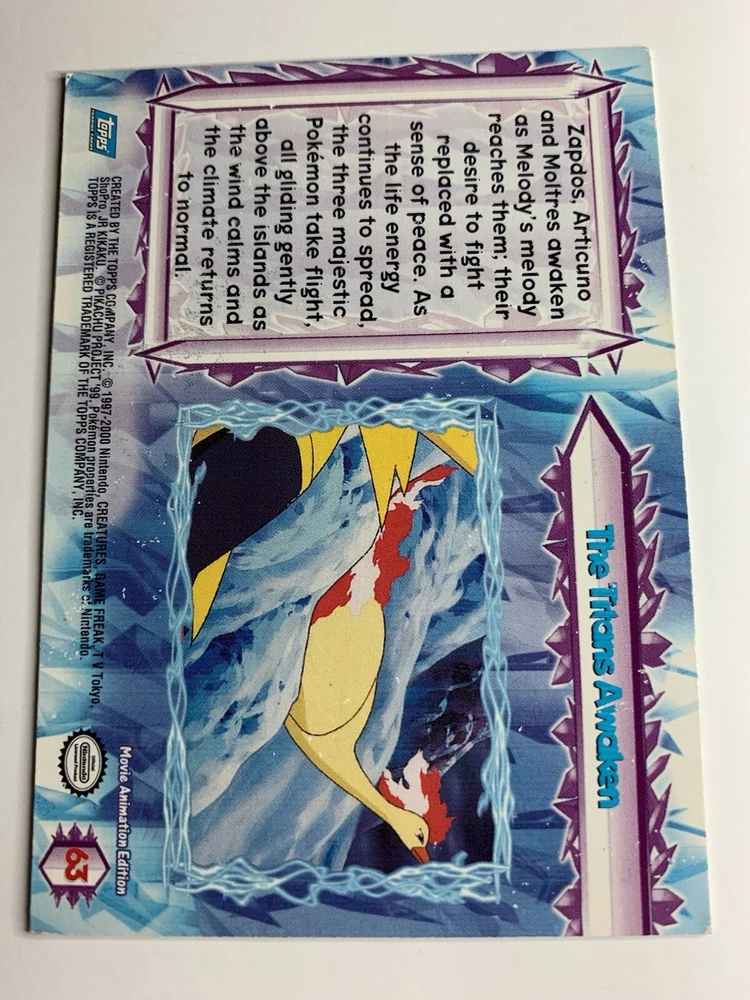 Topps Pokemon The Movie 2000 #63 The Titans Awaken Up for sale is a Topps Pokemon Movie 2000 card. Please review pictures as the card pictured is of the actual card that you will receive. The card will be placed in a penny sleeve and shipped in a cardboard box with delivery tracking. I have 100% positive feedback and have been selling items on ebay for many years. Let me know if you have any questions or need additional pictures and I will be happy to provide them. Yes - I do offer combined shipping. Additional shipping cost for each ungraded (raw) card is FREE and for each PSA graded item is only $0.50. Pokémon: the Movie 2000 Trading Cards was a set of Pokémon-themed trading cards manufactured by Topps in 2000. There were 72 cards in total: 12 cards featuring scenes from Pikachu's Rescue Adventure , 59 cards featuring scenes from The Power of One , and a checklist. Each of these 72 cards also had two foil card versions (silver and rainbow). In addition, there were bonus "chase cards" not included on the checklist, including 10 movie scene "Animation Stick-on" cards, 6 Pokémon First Appearance Hologram Cards, and Authentic Film Frame Cards. Cards were sold in randomly distributed packets of five or eight. One card in each packet would be a randomly chosen foil card. Packs containing rainbow foil cards were distinguished by an oval "Special Collector's Edition" stamp; the boxes the packs came in also featured the same stamp.