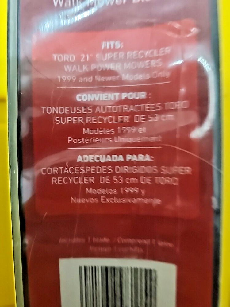 Toro 133-8183-03P OEM 21" Super Recycler Walk Power Mower Blade, NEW About This Product Powercare blade for 21 in. cut Toro Recycler walk behind mowers. Replaces OEM numbers 133-8183-03, 108-0954-03, 108-3762-03 and 93-4106-03. Measures 20-27/32 in. L and 2-1/4 in. W with a 7/16 in. center hole diameter, 3/8 in. outside hole diameter and 2-7/16 in. center to center diameter. Proudly manufactured to meet or exceed OEM specifications. Highlights Blade for 21 in. Cut toro recycler walk behind mowers Replaces OEM numbers 133-8183-03, 108-0954-03, 108-3762-03, 93-4106-03 7/16 in. center hole diameter, 3/8 in. outside hole diameter and 2-7/16 in. center to center diameter For gas powered walk behind mowers Fits 21 in. toro super recycler and heavy-duty recycler mowers 1999 and newer Please look at the photo's. If there are more than one of the same item it will be a stock photo. Feedback is automatically given after you leave feedback for me. Shipping discount will be give in the form of a refund when buying more than 1 item after package is ready for shipping Thanks for looking.