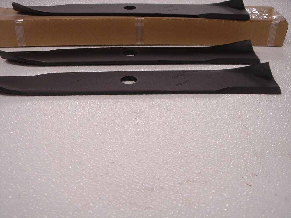 This offer is for 1 complete set (3 pieces = 1 set) of the factory original equipment OEM Toro Wheel Horse part # 106635 42" rear discharge blade . This 42" rear discharge blade set will fit many 42" rear discharge riding mower /garden tractor decks made by Toro Wheel Horse from the 1970's to 2007 garden tractor models ( but NOT the newer LX lawn tractor or Z zero-turn mower models). Dimensions of the blades are: 14 1/2'' long, 2'' wide, 3/4'' center bore and they are .205 thick. These blades have the Toro logo (the big "T" that looks like a bull head) and the old original part # 106108 stamped into them for identification and certification of authentic OEM blades . These are new and unused fresh inventory, still in the original Toro box that they come in. Offered for less than the current MSRP of this blade set. NOTE: the 14 1/2" length measurement is from the furthest tip to the opposite further tip (or measured diagonally ) at the longest possible measurement of the blade. These blades are LONGER than the 13 7/8" blade used on a side discharge mower deck. No Reserve!! In stock for immediate shipment!! USPS Priority shipping cost is determined by buyers location / zip code Can't find what your looking for? >> Check out our Store <<- click here please note - this blade set will NOT work on some of the older model decks that have a "D" shaped center hole (differently said- a round hole with two flat sides)- you will need to obtain a different part # blade set, or add adapter bushings to use this set - we no longer have the bushings avail- but I have seen them on the internet- thanks - sherwoods