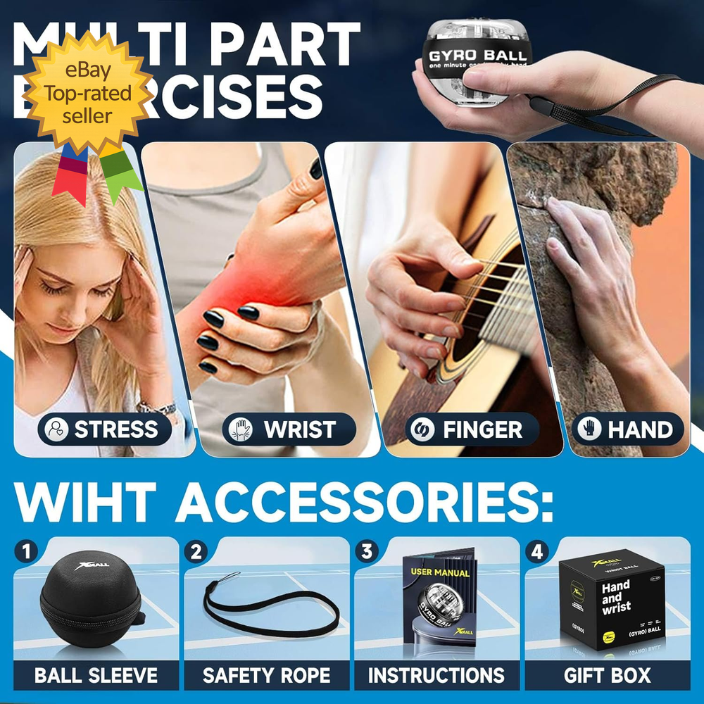 Store New Arrivals Add to Favorite View Feedback Contact Torque Ball Hand Exerciser Grip Strength Trainer Forearm Strengthener Wrist Power Description Unit Count 1.0 Count Style Safety Number of Items 1 Color Black Material Plastic or Metal Package Weight 0.33 Kilograms Item Weight 150 Grams Construction Type Plastic Item Dimensions LxWxH 2.1 x 2.7 x 0.04 inches Sport Exercise & Fitness Item Package Dimensions L x W x H 3.78 x 3.5 x 3.11 inches 【PRODUCT CONTAINS】Wrist gyro ball, brand card, ball sleeve, safety rope, gift box. 【GOOD FOR HEALTH】Using wrist gyro balls for exercise can alleviate problems such as wrist soreness and finger stiffness caused by prolonged fixed hand movements, and can also promote blood circulation. An interesting palm wrist gyro ball that can be used as a stress relieving toy, played at any time, and can also exercise arm muscles. 【EASY TO USE】Newly upgraded products that automatically starts without the need for a rope, making it easy to use. Simply rotate the core ball to start. 【BATTERY FREE DESIGN】Precision mechanical design, no battery required to provide power. The interaction between the rotation of the wrist and the internal ball core generates centrifugal force, which can maintain high-speed rotation. The faster the speed, the greater the force generated. ABOUT US We offer the best prices around on high quality products. Our E-store includes media such as books, movies, music and games while offering electronics, toys, sporting apparel, clothing, tools, general home, garden items and more. SHIPPING We are always working hard to ensure your package arrives as soon as possible. Please understand that some factors like weather, high postal traffic, and the performance of shipping companies are outside of our control. We offer free shipping to the lower 48 states and ship within 2 business days of payment, usually sooner. We do not accept P.O. Boxes. Please provide a physical address. For shipping outside of the continental USA, we only use eBay's Global Shipping Program.The item is shipped to KY and then sent to the rest of the world. International customers are responsible for all duties and taxes. Continue to check out in order to calculate costs for shipping the item to your country. Messages regarding eBay's Global Shipping Program MUST be directed at eBay EXCLUSIVELY. RETURNS We offer a 30-Day Return Policy on items which you are not completely satisfied with. You have the option for a full-refund or an exchange of the item. No returns are available on items shipped outside of the USA. PAYMENT We accept PayPal. CONTACT US This page content is yet to come Please ad us to your favorite seller and visit again later Thank You CUSTOMER SATISFACTION We try our very best to make sure every customer is completely satisfied. If there's a problem, message us! We're happy to help.
