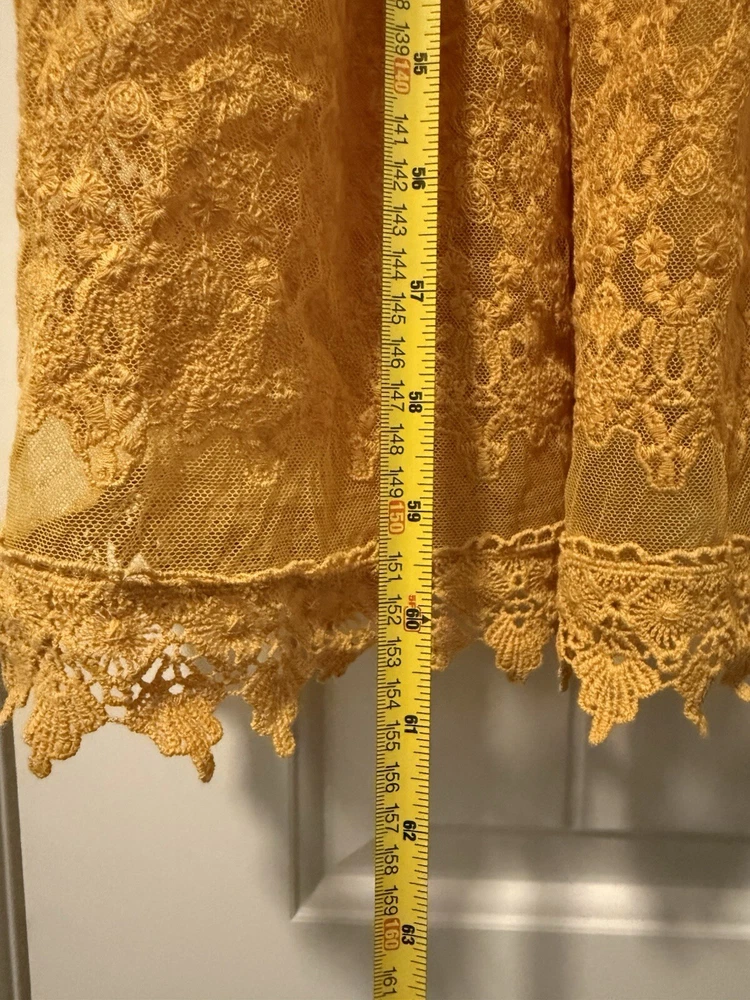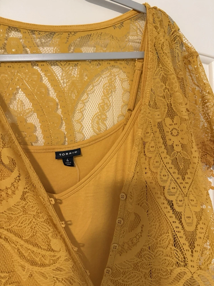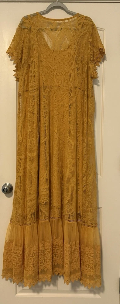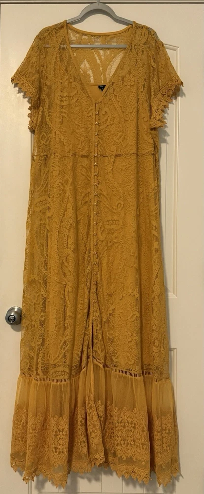 Torrid Maxi Lace Button-Front Mineral Yellow lined Dress size 4. Perfect for a casual picnic or more formal affair, this luxe lace and crochet maxi with a button down closure and embroidered sleeve details is equally as versatile as it is comfortable. Split neck Button closure Stretch waist Slip included Self: nylon/cotton; lining: rayon/spandex