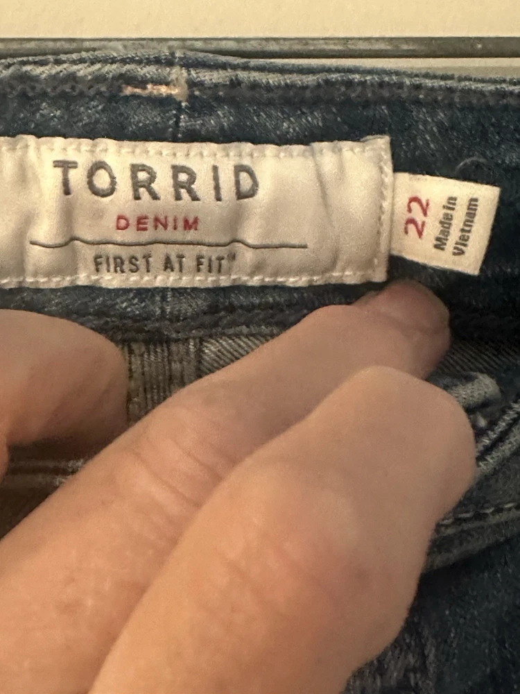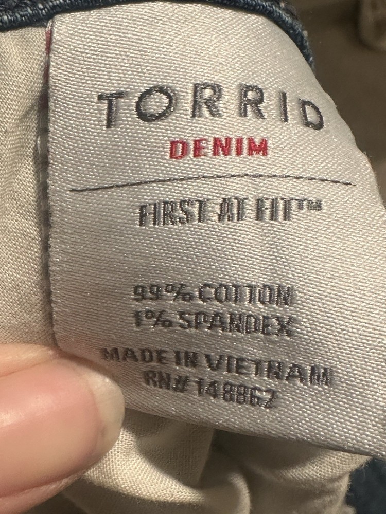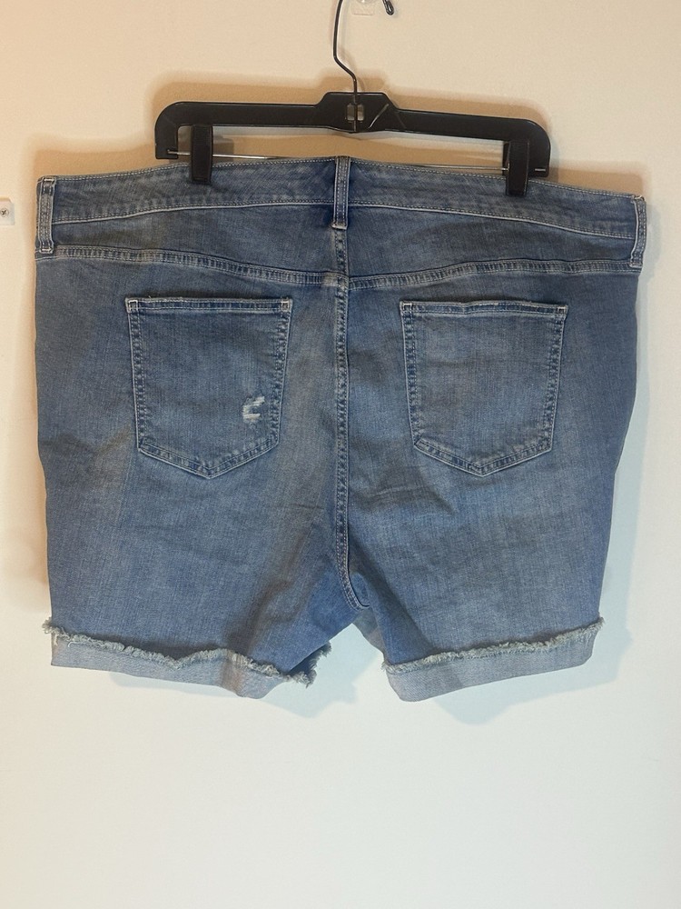 These Torrid denim button fly shorts in size 22 offer a casual and comfortable option for warm weather days. Made from a cotton blend denim fabric, they feature a high-rise waist and regular fit for a flattering silhouette. The solid blue color and American theme make them versatile for various occasions, from walking to the beach. With a flat front and cut-off style, these shorts are perfect for a laid-back yet stylish look. Preowned Good Condition