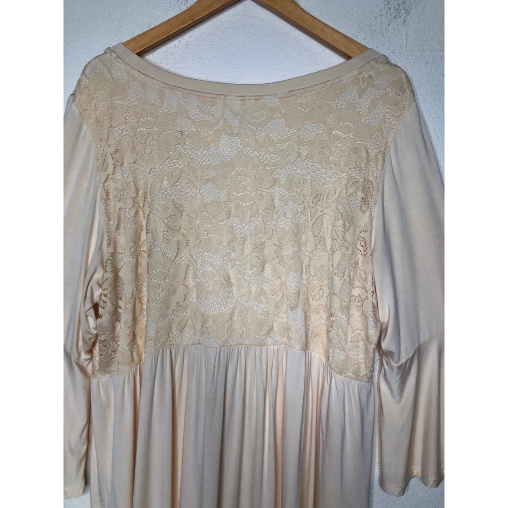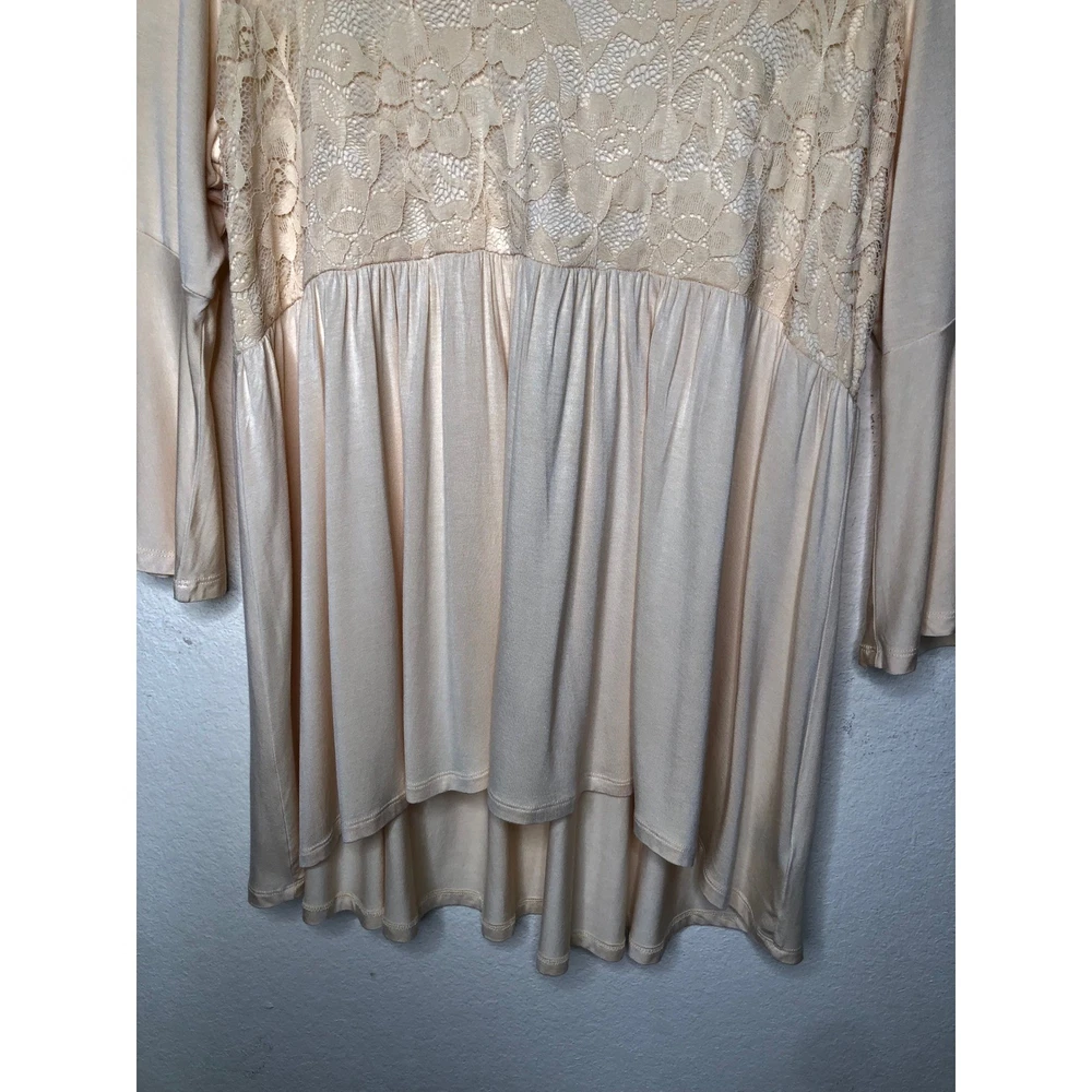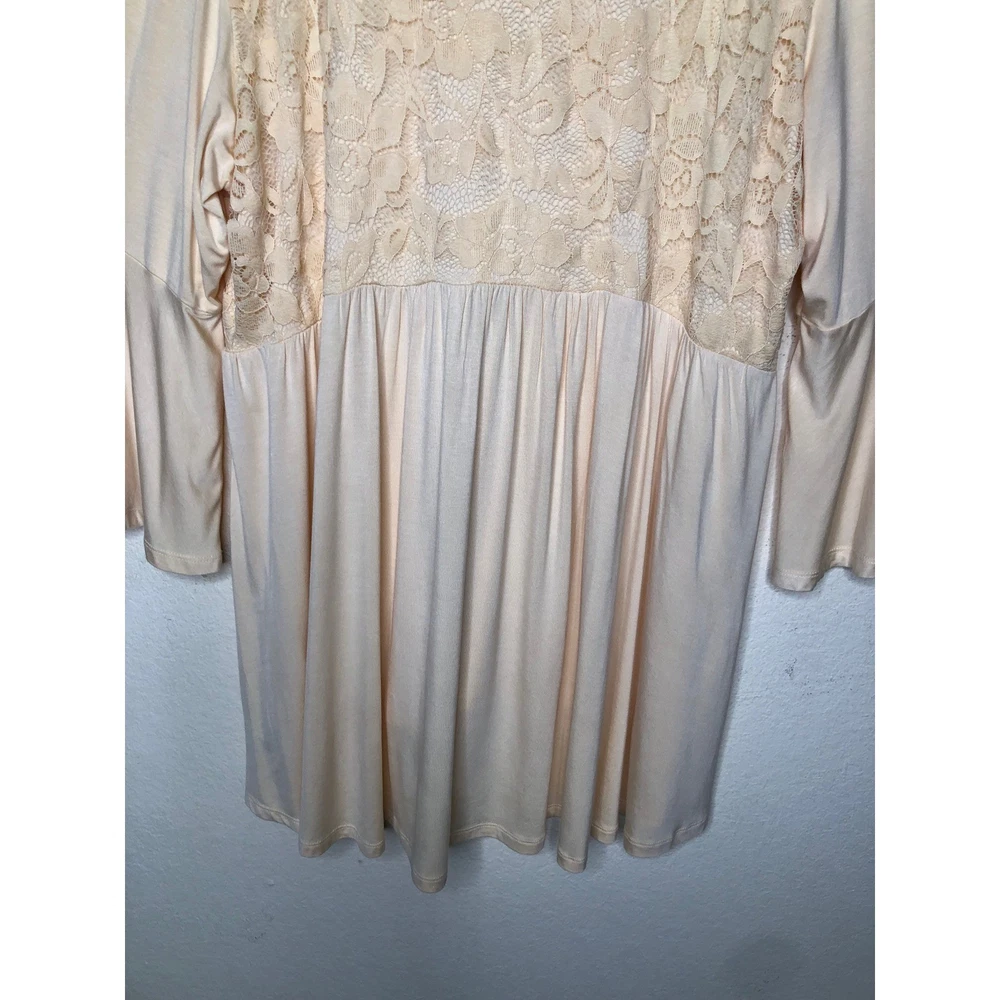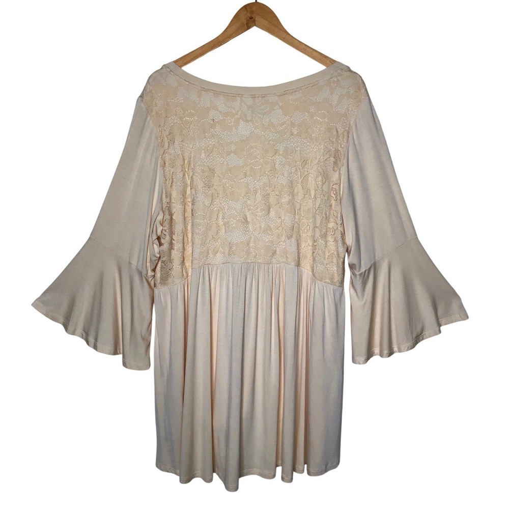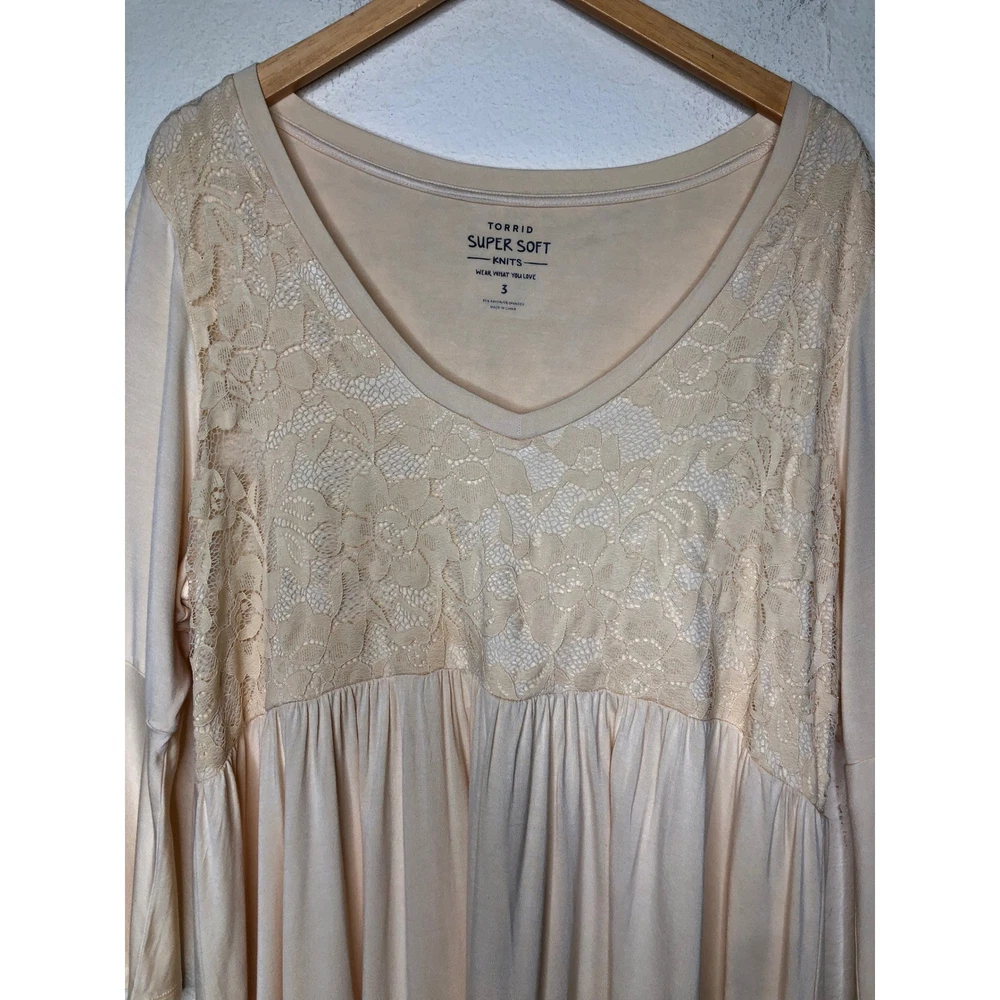 Torrid Super Soft Knits top in a delicate peach hue features a romantic lace yoke on both the front and back. Designed with a flattering babydoll silhouette, this piece includes a V-neckline and dramatic bell sleeves for a bohemian-inspired look. The lightweight rayon-blend fabric offers a comfortable stretch, while the high-low hem adds modern dimension to the flowy fit. Preowned in excellent condition. Measurements: • Chest: 47" • Waist: 42" • Length front: 31" • Length back: 33" • Sleeve: 19" Size: 3X Brand: Torrid Style: Babydoll Neckline: V-Neck Sleeve Type: Bell Sleeve Material: Rayon, Spandex, Nylon Pattern: Solid with Lace Trim Color: Peach / Apricot Occasion: Casual Fit: Relaxed Features: High-Low Hem, Lace Yoke Season: Spring, Summer, Fall Boho, Romantic, Feminine, Plus Size, Cottagecore, Ethereal, Flowy, Softcore, Pastel, Victorian Inspired, Peplum, Flare Sleeve, Whimsy, Soft Girl • I ship within two business days. • All items come from a pet-free, smoke-free home. Thanks for shopping at Second Harvest Shop! Your support means the world to us.