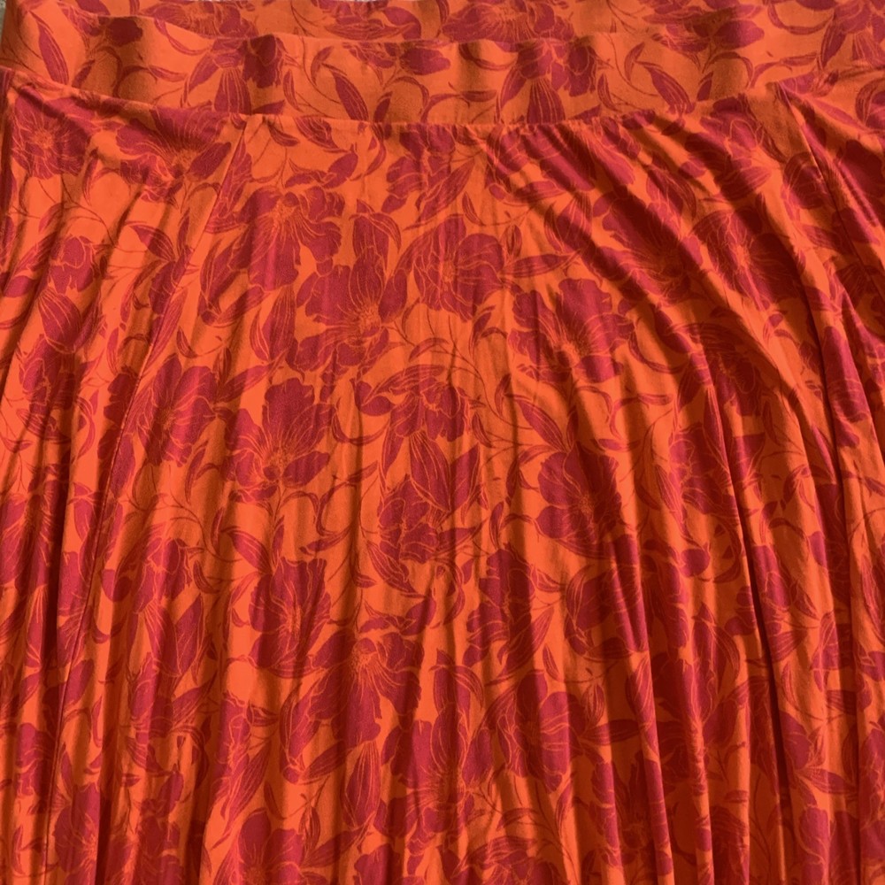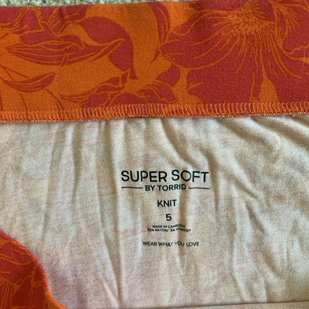 Elevate your wardrobe with the Torrid midi skirt, a perfect blend of comfort and style. Designed in a handkerchief hem silhouette, this skirt flaunts a vibrant orange and pink floral pattern that’s sure to turn heads. The super soft knit fabric, a blend of rayon and spandex, ensures breathability and a comfortable fit for all-day wear. The elastic waistband offers ease of movement while the skirt's stretch feature accommodates various body shapes. Suitable for a range of occasions from casual outings to cocktail parties and even travel, this skirt is a versatile addition to any collection. Caring for this piece is a breeze as it's machine washable, ensuring it remains a staple in your closet through every season. 52" waist Length vaires from upper to lower ankle and down to the foot, depending on your height. Tropical print Bargain