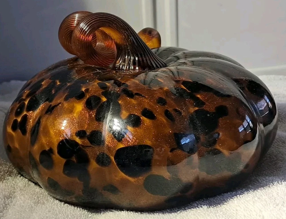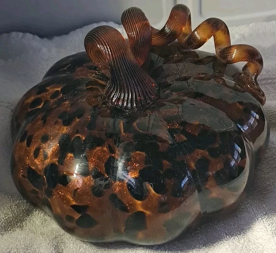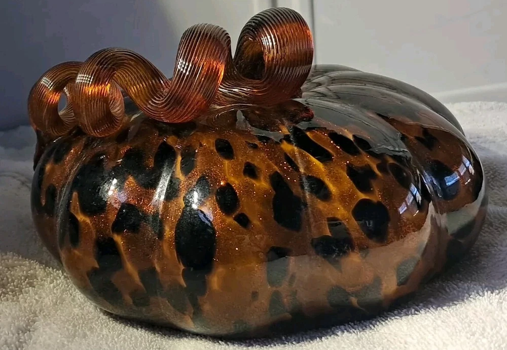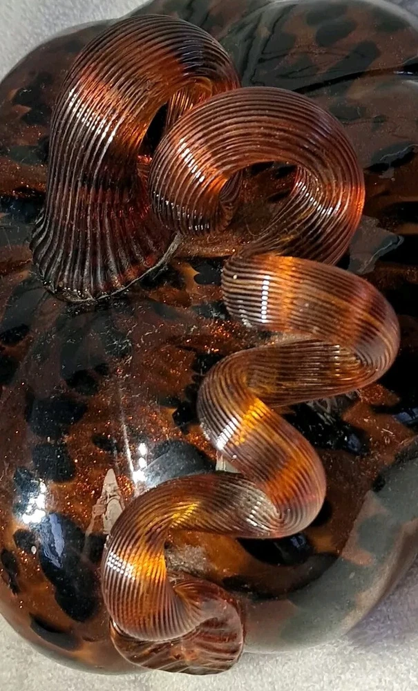 Tortoise Shell & Glitter Art Glass Hand Blown Pumpkin Swirled Stem with glossy finish and glitter details make this piece a standout addition to any collection. Measuring 5.5 inches in height and 9 inches in width, this contemporary original is an ideal size for display. The artist is unknown, but the quality of this sculpture is undeniable. Whether you're a fan of art glass or simply love unique and eye-catching decor, this pumpkin is sure to impress. Beautiful piece to add to your collection. Please see all photos. Buyer pays shipping. Please see my other items. Thank you.