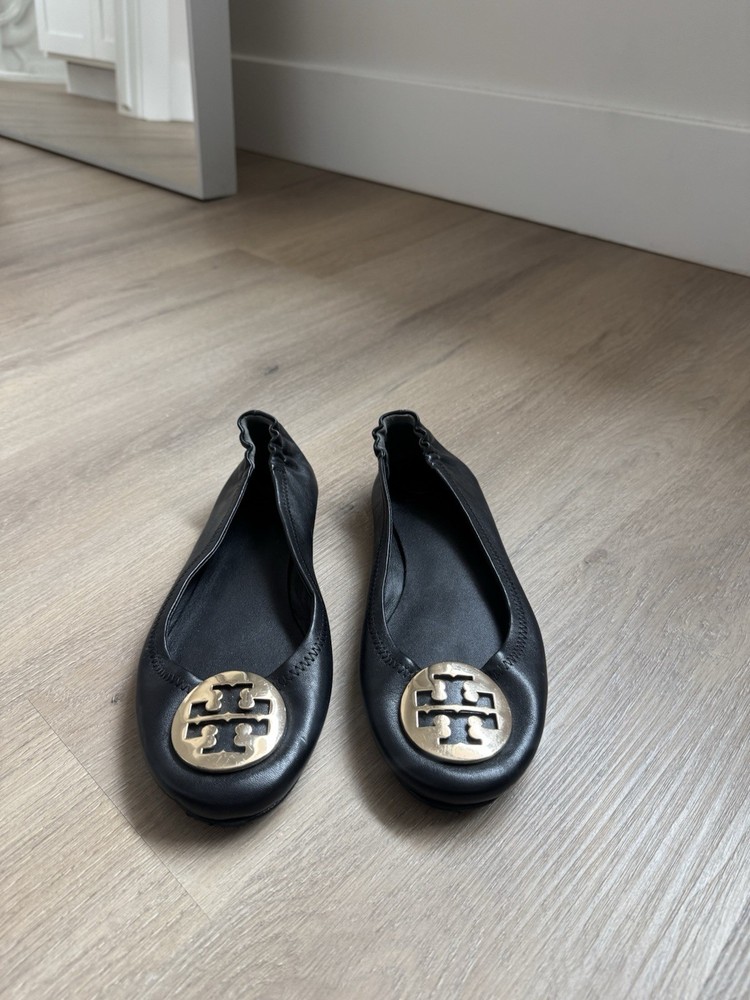 Tory Burch Black Leather Ballet Flats Gold Logo Medallion Women's Shoes