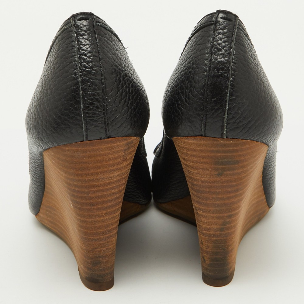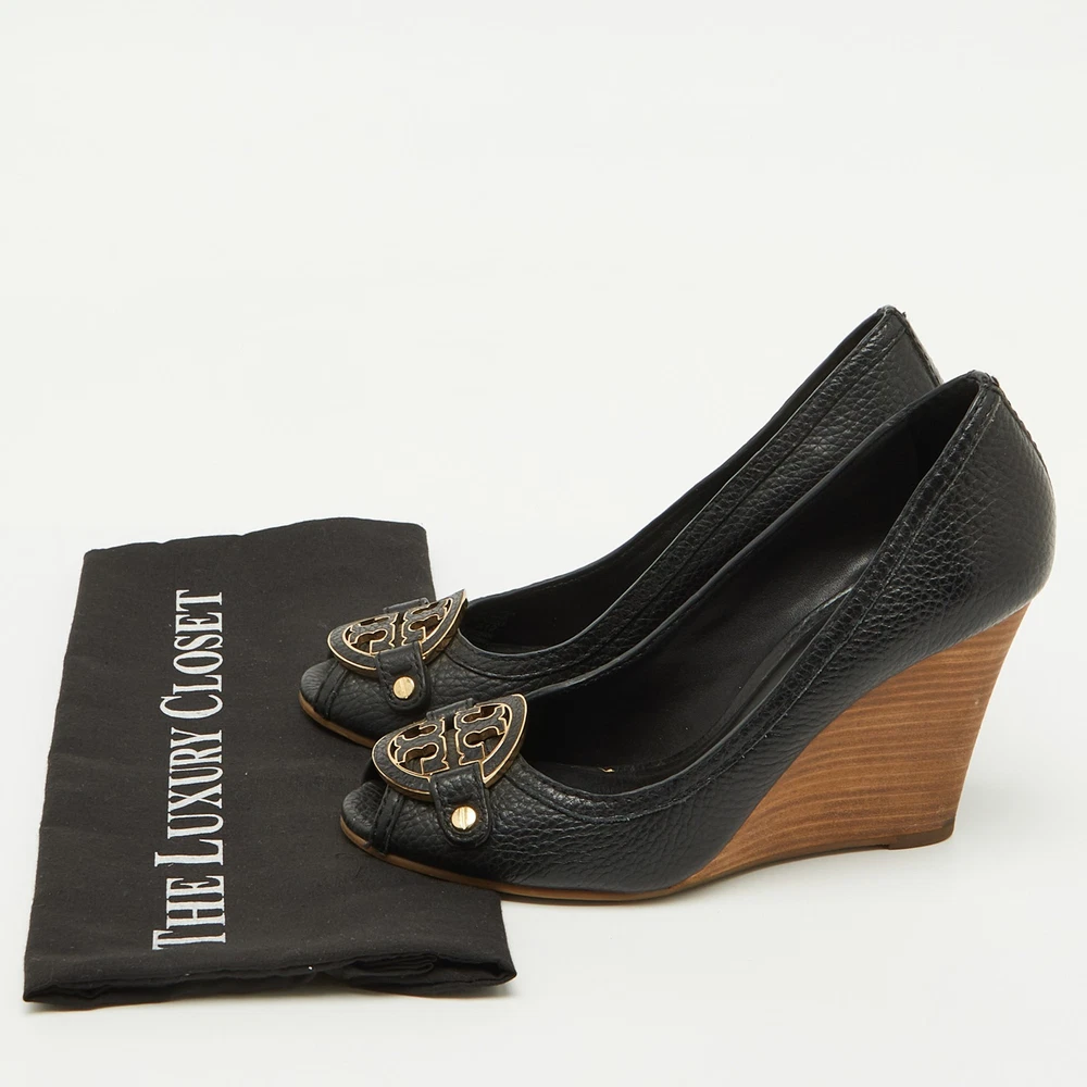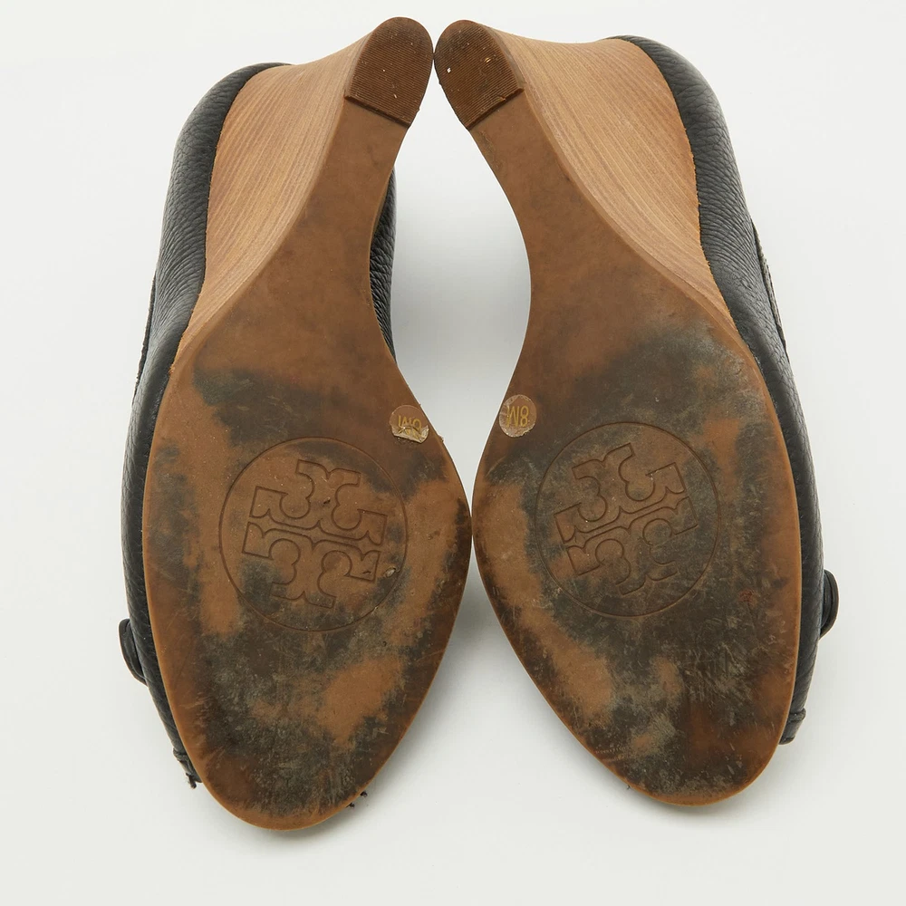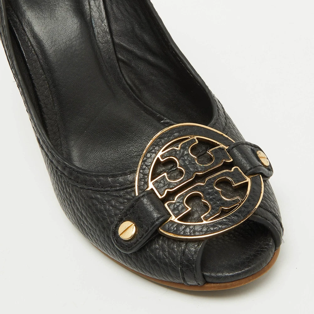 Tory Burch Black Leather Logo Peep Toe Wedge Pumps Size 38