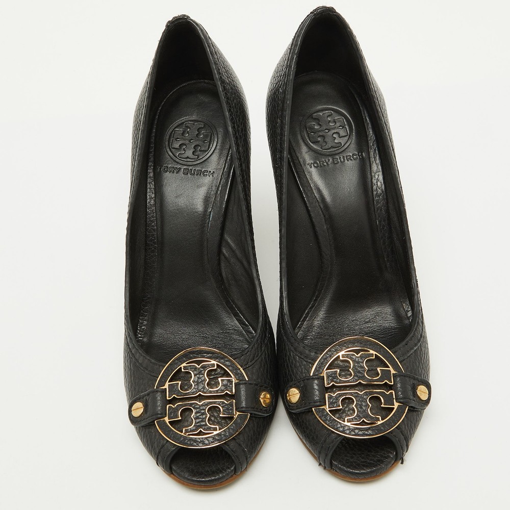 These Tory Burch pumps are a perfect blend of style and practicality, featuring black leather with a peep toe design. The iconic Tory Burch logo embellishes the front, adding a touch of sophistication. With a comfortable wedge heel, they’re ideal for both office wear and casual outings.Certified by The Luxury Closet - This item has gone through a detailed authentication process overseen by our experts. We offer a lifetime guarantee of authenticity on all our items. Import duties, taxes and charges are not included in the item price. These charges are the buyers responsibility. Please check with your country’s customs office to determine what these additional cost will be prior to buying. Our eBay Store About Us Contact Us Add to Favorite Sellers Tory Burch Black Leather Logo Peep Toe Wedge Pumps Size 38 $166.1 These Tory Burch pumps are a perfect blend of style and practicality, featuring black leather with a peep toe design. The iconic Tory Burch logo embellishes the front, adding a touch of sophistication. With a comfortable wedge heel, they’re ideal for both office wear and casual outings. Product Details Brand Color Black Dimensions Material Leather Size 38 Outsole Width 8 cm Outsole Length 24 cm Heel Height 10 cm Includes The Luxury Closet Packaging Certified by The Luxury Closet This item has gone through a detailed authentication process overseen by our experts. We offer a lifetime guarantee of authenticity on all our items. How We Check The in-house team of experts at The Luxury Closet is highly trained to verify the authenticity and the condition of the luxury products. They ensure that only 100% authentic items are put on sale.The evaluation process is unique with its own mix of assessment criteria and differs according to the category. Each item is evaluated based on the following combination of hallmarks, hardware, stitching, symmetry, material, craftsmanship, stamping, codes, hologram stickers, and packaging. Our authenticators also check if the items have been modified or amended (e.g., aftermarket diamonds, replaced batteries, repaired bags, etc.) International Buyers Import duties, taxes and charges are not included in the item price. These charges are the buyers responsibility. Please check with your country’s customs office to determine what these additional cost will be prior to buying.