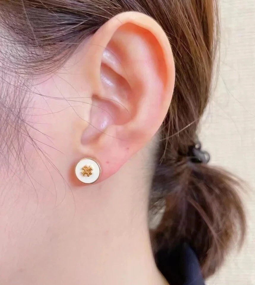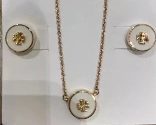 Tory Burch Double T Logo Simple Lady Jewelry Set Necklace + Earrings White Color