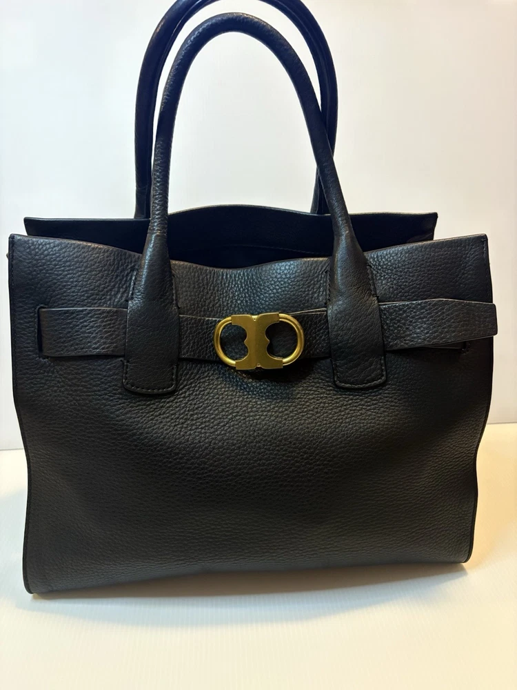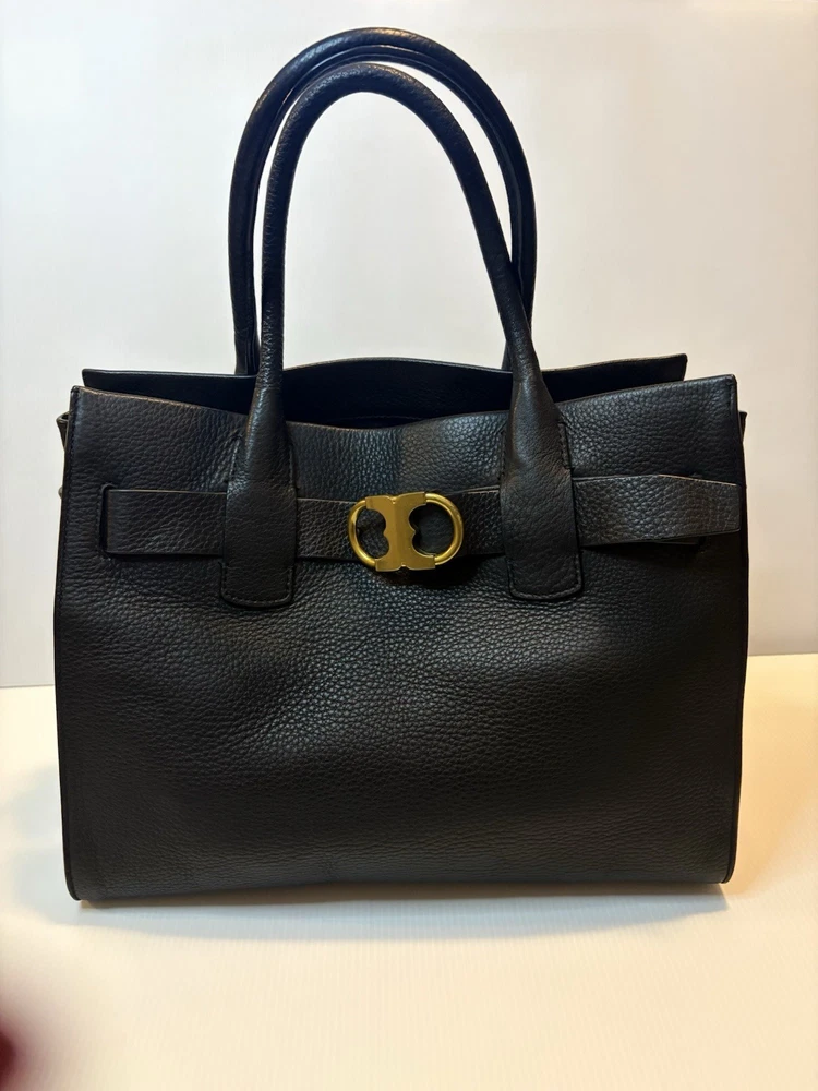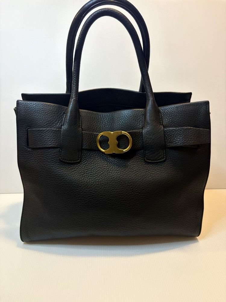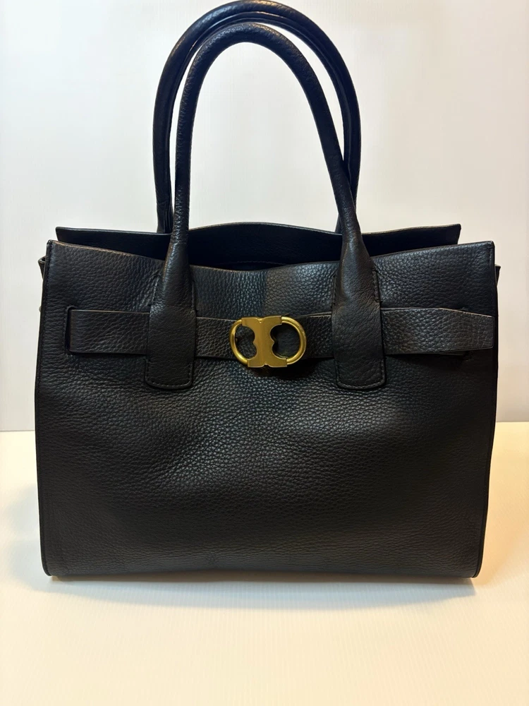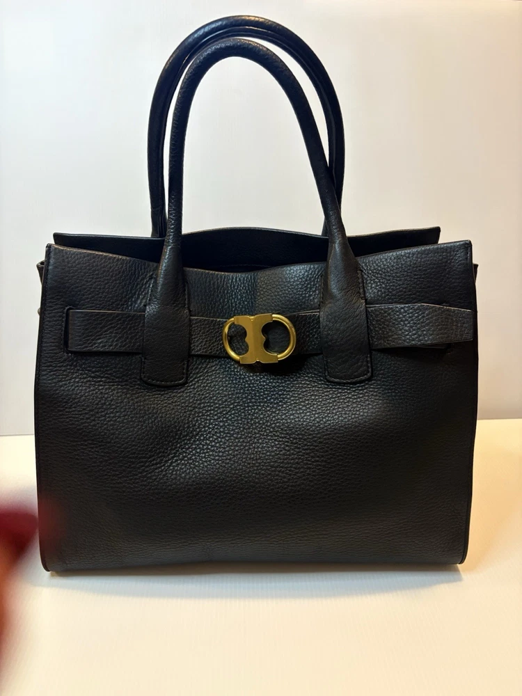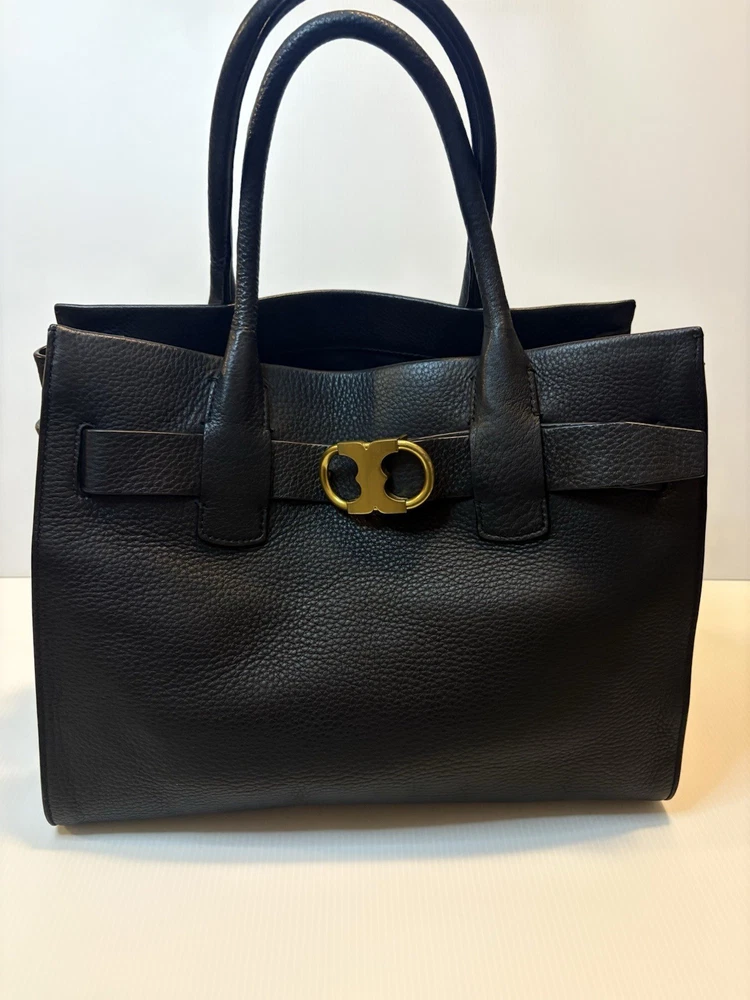 Brand: Tory Burch Style: Gemini Link Leather Tote Material: Supple pebbled leather Color: Black with gold-tone hardware Design: A framed, belted top with a Gemini link buckle. It has double rolled top handles and may have a detachable shoulder or crossbody strap. Storage: The interior may have a center zip compartment, slip pockets, and zip pockets. 13”Lx10”Hx6”D Double Handles with 7” Drop Large size 📦 Ships with care from a smoke-free environment. 💌 Questions welcome—your perfect holiday accessory 🫶Thank you for shopping at Karo’s NO LONG STRAP AVAILABLE!!!!!