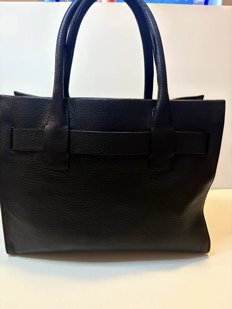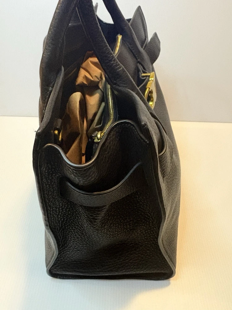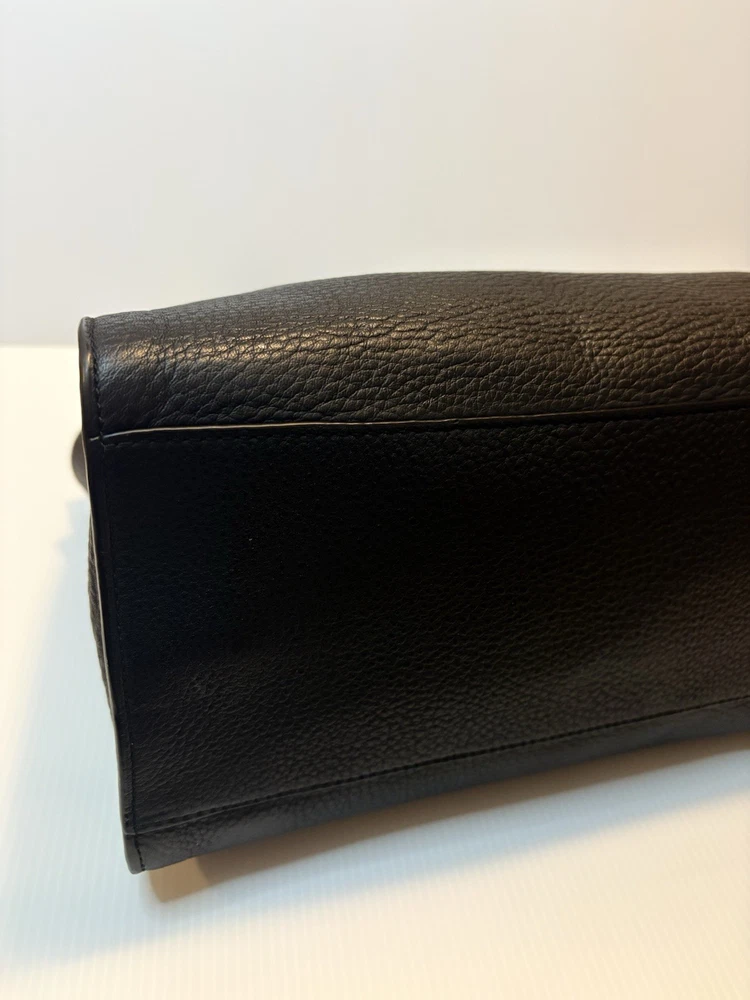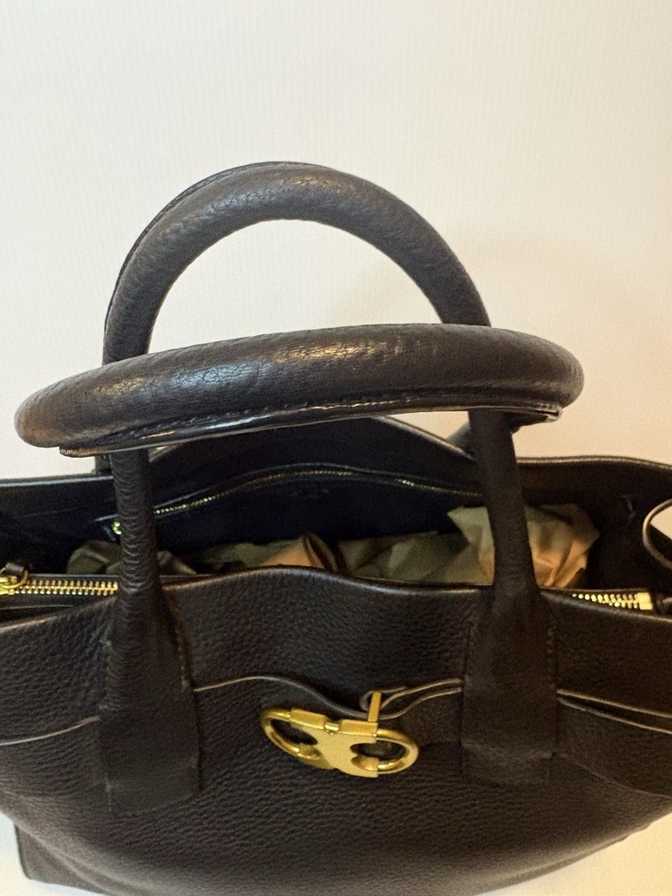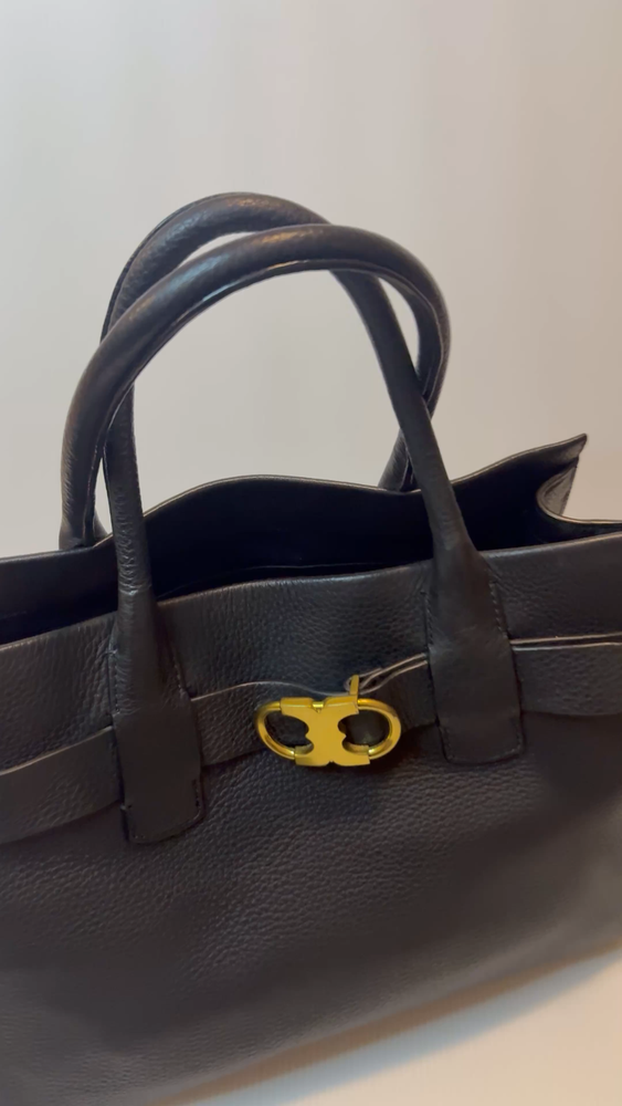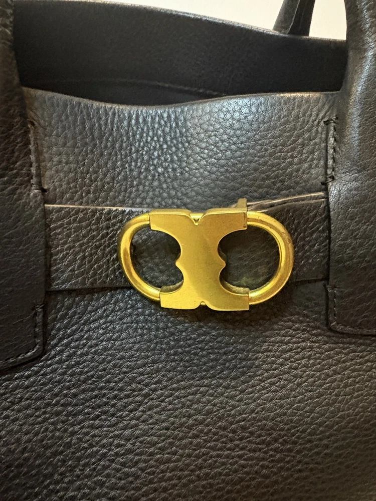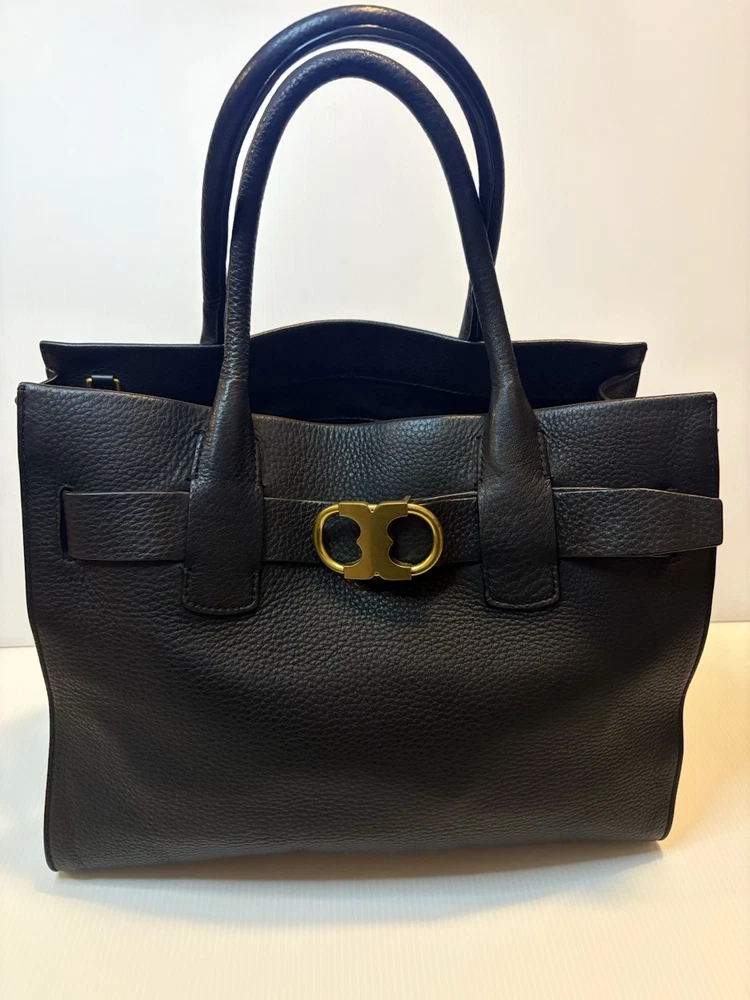 Brand: Tory Burch Style: Gemini Link Leather Tote Material: Supple pebbled leather Color: Black with gold-tone hardware Design: A framed, belted top with a Gemini link buckle. It has double rolled top handles and may have a detachable shoulder or crossbody strap. Storage: The interior may have a center zip compartment, slip pockets, and zip pockets. 13”Lx10”Hx6”D Double Handles with 7” Drop Large size 📦 Ships with care from a smoke-free environment. 💌 Questions welcome—your perfect holiday accessory 🫶Thank you for shopping at Karo’s NO LONG STRAP AVAILABLE!!!!!