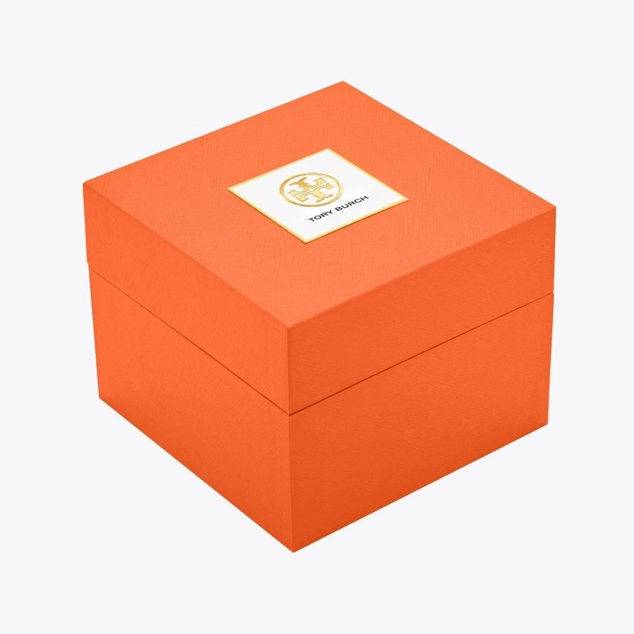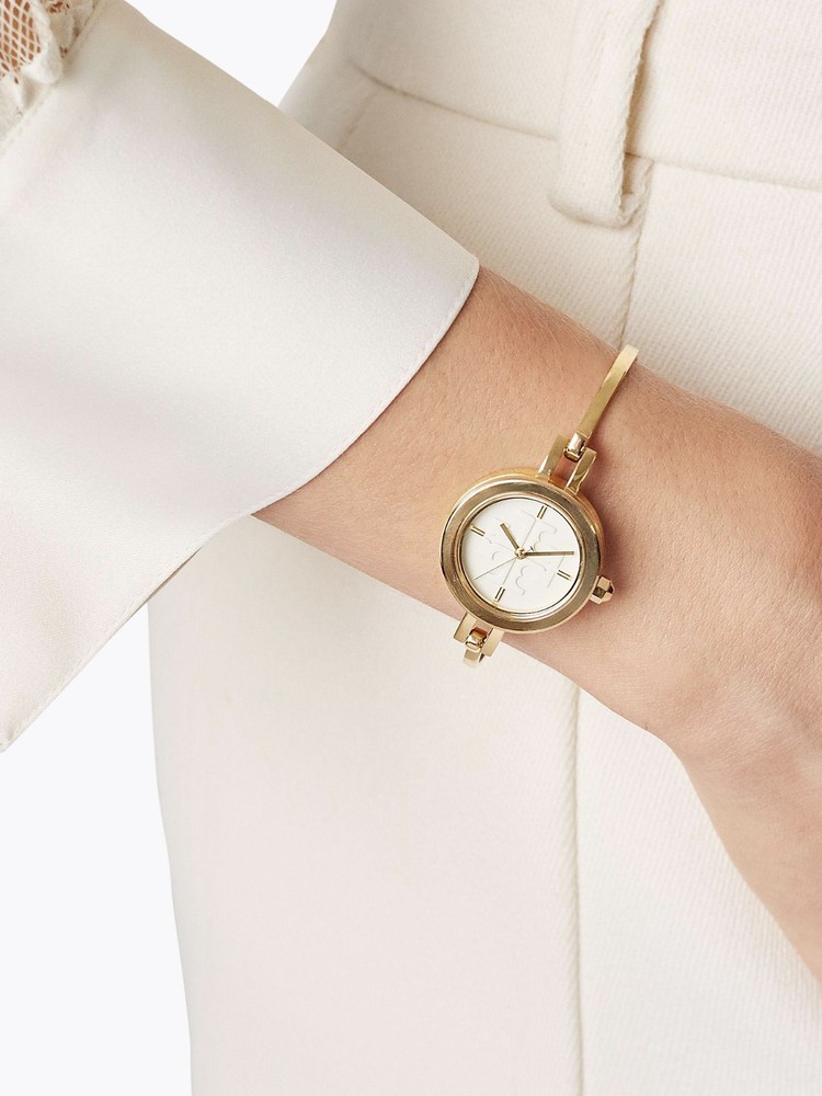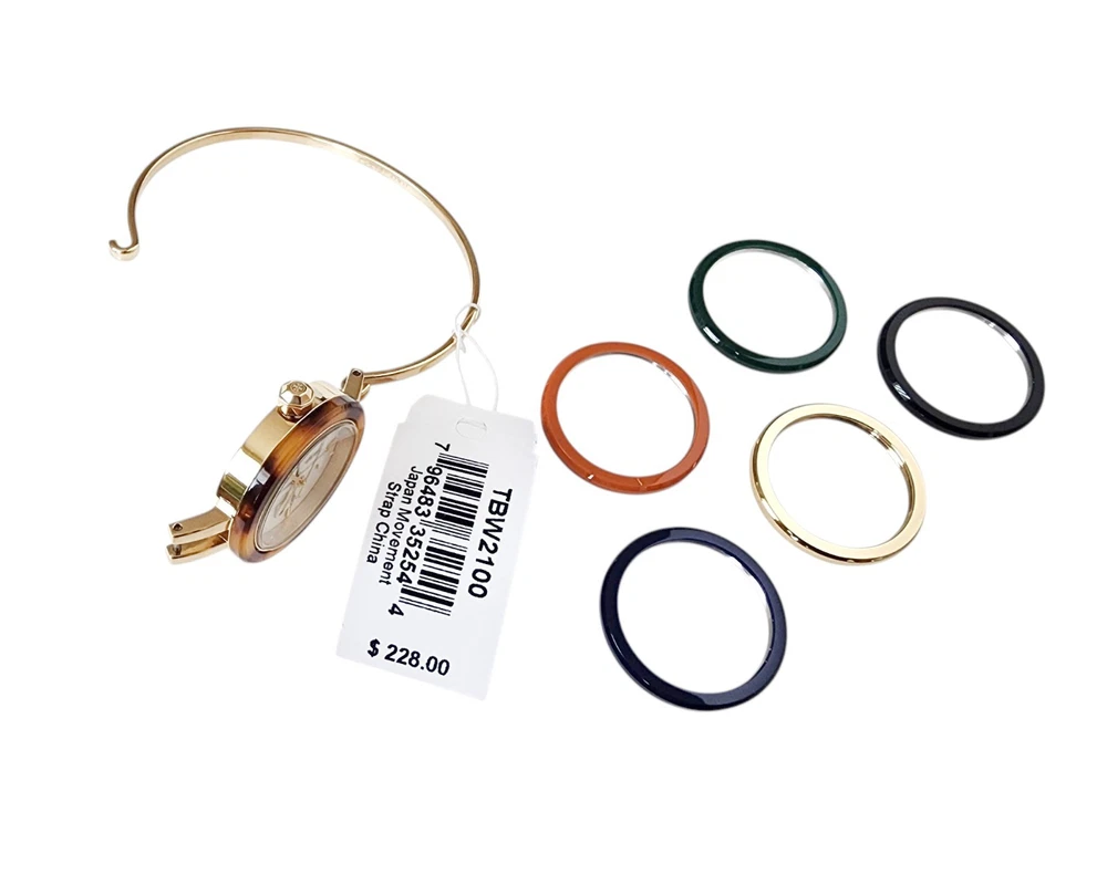 1 Details WATCH BRAND: Tory Burch COLLECTION: Gigi MODEL NUMBER: TBW2100 GENDER: Women MOVEMENT: Japan Quartz RETAIL/MSRP: $228 DIAL COLOR Ivory logo enamel finish SIZE: diameter: 21 mm (0.83") HANDS/MARKERS Gold tone stainless steel, polished finish BRACELET BANDS: 3 mm (0.11") width; gold tone stainless steel, polish finished slim bangle features a hook closure to keep the watch secure and comfortable around the wrist. LUG WIDTH: 3 mm (0.11") CLASP: Hook closure; Adjust-O-Matic closure FITS WRIST: Up to 16.5 cm (6.5") CASE MATERIAL: Gold Plated Stainless Steel; Polished Finish SIZE: 27 mm x 27 mm (1.06" x 1.06") excluding crown THICKNESS: 7.5 mm (0.3") BEZEL: 6 interchangeable top rings in gold hardware, black, green, navy, orange, and tortoise included. Twist anti-clockwise to loosen the top ring. ADDITIONAL INFORMATION FEATURES: Scratch-Resistant Sapphire Crystal with Anti-Reflective Coating.; Octagon-Shaped Crown FUNCTIONS : Hour, Minute WATER RESISTANCE: 30 meters/165 feet/3 ATM WARRANTY: 2 Year Factory International Warranty 100% brand new and authenticity guaranteed or your money back. Item comes with original Tory Burch presentation box, retail tag, instruction manual, and two year international warranty. Brand new with factory seals intact. All items are in stock ready to ship.
