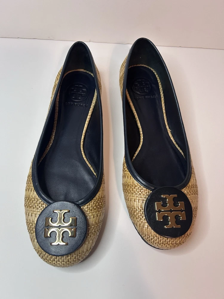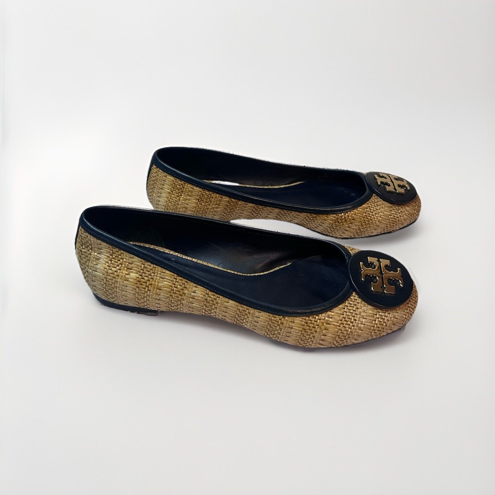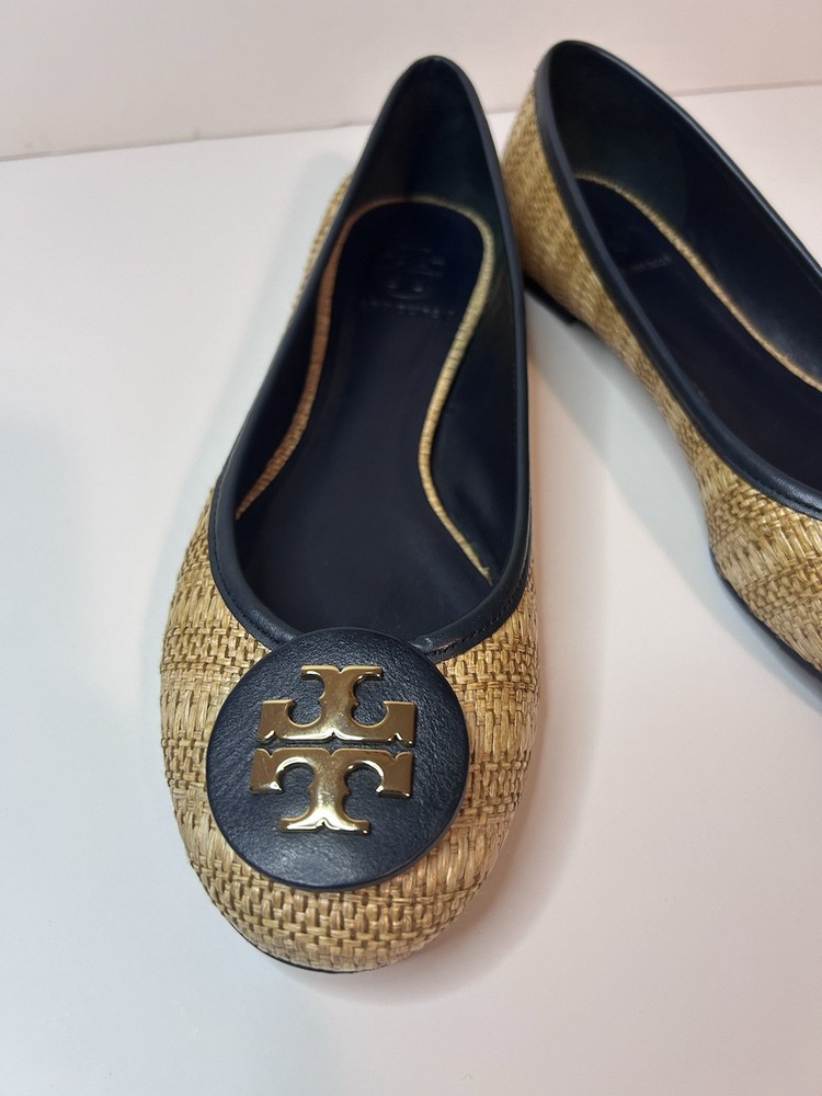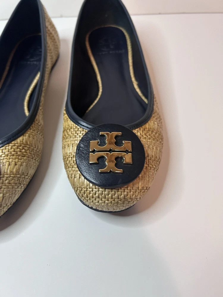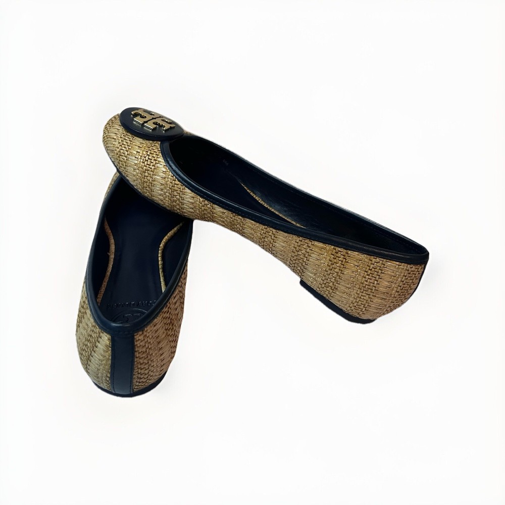 This is a pair of Tory Burch Reva ballet flats in size 8M. The shoes feature a round toe shape and a slip-on closure, with a blue leather upper accented with raffia detailing. They are lined with leather, cushioned, lightweight, and have a non-slip rubber outsole. The design includes the Tory Burch logo accents and a royal metal theme, making them suitable for various occasions such as travel, parties, work, and casual wear during the summer, fall, and spring seasons. Size 8 Blue Excellent condition Fits like size 8.5 M