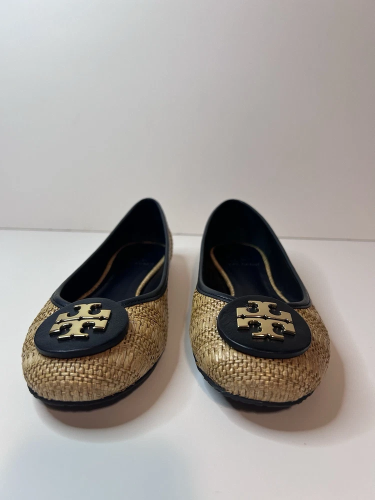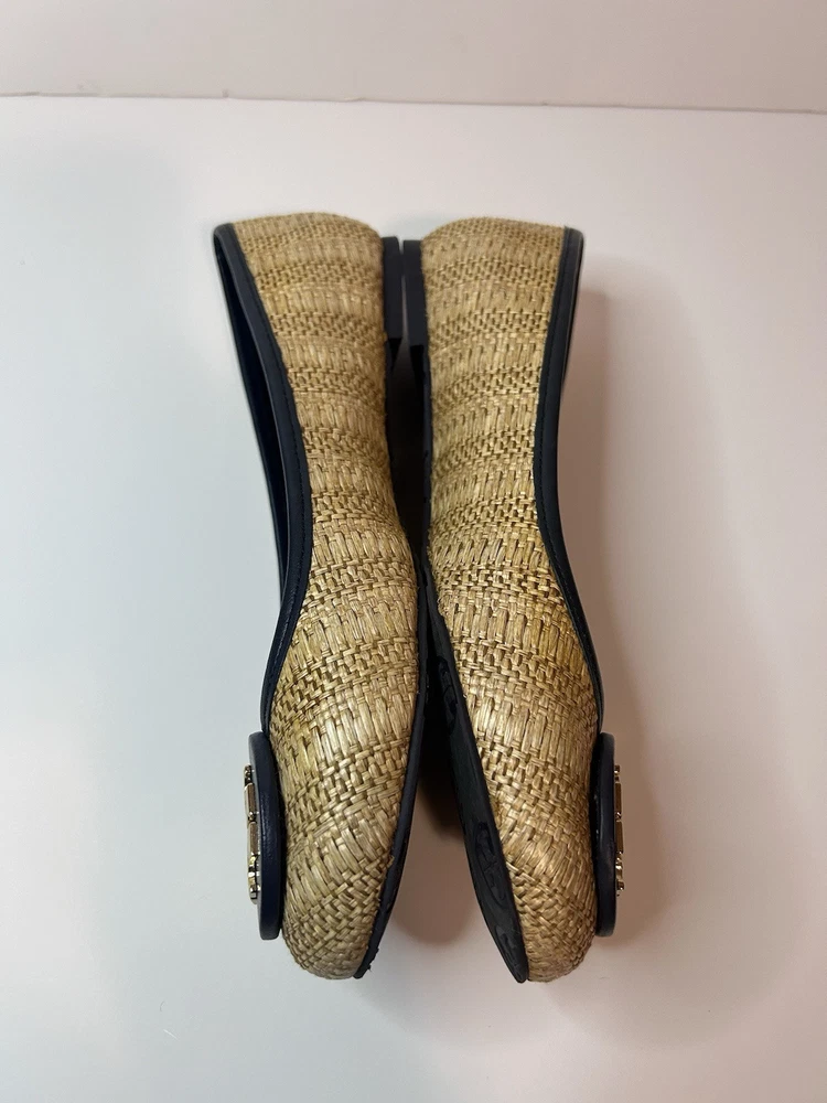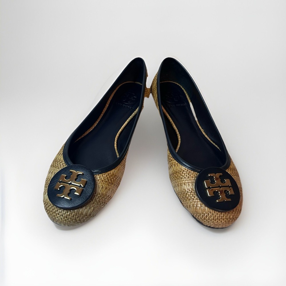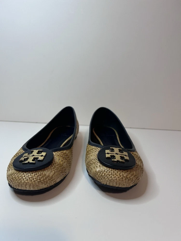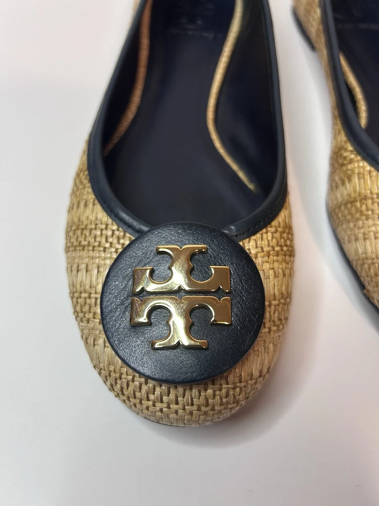This is a pair of Tory Burch Reva ballet flats in size 8M. The shoes feature a round toe shape and a slip-on closure, with a blue leather upper accented with raffia detailing. They are lined with leather, cushioned, lightweight, and have a non-slip rubber outsole. The design includes the Tory Burch logo accents and a royal metal theme, making them suitable for various occasions such as travel, parties, work, and casual wear during the summer, fall, and spring seasons. Size 8 Blue Excellent condition Fits like size 8.5 M