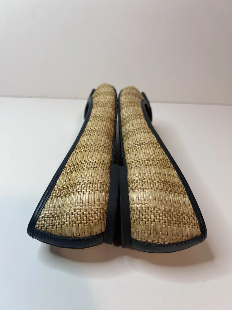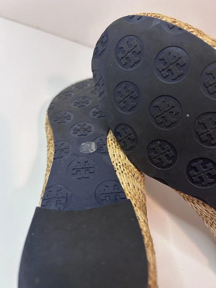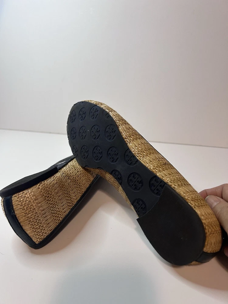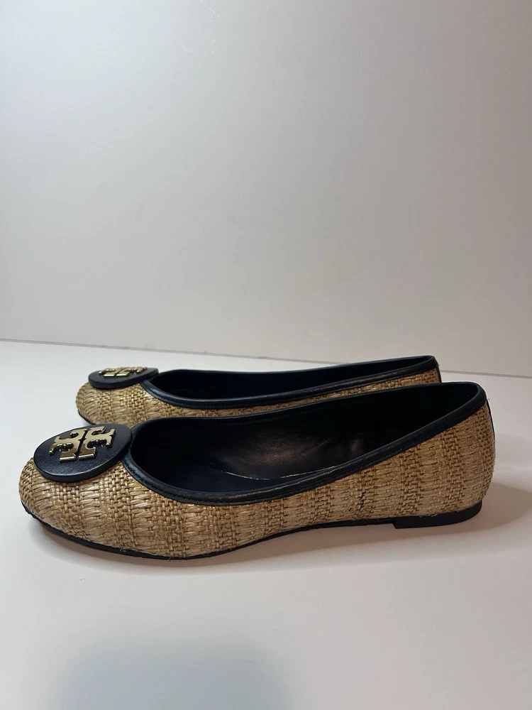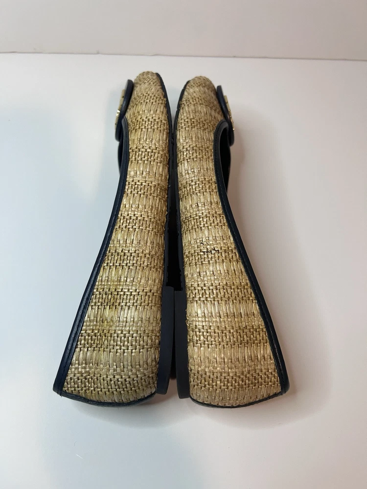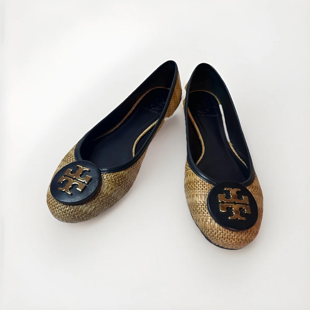 This is a pair of Tory Burch Reva ballet flats in size 8M. The shoes feature a round toe shape and a slip-on closure, with a blue leather upper accented with raffia detailing. They are lined with leather, cushioned, lightweight, and have a non-slip rubber outsole. The design includes the Tory Burch logo accents and a royal metal theme, making them suitable for various occasions such as travel, parties, work, and casual wear during the summer, fall, and spring seasons. Size 8 Blue Excellent condition Fits like size 8.5 M
