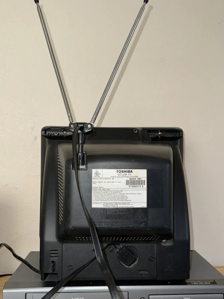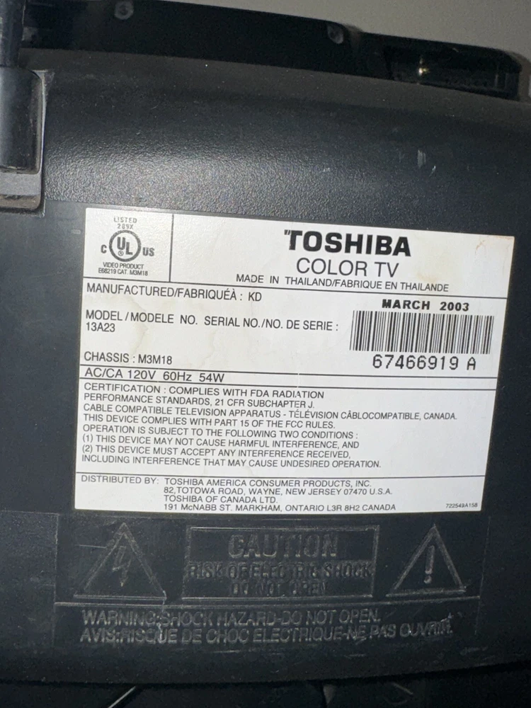 Experience classic gaming like never before with this Toshiba 13A23 CRT Retro Gaming Video Game TV. This 13-inch television is perfect for gamers who want to relive the glory days of gaming. With its vintage design and black color, it will make a great addition to any gaming collection. This TV has audio/video inputs for Coaxial F and Composite Video RCA, allowing you to connect your favorite gaming consoles and enjoy high-quality graphics. The Toshiba 13A23 was manufactured in Thailand in 2003, and it does not come with a remote. Get your hands on this rare gem and start gaming today! No remote including.