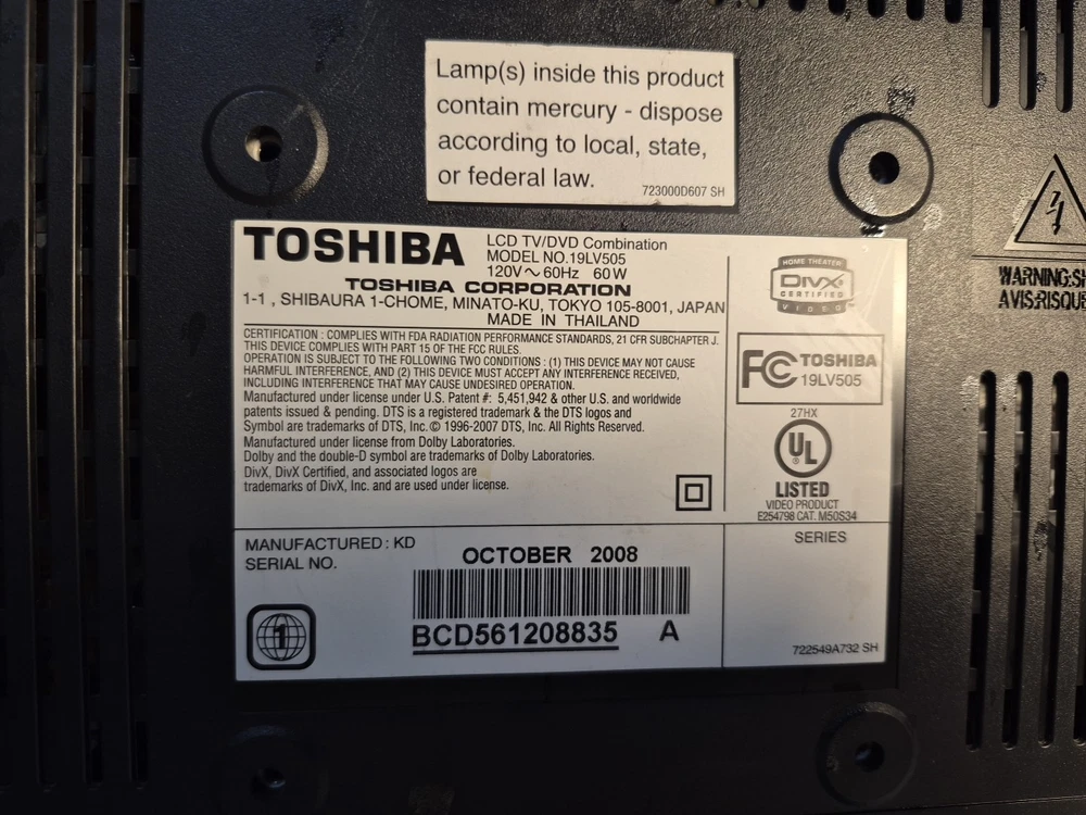 Toshiba 19LV505 19” Diagonal LCD TV/DVD Combo HDMI Gaming Television