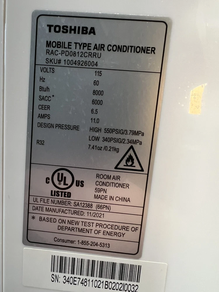 The Toshiba portable air conditioner has the cooling power you need to cool, dehumidify or circulate air up to 250 sq. ft. while removing up to 2.5 pints of moisture from the air each hour. You can control using the LCD remote control or the integrated electronic control panel and display. The unit also has a compact, light and modern design for quick and easy installation in most vertical or horizontal windows so you can move it around from room to room using the 4 integrated wheels. Intelligent features such as the 24-hour Timer, Sleep Mode and the automatic vent angle for better air distribution help you to personalize your comfort. You can cool, dehumidify or circulate the air in the space you need. *Perfect for a 150 to 250 square foot room* *Quick and Easy Installation* *Included easy to use Remote Control* *Cools, dehumidifies, and circulates air* *24 Hour Timer and Sleep Mode* *Louver Auto Swing* Specifications: Power Supply 115V Cooling Area- Up to 250 sq. ft. Plug Type- 5-15 P Control Type- Electronic Refrigerant- R-32 Color- White Capacity- 8000 BTU / 6000 SACC Rated Input- 1110 W Current- 11 Amps Product Dimensions (in) W*D*H- 18.39in x 15.63in x 30.12in Package Dimensions (in) W*D*H- 20.28in x 17.32in x 35.04in Net / Gross Weight- 59.15lbs / 68.83 lbs