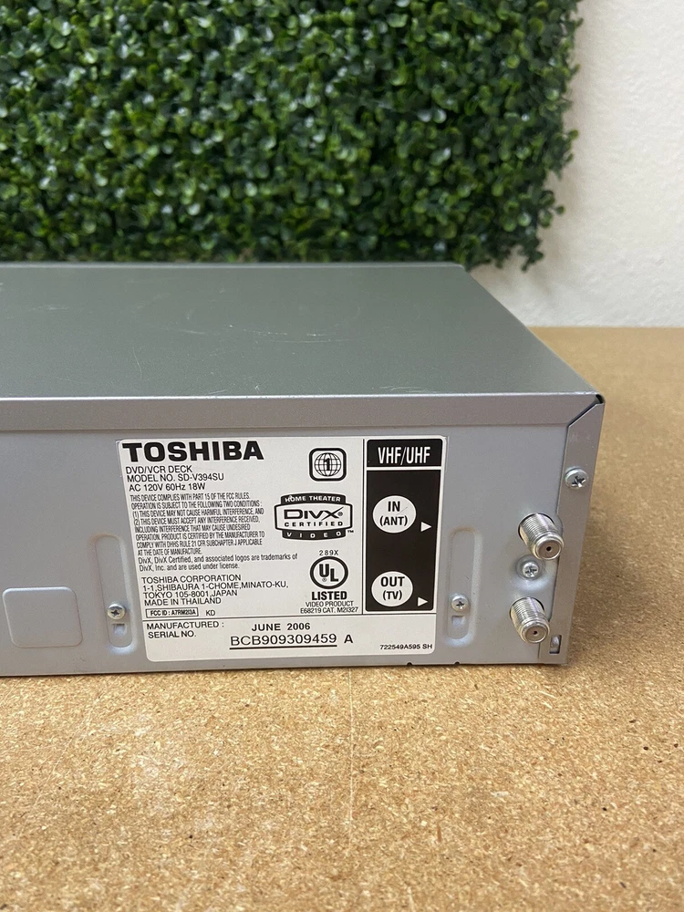 Connectivity:Digital Audio Coaxial RCACountry/Region of Manufacture:ThailandModel:Toshiba SD-V394SUManufacturer Warranty:NoneBrand:ToshibaType:VHS PlayerPlayable Media Format:DVDNumber of VCR Heads:4Color:SilverStorage Capacity:N/AFeatures:VCRYear Manufactured:2006Recordable Media Format:VHSRegion Code:DVD: 1