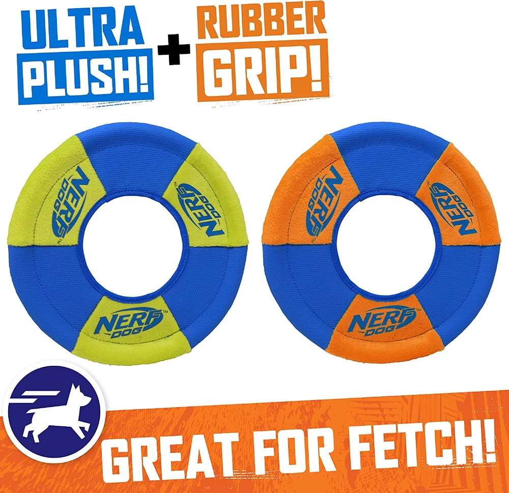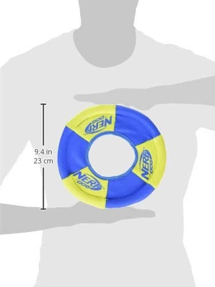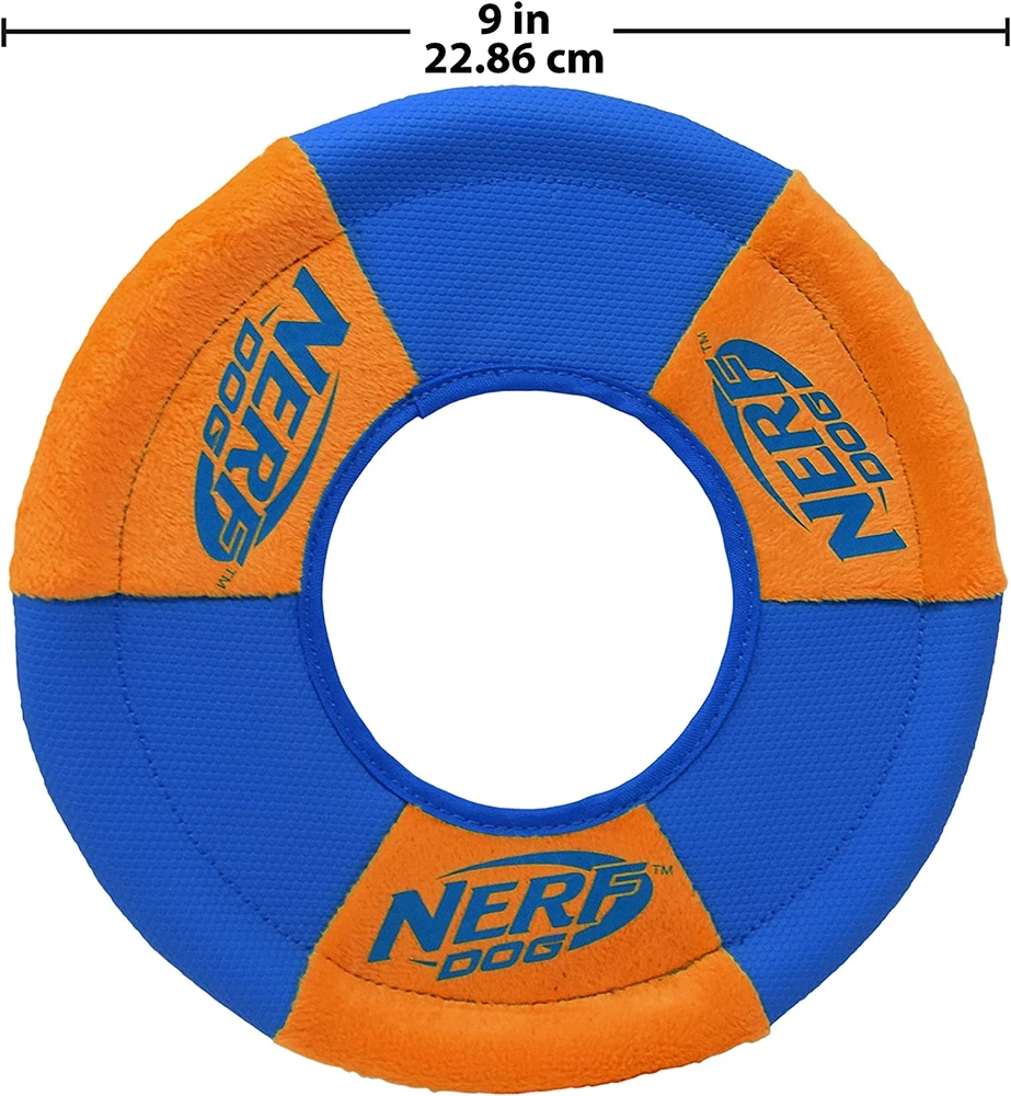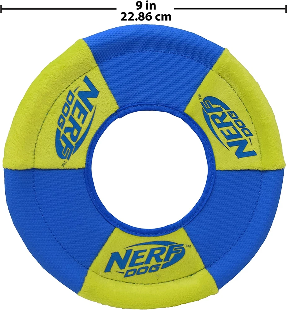 NERF-TOUGH: Nerf-quality materials make our Toss and Tug Ring Toy perfect for fetch and for teaching your dog new tricks TWO TOYS IN ONE: The tossable flyer shape paired with the durable tug body creates hours of interactive fun MADE TO LAST: Lightweight, durable, and weather & water resistant FOR MEDIUM AND LARGE BREEDS: With a 9 inch diameter, this flyer is ideal for medium and large breeds SAFETY FIRST: Designed with you dog's safety in mind, each of our dog toys are tested to ensure endless hours of family fun Get ready for high-flying action and non-stop fetch with this flyer! This disc floats in the water so you can bring it to the beach, lake, or pool for added fun. If you’re training your dog for dock diving, this adds a fun twist to training!