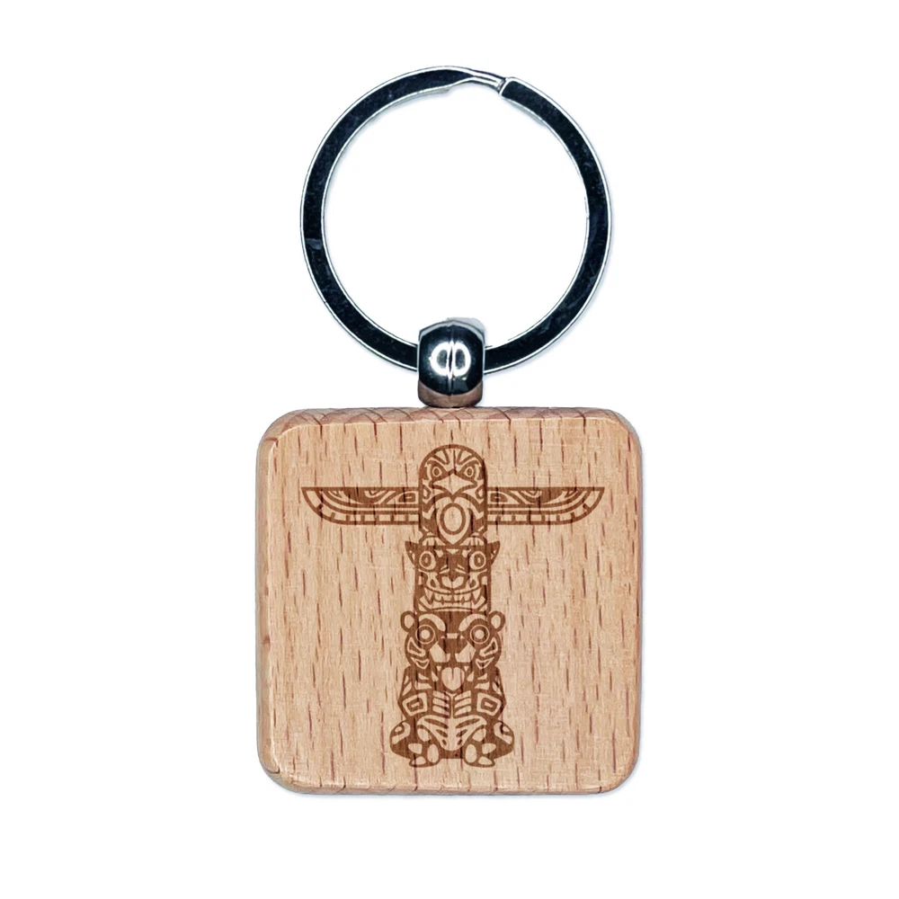 Totem Pole With Eagle Wolf and Bear Engraved Wood Square Keychain Tag Charm