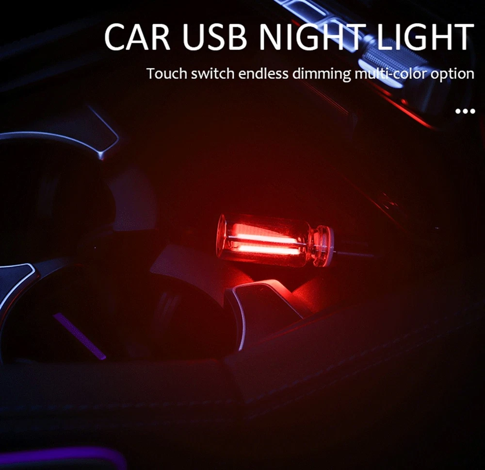 Features: USB & Glass Bottle Fusion Design: Elevate your car's ambiance with our innovative USB glass bottle night light, blending modern aesthetics with functionality. The transparent glass elegantly showcases the inner LED light bar, creating a mesmerizing glow. Its compact and portable size fits perfectly in cup holders or dashboards, adding a stylish touch to any vehicle interior. USB Plug-and-Play Installation: Designed for hassle-free setup, simply plug the light into your car’s USB port-no wiring or tools needed! The universal USB compatibility ensures instant illumination, making it ideal for quick upgrades. Perfect for those who want instant ambiance without complicated installations. Ambient Lighting: Transform your car into a cozy, romantic space with soft lighting. Whether it’ s a date night, road trip, or solo drive, the warm glow enhances the atmosphere, turning ordinary moments into memorable experiences. A must-have for creating vibes on the go! Gentle Light Glow:Featuring low-intensity, non-glare LEDs, this light provides just enough illumination to enhance visibility without distracting the driver. Beyond the car, it doubles as a bedside nightlight-perfect for bedrooms, dorm rooms, or cozy corners. Touch Control: Customize your lighting experience with intuitive touch controls. The dimmable feature lets you set the perfect mood, from subtle accent lighting to a brighter glow. Versatile and user-friendly for any setting! Specifications: Product name: Car USB Glass Bottle Night Light Material: Glass/LED Light/Metal Color: Blue/Red/Purple/Green/Pink/Yellow Product size: as shown Package includes: 1 x Car USB Night Light 1 x instruction manual