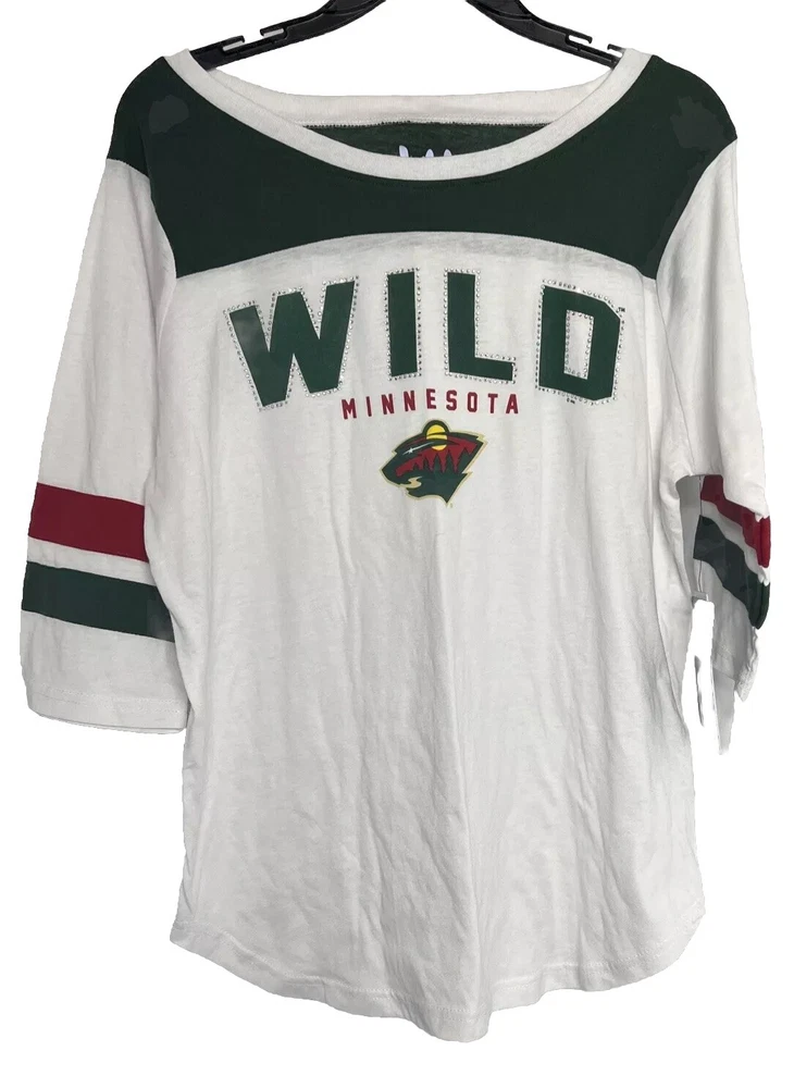 Support your favorite NHL team with this stylish Touch Alyssa Milano 3/4 Sleeve Hockey T-Shirt. This shirt features the Minnesota Wild team colors and logo on the front, making it a perfect addition to your fan apparel collection. The shirt is designed for women and comes in size L, making it comfortable to wear during game nights or any other occasion. The shirt is brand new with tags, making it a perfect gift for any Minnesota Wild fan. The shirt is made of high-quality materials that are sure to last for a long time. Add this shirt to your collection today and show off your love for your favorite NHL team. SKU: P 15