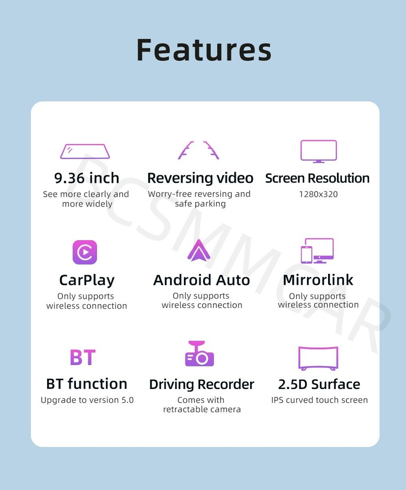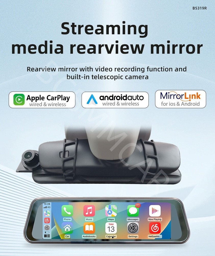 Product View Detail 9.36in 2.5D Rearview Mirror Driving Recorder Streaming Media Touch Screen Wireless Android Auto/CarPlay Mirrorlink Bluetooth FM Audio Car Multimedia Video Player Add our listing to Watchlist Or Add to Cart , you will get more discount Basic parameters Model : B5319R Type : Rearview mirror recorder (streaming media) System : Allwinner melis system Software solution : F133 Radio transmission frequency Preset frequency : 88.60, 89.50, 91.50, 93.00, 93.90, 95.10 Optional frequency range 87.5~108.0MHz Radio transmission IC : AB5301B Amplifier IC : CS8571E Output power : Built-in 1W speaker Working voltage : USB 5V Working temperature : -10~60℃ Bluetooth version : 5.0 version (default name: SWL-BT) CPU : F133 Running memory : 1Gbit DRAM Display resolution : 1280x320 Screen size : 9.36 inches 2.5D rearview mirror touch screen Installation size : 275x130MM Host depth : 35MM Function parameters Mobile phone interconnection Wireless mobile phone mirroring screen projection; Wireless Android AUTO; Wireless Apple CarPlay Reversing image : Support( Not included Rear camera ) Driving recorder : Support (built-in) Built-in speaker : Support TF card: Support driving record storage ( Not incluced TF card) Bluetooth audio switching : Support Four-way audio switching: AUX/BT/FM/SPK Audio output : Support Audio format : MP3/AAC/APE/OGG/M4A/RA/WAV Video format : H263/H264/H265/DIVX HD/AVI/FLV/MKV/MPEG/MP4/WMV9/VC/ASF/TS/QT Image format : JPEG/PNG/BMP/GIF/TIFF Language parameters:English, Chinese, Traditional Chinese, Spanish, Portuguese, Russian, German, French, Polish, Turkish, Arabic, Hebrew, Italian, Czech, Japanese, Korean, Greek, Dutch Recorder resolution : 720P Accessories 1. Host 2. Instruction manual 3. Cigarette lighter+mini USB power cord 4. Reverse video cable 5. AUX audio adapter cable 6. Rubber bandage x2 (accessories, instructions, packaging may be updated from time to time, subject to actual receipt) Basic functions 1. Radio frequency transmission function 2. Bluetooth function 3. Wireless mobile phone mirror projection; Wireless Android AUTO; Wireless Apple CarPlay 4. Reverse rearview function(not included rear camera ) 5. Driving recorder 6. Audio output optional (AUX/BT/FM/SPK) Shipping Policy Payment Method Returns Policy Shipping Policy Payment Method Returns Policy Copyright © 2017 DataCaciques Home Payment Shipping About us Contact us BCSMMCAR Store Categories Store Categories Other Product View Detail 9.36in 2.5D Rearview Mirror Driving Recorder Streaming Media Touch Screen Wireless Android Auto/CarPlay Mirrorlink Bluetooth FM Audio Car Multimedia Video Player Add our listing to Watchlist Or Add to Cart , you will get more discount Basic parameters Model : B5319R Type : Rearview mirror recorder (streaming media) System : Allwinner melis system Software solution : F133 Radio transmission frequency Preset frequency : 88.60, 89.50, 91.50, 93.00, 93.90, 95.10 Optional frequency range 87.5~108.0MHz Radio transmission IC : AB5301B Amplifier IC : CS8571E Output power : Built-in 1W speaker Working voltage : USB 5V Working temperature : -10~60℃ Bluetooth version : 5.0 version (default name: SWL-BT) CPU : F133 Running memory : 1Gbit DRAM Display resolution : 1280x320 Screen size : 9.36 inches 2.5D rearview mirror touch screen Installation size : 275x130MM Host depth : 35MM Function parameters Mobile phone interconnection Wireless mobile phone mirroring screen projection; Wireless Android AUTO; Wireless Apple CarPlay Reversing image : Support( Not included Rear camera ) Driving recorder : Support (built-in) Built-in speaker : Support TF card: Support driving record storage ( Not incluced TF card) Bluetooth audio switching : Support Four-way audio switching: AUX/BT/FM/SPK Audio output : Support Audio format : MP3/AAC/APE/OGG/M4A/RA/WAV Video format : H263/H264/H265/DIVX HD/AVI/FLV/MKV/MPEG/MP4/WMV9/VC/ASF/TS/QT Image format : JPEG/PNG/BMP/GIF/TIFF Language parameters:English, Chinese, Traditional Chinese, Spanish, Portuguese, Russian, German, French, Polish, Turkish, Arabic, Hebrew, Italian, Czech, Japanese, Korean, Greek, Dutch Recorder resolution : 720P Accessories 1. Host 2. Instruction manual 3. Cigarette lighter+mini USB power cord 4. Reverse video cable 5. AUX audio adapter cable 6. Rubber bandage x2 (accessories, instructions, packaging may be updated from time to time, subject to actual receipt) Basic functions 1. Radio frequency transmission function 2. Bluetooth function 3. Wireless mobile phone mirror projection; Wireless Android AUTO; Wireless Apple CarPlay 4. Reverse rearview function(not included rear camera ) 5. Driving recorder 6. Audio output optional (AUX/BT/FM/SPK) Shipping Policy Payment Method Returns Policy Contact US Shipping Policy All items will be checked before packing. All items are new and of high quality. Item will be shipped within 1 business days upon receipt of payment, excluding weekends and public holidays. If to USA,we will ship your order by USPS,it will take about 8-12 working days to you,and you can track it on line. If to other country,we will ship your order by China Post or Singapore Registered Air Mail,it will take about 14-21 working days to you,you aslo can track it on line. Delivery time is about 14-28 business days and it may take up to 8 weeks . Payment Method We accept payment by PayPal only ! Payment should be completed within 5 days after buyer places the order,or else an unpaid case will be opened in order to cancel the transaction. If you can not pay in time, please contact us. e-check from PayPal will only be processed once the payment clears. All of the items will be shipped to buyer's EBAY address,please confirm your address on Ebay before you buy.Your order will be usually shipped out the same or next business days once the payment is made and cleared. Returns Policy 30-day Warranty with Exchange for defective, malfunctioned, incorrect or parts-missing items. Please notify us and return the item with all parts and ac