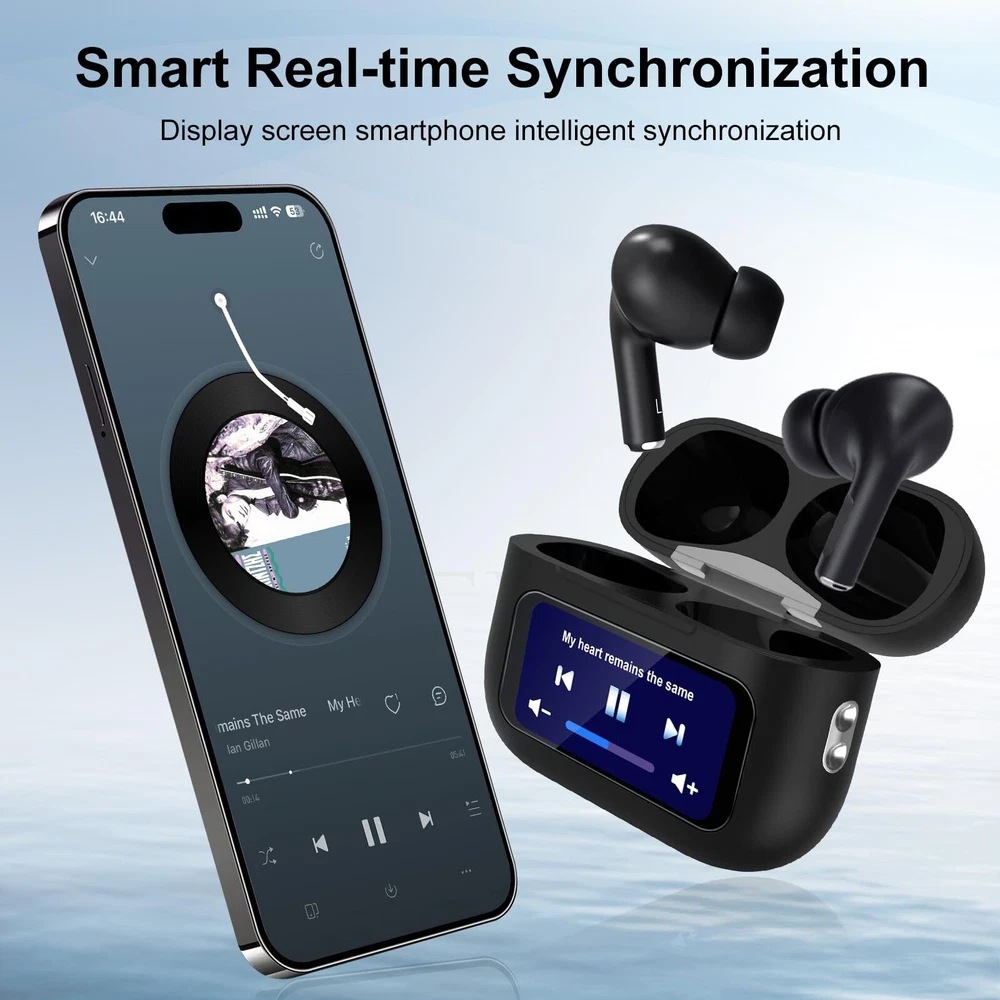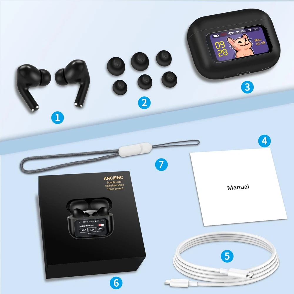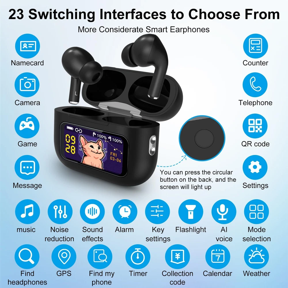【Attention】 When you use the earphones for the first time, they are turned off. You need to long press the button on the back to turn on. After that, pressing the button on the back will light up the screen 【Multifunctional Bluetooth Earphones】New design LED full-color touch screen earbuds, with a total of 23 switchable touch screen interfaces waiting for you to experience. Unlike previous wireless earbuds, you can freely complete operations and set the time on the earphone case; Music; Find headphones; Mode selection; AI Voice; Flashlight; Key settings ; Alarm ; Sound effects; Video control; Noise reduction; Telephone; Settings; Counter; Game; Calendar; Stopwatch; Timer ;; earbuds is synchronized with the in real-time. Make it easier and more convenient for you to operate, simplifying the frequency of switching between your and headphones. 【Noise Cancelling Wireless Earphones】 Using ANC+ENC technology, our earphones eliminate ambient sound to provide an interference free environment, ensuring a deep noise cancelling experience. The noise cancelling can be manually set to achieve an immersive listening experience 【Intelligent Touch Control and Sweat Prevention】 With the built-in intelligent touch control of the earphones, you can easily control functions such as music playback, volume adjustment, and calling. Choosing 's headphones has an IPX5 waterproof rating and provides sweat resistance. Wearing our headphones during exercise allows you to exercise 【High Quality Materials and Comfortable Wearing】 This in ear smart earphone is made of high-quality materials, with each earphone weighing only 0.12 ounces. The included earbuds are very comfortable, and the in ear design conforms to ergonomics, making it comfortable and fashionable to wear. Even if you wear the earphones all day, you won't feel uncomfortable 【Package Content】Our package includes a pair of 1x Bluetooth earphones, 3x replaceable earplugs, 1x Type-C data cable, 1 x Lanyard and 1x instruction manual