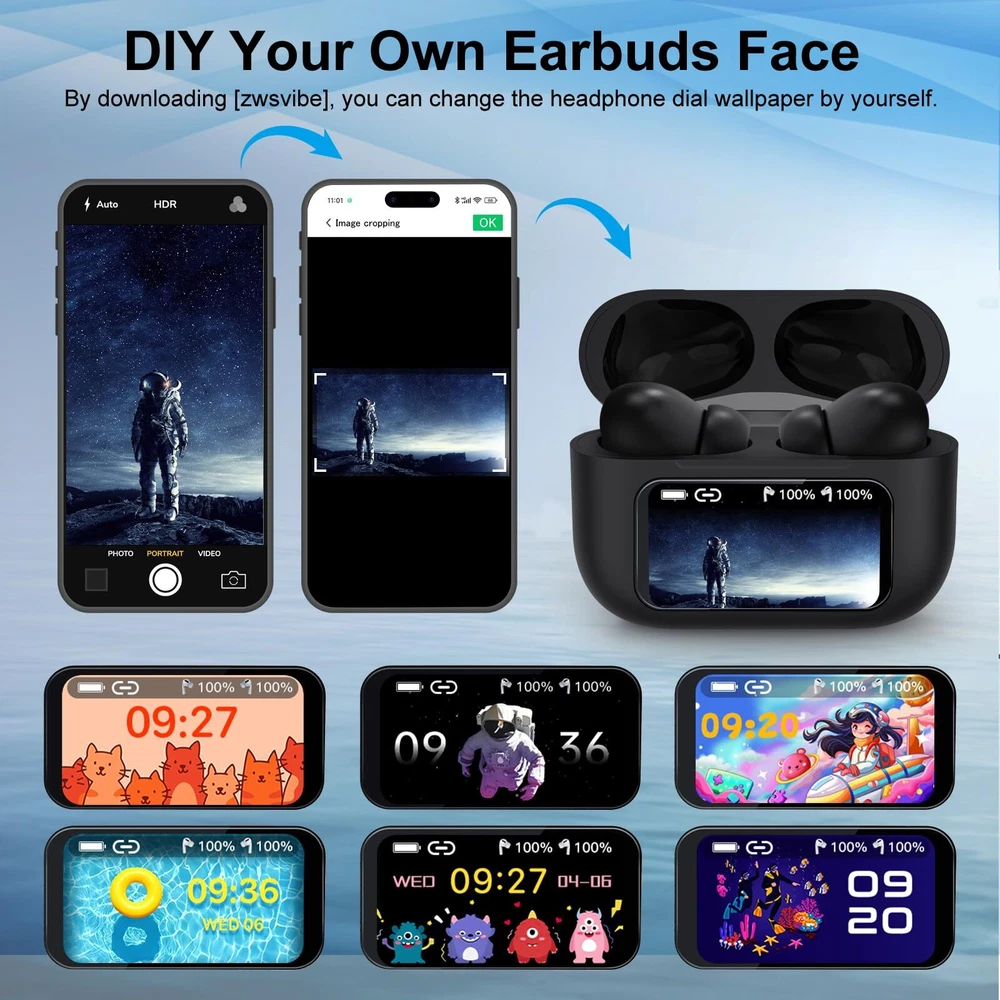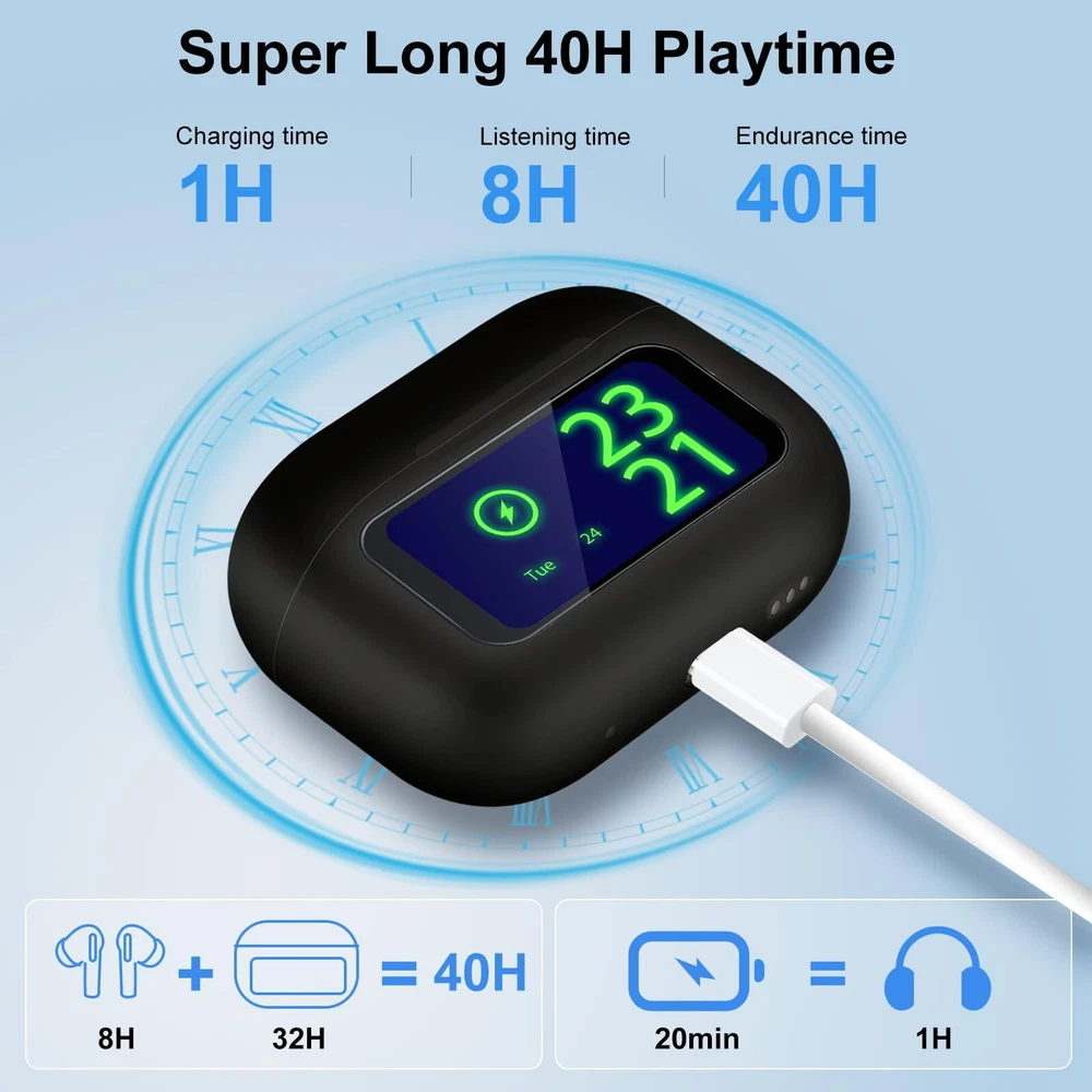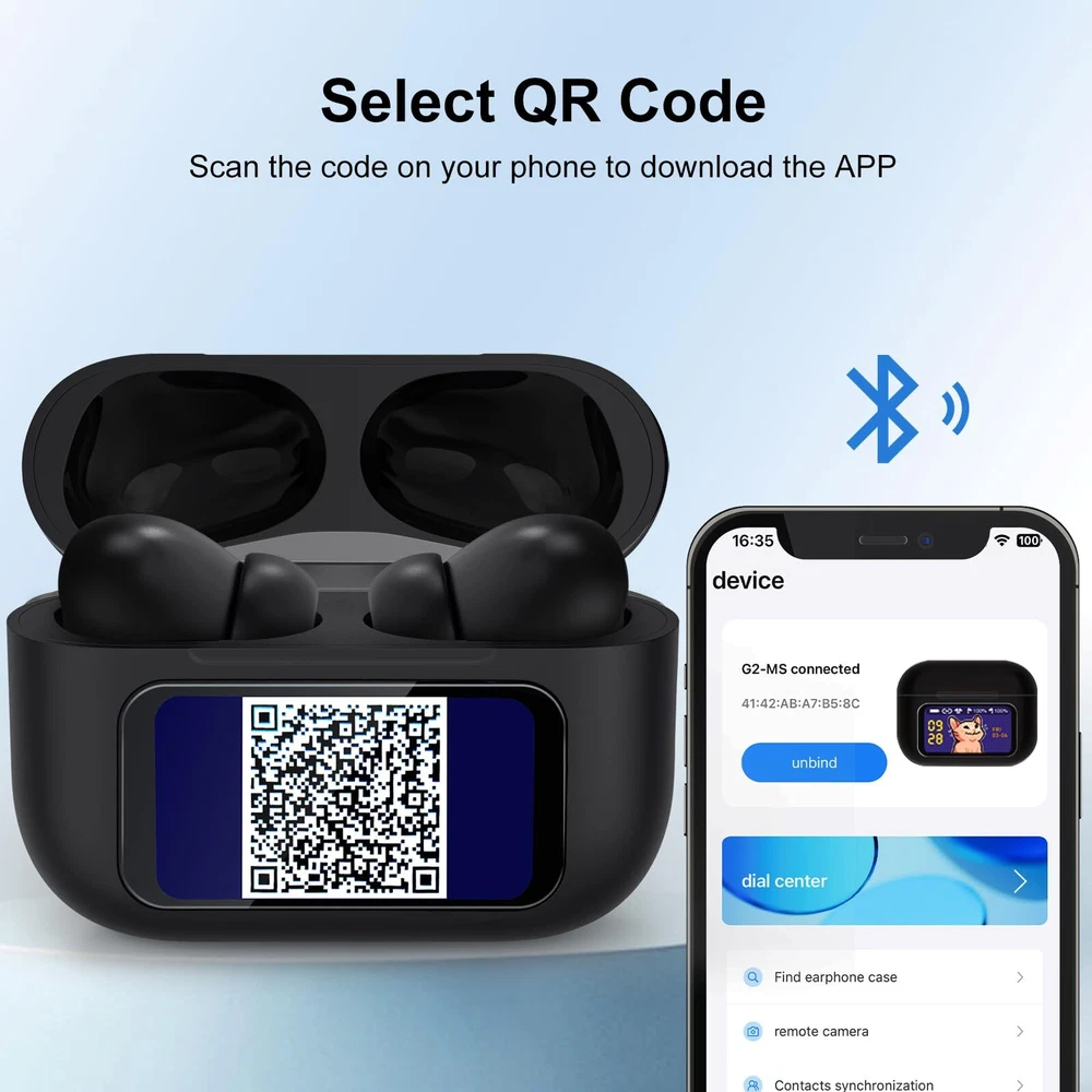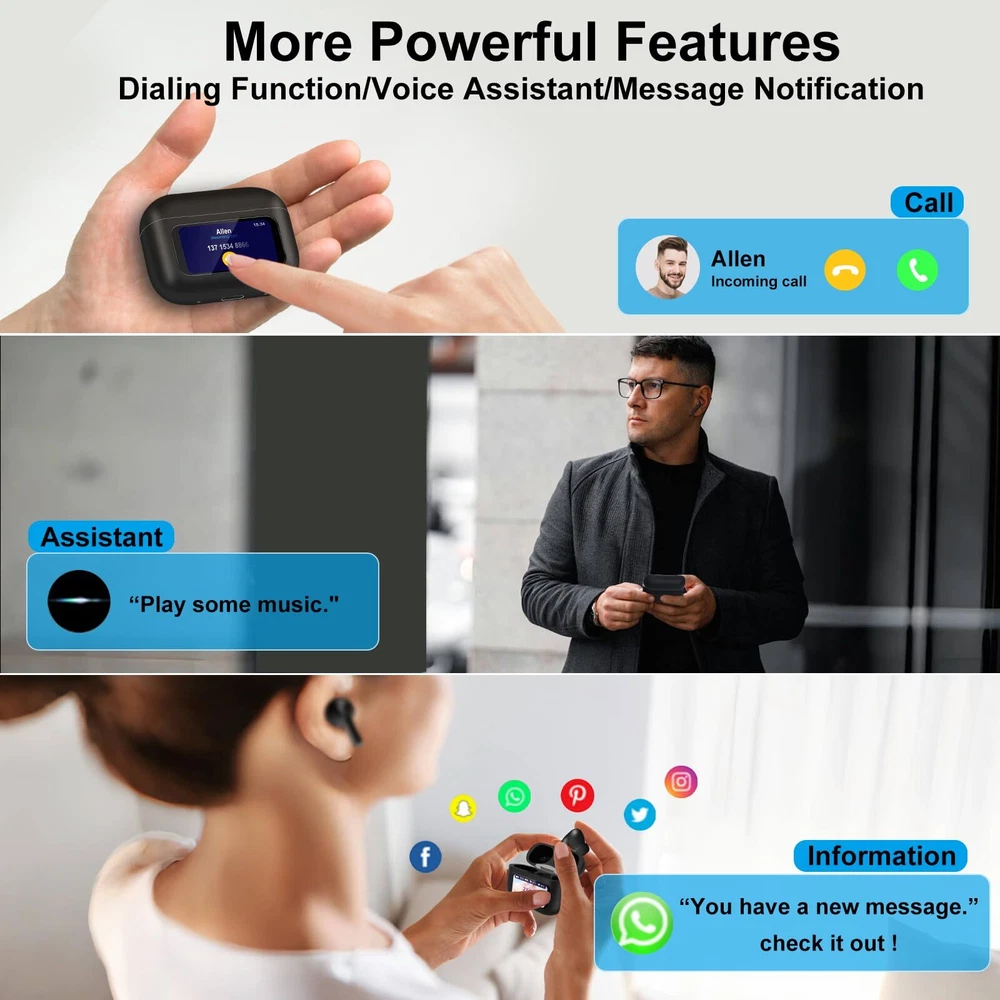 【Attention】 When you use the earphones for the first time, they are turned off. You need to long press the button on the back to turn on. After that, pressing the button on the back will light up the screen 【Multifunctional Bluetooth Earphones】New design LED full-color touch screen earbuds, with a total of 23 switchable touch screen interfaces waiting for you to experience. Unlike previous wireless earbuds, you can freely complete operations and set the time on the earphone case; Music; Find headphones; Mode selection; AI Voice; Flashlight; Key settings ; Alarm ; Sound effects; Video control; Noise reduction; Telephone; Settings; Counter; Game; Calendar; Stopwatch; Timer ;; earbuds is synchronized with the in real-time. Make it easier and more convenient for you to operate, simplifying the frequency of switching between your and headphones. 【Noise Cancelling Wireless Earphones】 Using ANC+ENC technology, our earphones eliminate ambient sound to provide an interference free environment, ensuring a deep noise cancelling experience. The noise cancelling can be manually set to achieve an immersive listening experience 【Intelligent Touch Control and Sweat Prevention】 With the built-in intelligent touch control of the earphones, you can easily control functions such as music playback, volume adjustment, and calling. Choosing 's headphones has an IPX5 waterproof rating and provides sweat resistance. Wearing our headphones during exercise allows you to exercise 【High Quality Materials and Comfortable Wearing】 This in ear smart earphone is made of high-quality materials, with each earphone weighing only 0.12 ounces. The included earbuds are very comfortable, and the in ear design conforms to ergonomics, making it comfortable and fashionable to wear. Even if you wear the earphones all day, you won't feel uncomfortable 【Package Content】Our package includes a pair of 1x Bluetooth earphones, 3x replaceable earplugs, 1x Type-C data cable, 1 x Lanyard and 1x instruction manual