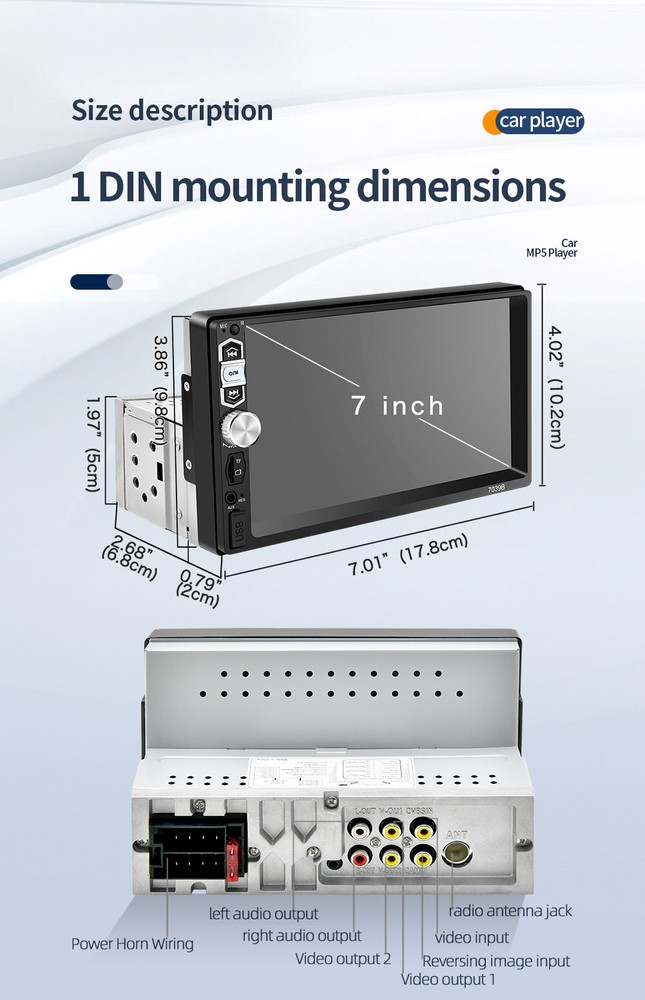 Store Categories Store Categories Other Details 1 Din Car Radio 7in Touch Screen Car MP5 Player For Wired Carplay&Android Auto FM Mirror Link Audio Stereo Multimedia Player Note:Please check Radio's size with car dashboard before buying !! Please note: This is a Wince radio that does not support WIFI&GPS Option: Wired Carplay&Android Auto Specifications: Packaging size: 22 * 12 * 13CM Screen size: 7 inches System: wince Interconnection: Wired Carplay Interconnection Wired Android Auto Interconnection Mobile Interconnection Video playback: RMVB/RM/FLV/3GP/MPEG/DIVX/XVID/DAT/VOB/AVI/MP4 Audio playback: DIS, MP3, WMA, ACC, OGG, WAV, RA, AC3, MP2, AMR, etc. Power amplifier chip: 7388 Mobile phone charging: supports USB mobile phone charging Bluetooth: support USB drive playback: supported TF card playback: supported AUX: Support Steering wheel control: supported Reverse view priority: supported Mobile internet: support USB interface: supported Features: ●Carplay: You can use the connection to Carplay, connect to your Apple phone, access phone contacts, emails, notifications, map navigation, music, videos, and other information, and achieve voice control. ●Android Auto, connected using a USB data cable. ●Screen: 7-inch high-definition video playback ●Image linkage: Supports Android/iPhone image linkage, which can be synchronized to the onboard screen through the original USB cable of the phone. It can support Apple version 13.4 and Android version 10.1. The above version may not support mobile phones, and the software needs to be upgraded after factory debugging ●Equipped with built-in Bluetooth function, can connect to mobile phones, make hands-free calls, make driving safer, and play Bluetooth music ● FM radio: can listen to real-time road conditions, news broadcasts, weather forecasts, and other 18 preset storage functions of the receiver ● Support steering wheel control function: use the car steering wheel to quickly switch the functions you want, making it more convenient ● Rear view camera input function (optional): The camera needs to be selected. If the car reversing camera is connected, the car audio will automatically turn to the rear view reversing details (optional) ●Seven color backlight settings: supports seven colors of backlight, you can choose from ●Decorate your car with your favorite colors in the settings menu ●The AUX audio input interface supports external MP3 players, mobile phones, music players, etc. ●Please note that the MP5 player does not support WIFI and GPS Package Included: 1x Host 1x Remote Control 1x Power Wire 1x Manual Shipping Policy Payment Method Returns Policy Shipping Policy Payment Method Returns Policy Copyright©2017 DataCaciques Home Payment Shipping About us Contact us Store Categories Store Categories Other Details 1 Din Car Radio 7in Touch Screen Car MP5 Player For Wired Carplay&Android Auto FM Mirror Link Audio Stereo Multimedia Player Note:Please check Radio's size with car dashboard before buying !! Please note: This is a Wince radio that does not support WIFI&GPS Option: Wired Carplay&Android Auto Specifications: Packaging size: 22 * 12 * 13CM Screen size: 7 inches System: wince Interconnection: Wired Carplay Interconnection Wired Android Auto Interconnection Mobile Interconnection Video playback: RMVB/RM/FLV/3GP/MPEG/DIVX/XVID/DAT/VOB/AVI/MP4 Audio playback: DIS, MP3, WMA, ACC, OGG, WAV, RA, AC3, MP2, AMR, etc. Power amplifier chip: 7388 Mobile phone charging: supports USB mobile phone charging Bluetooth: support USB drive playback: supported TF card playback: supported AUX: Support Steering wheel control: supported Reverse view priority: supported Mobile internet: support USB interface: supported Features: ●Carplay: You can use the connection to Carplay, connect to your Apple phone, access phone contacts, emails, notifications, map navigation, music, videos, and other information, and achieve voice control. ●Android Auto, connected using a USB data cable. ●Screen: 7-inch high-definition video playback ●Image linkage: Supports Android/iPhone image linkage, which can be synchronized to the onboard screen through the original USB cable of the phone. It can support Apple version 13.4 and Android version 10.1. The above version may not support mobile phones, and the software needs to be upgraded after factory debugging ●Equipped with built-in Bluetooth function, can connect to mobile phones, make hands-free calls, make driving safer, and play Bluetooth music ● FM radio: can listen to real-time road conditions, news broadcasts, weather forecasts, and other 18 preset storage functions of the receiver ● Support steering wheel control function: use the car steering wheel to quickly switch the functions you want, making it more convenient ● Rear view camera input function (optional): The camera needs to be selected. If the car reversing camera is connected, the car audio will automatically turn to the rear view reversing details (optional) ●Seven color backlight settings: supports seven colors of backlight, you can choose from ●Decorate your car with your favorite colors in the settings menu ●The AUX audio input interface supports external MP3 players, mobile phones, music players, etc. ●Please note that the MP5 player does not support WIFI and GPS Package Included: 1x Host 1x Remote Control 1x Power Wire 1x Manual Shipping Policy Payment Method Returns Policy Contact Us Shipping Policy All items will be checked before packing. All items are new and of high quality. Item will be shipped within 1 business days upon receipt of payment, excluding weekends and public holidays. If to USA,we will ship your order by USPS,it will take about 8-12 working days to you,and you can track it on line. If to other country,we will ship your order by China Post or Singapore Registered Air Mail,it will take about 14-21 working days to you,you aslo can track it on line. Delivery time is about 14-28 business days and it may
