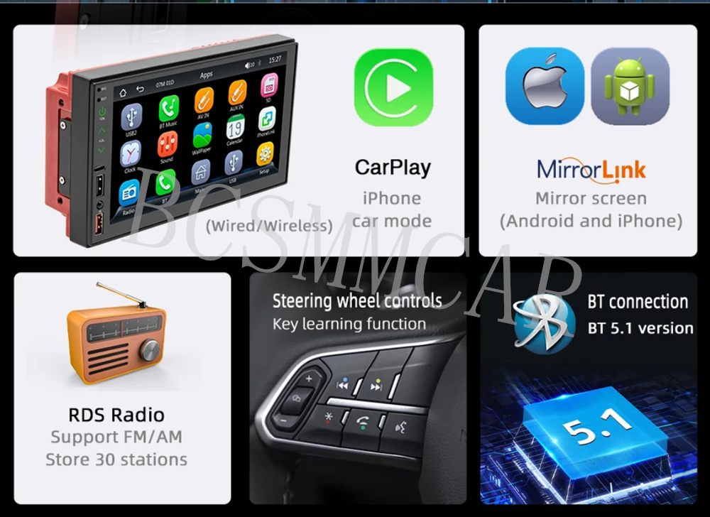 Product View Detail With 8LED Rear Camera 2 Din Car Radio For Apple CarPlay Wireless Android-Auto Bluetooth MP5 Multimedia Player Handsfree USB Audio System Head Unit Specification * 2 din CarPlay Radio head unit * 7 inch capacitive touch screen * 1024*600 resolution display screen * fit for Wireless Apple Carplay for iPhone * fit for Wireless Android Auto for Android phones * MP3/MP5 player * AM FM RDS receiver * Car radio Bluetooth functions * Bluetooth A2DP audio playback * Bluetooth handsfree calling * Bluetooth phonebook * Built-in microphone * USB charging port, type c charging port * Front and rear USB ports, support max 32GB (FAT32 format) * USB charging for phones when using CarPlay and Android Auto * Support rear camera input * Supports steering wheel control (universal analog type) * Support video input and output * 7 colors backlight * Screen brightness, contrast, hue, saturation adjustment * Audio EQ setting * Bass, treble, balance, fader, loudness, volume setting * OSD Languages: Chinese, English, Spanish, German, French, Italian, Japanese, Portuguese, Russian, Polish, Turkish, Hebrew, Korean, Czech, Arabic * 45W*4 output power * Remote control Shipping Policy Payment Method Returns Policy Shipping Policy Payment Method Returns Policy Copyright © 2017 DataCaciques Home Payment Shipping About us Contact us BCSMMCAR Store Categories Store Categories Other Product View Detail With 8LED Rear Camera 2 Din Car Radio For Apple CarPlay Wireless Android-Auto Bluetooth MP5 Multimedia Player Handsfree USB Audio System Head Unit Specification * 2 din CarPlay Radio head unit * 7 inch capacitive touch screen * 1024*600 resolution display screen * fit for Wireless Apple Carplay for iPhone * fit for Wireless Android Auto for Android phones * MP3/MP5 player * AM FM RDS receiver * Car radio Bluetooth functions * Bluetooth A2DP audio playback * Bluetooth handsfree calling * Bluetooth phonebook * Built-in microphone * USB charging port, type c charging port * Front and rear USB ports, support max 32GB (FAT32 format) * USB charging for phones when using CarPlay and Android Auto * Support rear camera input * Supports steering wheel control (universal analog type) * Support video input and output * 7 colors backlight * Screen brightness, contrast, hue, saturation adjustment * Audio EQ setting * Bass, treble, balance, fader, loudness, volume setting * OSD Languages: Chinese, English, Spanish, German, French, Italian, Japanese, Portuguese, Russian, Polish, Turkish, Hebrew, Korean, Czech, Arabic * 45W*4 output power * Remote control Shipping Policy Payment Method Returns Policy Contact US Shipping Policy All items will be checked before packing. All items are new and of high quality. Item will be shipped within 1 business days upon receipt of payment, excluding weekends and public holidays. If to USA,we will ship your order by USPS,it will take about 8-12 working days to you,and you can track it on line. If to other country,we will ship your order by China Post or Singapore Registered Air Mail,it will take about 14-21 working days to you,you aslo can track it on line. Delivery time is about 14-28 business days and it may take up to 8 weeks . Payment Method We accept payment by PayPal only ! Payment should be completed within 5 days after buyer places the order,or else an unpaid case will be opened in order to cancel the transaction. If you can not pay in time, please contact us. e-check from PayPal will only be processed once the payment clears. All of the items will be shipped to buyer's EBAY address,please confirm your address on Ebay before you buy.Your order will be usually shipped out the same or next business days once the payment is made and cleared. Returns Policy 30-day Warranty with Exchange for defective, malfunctioned, incorrect or parts-missing items. Please notify us and return the item with all parts and accessories packed and marked "FOR EXCHANGE" within 14 days of receipt. If defective, malfunctioned or parts-missing items are no longer available, a refund may be issued. All returning postage costs will be the responsibility of the buyers under all circumstances. Contact US If you encounter any problems about anything, please feel free to contact us and we will do our best to assist you solve the issue. If you are not satisfied in anyway, please feel free to let us know and give us a second chance to correct it before you decide to leave any neutral or negative feedback. Please contact us through eBay link if you have any questions. We will reply you within 24- 48 hours. Please check you spam mail if no response for 48 hours. Home Payment Shipping About us Contact us