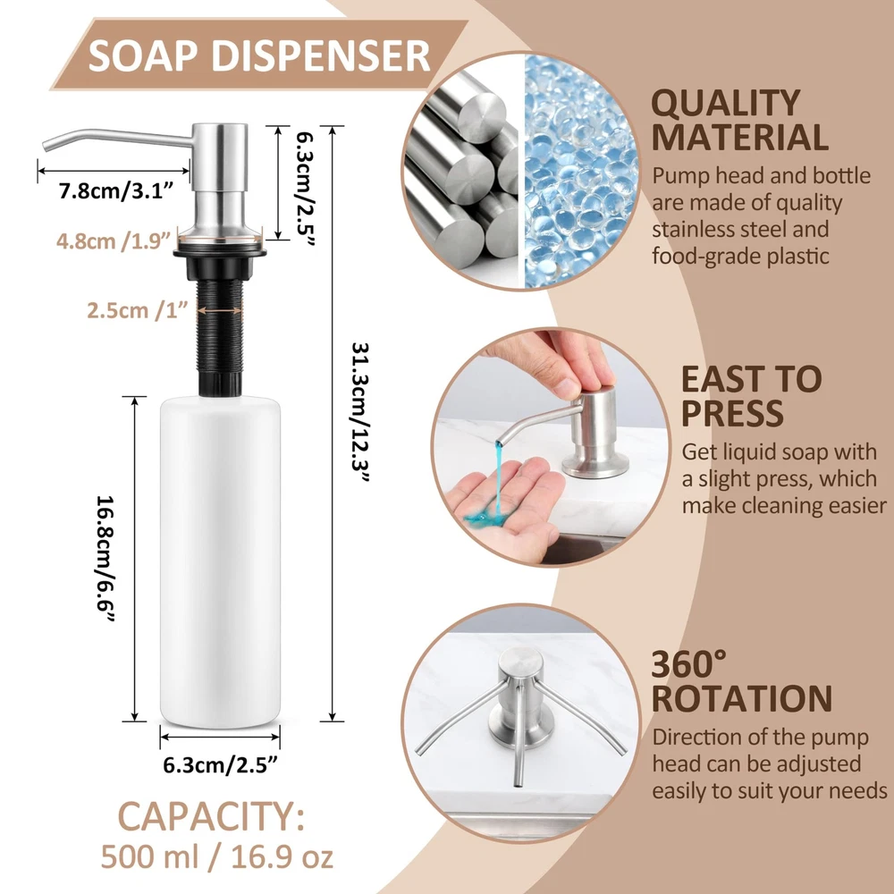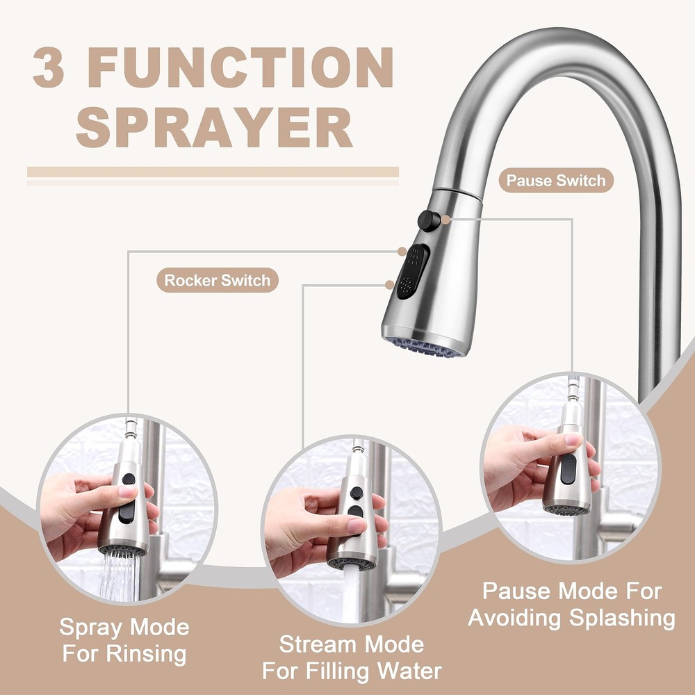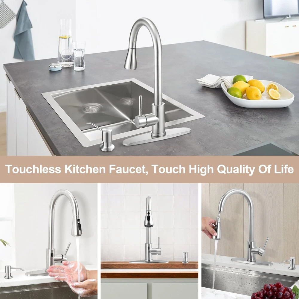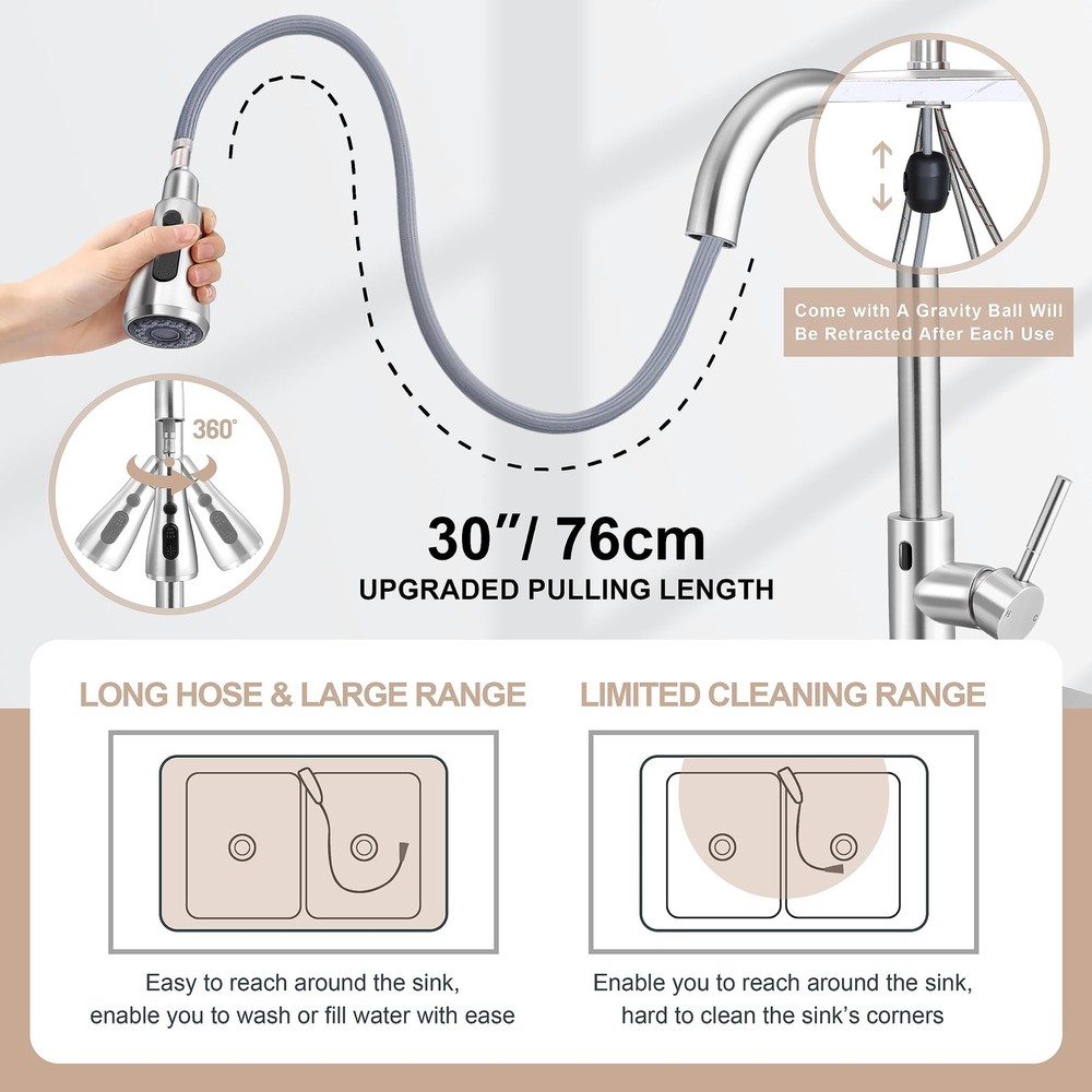 The touchless kitchen sink faucet is made of durable and healthy materials in different parts. · Main body: Lead-free 18/10 stainless steel, 5-layer Nano technology · Inner hose: Food-grade PEX The former enable the kitchen faucet to resist rust and corrosion, and to be durable enough for long time use, the latter ensure water sanitation and safety. Touchless technology is the most important function of a touchless sink faucet. · Features: Smart motion infrared sensor, 1” sensing distance, quick response, shut off automatically after 3 minutes · Directions: 1. Turn on the handle 2. Wave to activate 3. Enjoy the convenience This function can provide you with hands-free convenience. The water faucet is equipped with a 3 function sprayer that are designed for different usage scenarios, you can press the buttons to switch different modes. · Spray mode: Rinsing · Stream mode: Filling water · Pause mode: Avoiding splashing These functions can assist you in better doing kitchen work easily. Pull down design also plays an important part in kitchen faucets as it can provide you with large cleaning range. · Pulling length: 30 inches · Faucet swivel range: 360° · Spray head rotation range: 360° Together they enable you to reach around the whole sink and make your cleaning easier and more thorough. After pulling down the sprayer, a gravity ball on the hose will help retract the sprayer. There are more user-friendly designs goes with the touchless kitchen faucet. · High precision ceramic cartridge: Avoid water leakage · Soap dispenser: Easy and convenient to press and get liquid soap for cleaning · Setup toolkit, pre-installed water inlet pipes and pull down hose: Make it easy for you to install the kitchen faucet · Deck plate: Enable you to install the faucet on 1 or 3 hole sinks Healthy and durable material, main body of the kitchen faucet is made of high-quality lead-free 18/10 stainless steel, processed with 5-layer Nano technology, water use of 1.7 gpm/min, resist rust and provide longer durability, inner hose is made of food-grade PEX, ensure water sanitation and safety Touchless technology, the kitchen sink faucet comes with a motion infrared sensor, 1” sensing distance and quick response, wave your hand to activate when the handle is on, wave again to shut off or wait to shut off automatically after 3 min, provide hands-free convenience 3 Function Sprayer, 3 functions are designed for different usage scenarios, press the buttons to switch different modes, spray mode for rinsing, stream mode for filling water, pause mode for avoiding splashing, the sink faucet can assist you in better doing kitchen work easily Large cleaning range, the water faucet has 30” upgraded pulling length, 360° swivel design and 360° rotation spray head, enable you to reach around the whole sink, make your cleaning much easier and more thorough, gravity ball can help retract the spray head after every use User-friendly design, come with quality soap dispenser assisting you in washing, high precision ceramic cartridge prevents water leakage, deck plate and setup toolkit, pre-installed water inlet pipes and pull down hose make it easy for you to install the faucet on 1 or 3 hole sink