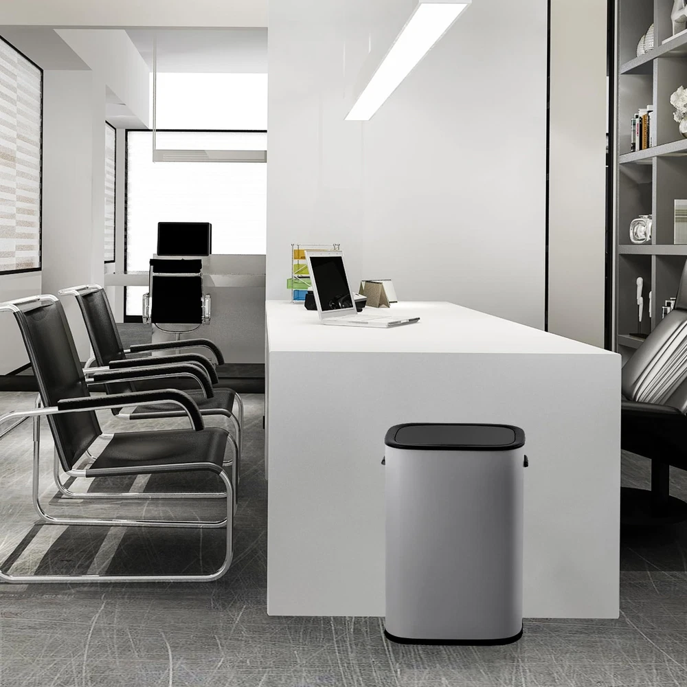 Touchless Trash Can 14.5 Gallon/55 L, Stainless Steel Kitchen Garbage Can, Automatic Sensor Rectangle Garbage Bin with Odor-Absorbing Mute Lid for Kitchen, Bedroom, Bathroom 14.5 GALLON TRASH CAN: The stainless steel trash can has 14.5 gallon/55 L large storage capacity for daily use. Take fewer trips taking out the trash! Rectangular body is more suitable for narrow space. TOUCHLESS TRASH CAN: This automatic trash can equipped with motion sensor inside, just wave your hands above the infrared motion sensor field, the lid will automatically open. The motion sensor trash can will automatically close after 5 seconds. Completely hands-free. QUIET CLOSE TRASH CAN: This large garbage can lid is silent and slow to close, ultra quiet without any noise, suitable for home use. Battery-powered design, no need to plug in, you can move around at will. ANTI-RUST & NO FINGER PRINT: The high-quality grey coating surface increases the aesthetics of the trash can, and it will not rust for a long time. The surface of the garbage can is specially treated to have anti-fingerprint function. PERFECT FOR DIFFERENT SPACES: The trash can is airtight and odorless when closed, enough to fit anywhere, as kitchen trash can, bathroom trash can, office trash can, bedroom trash can, etc.