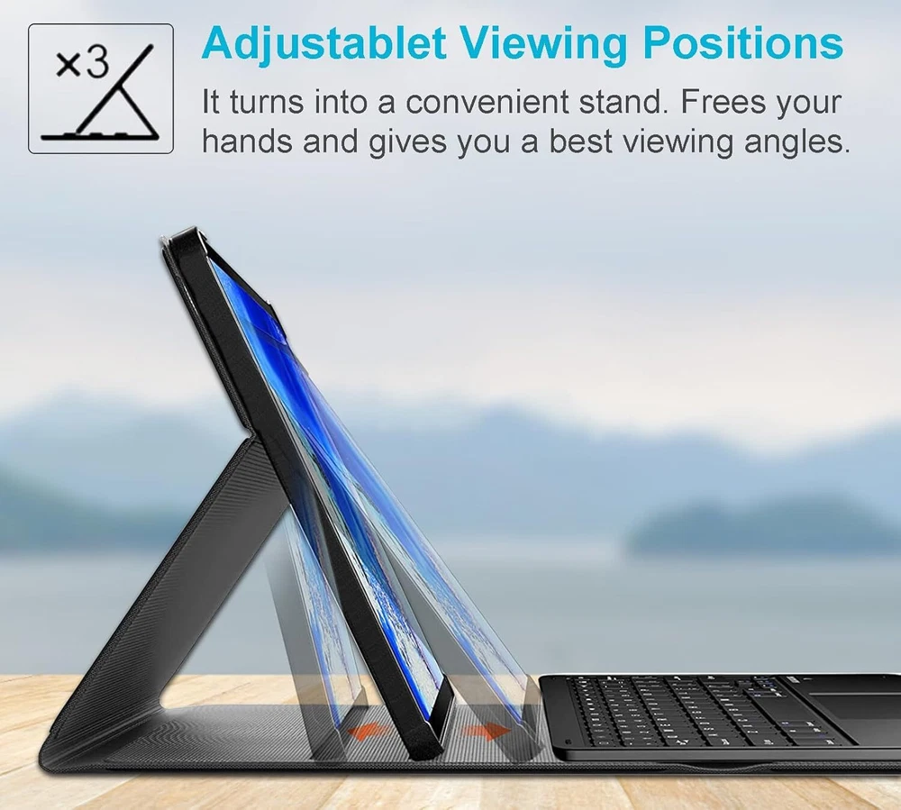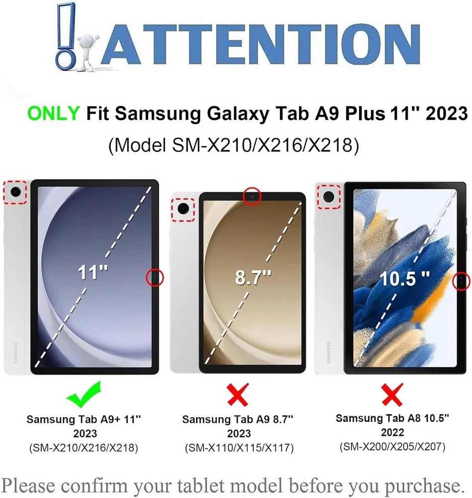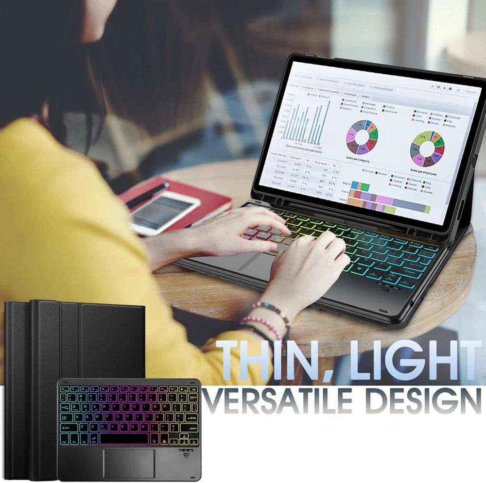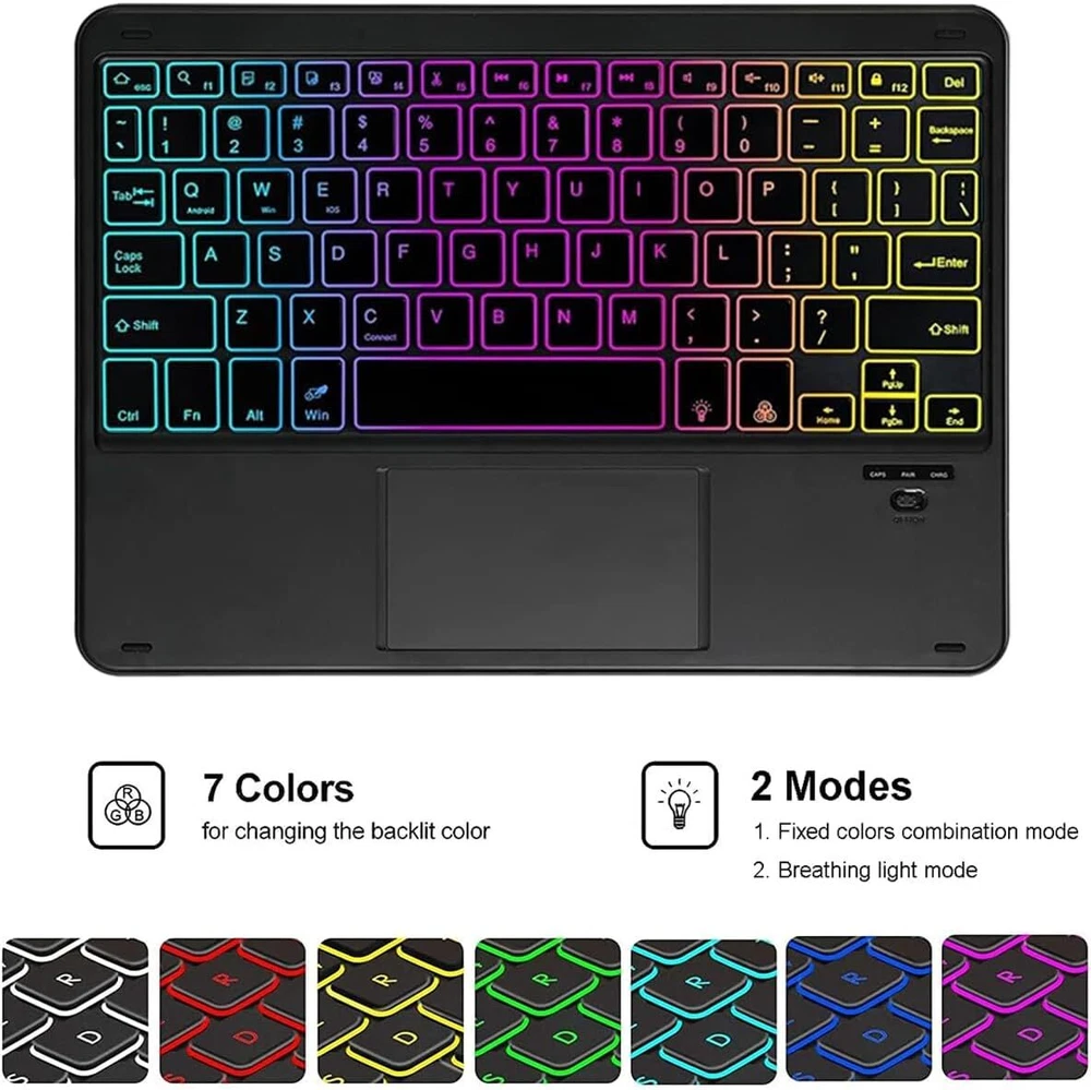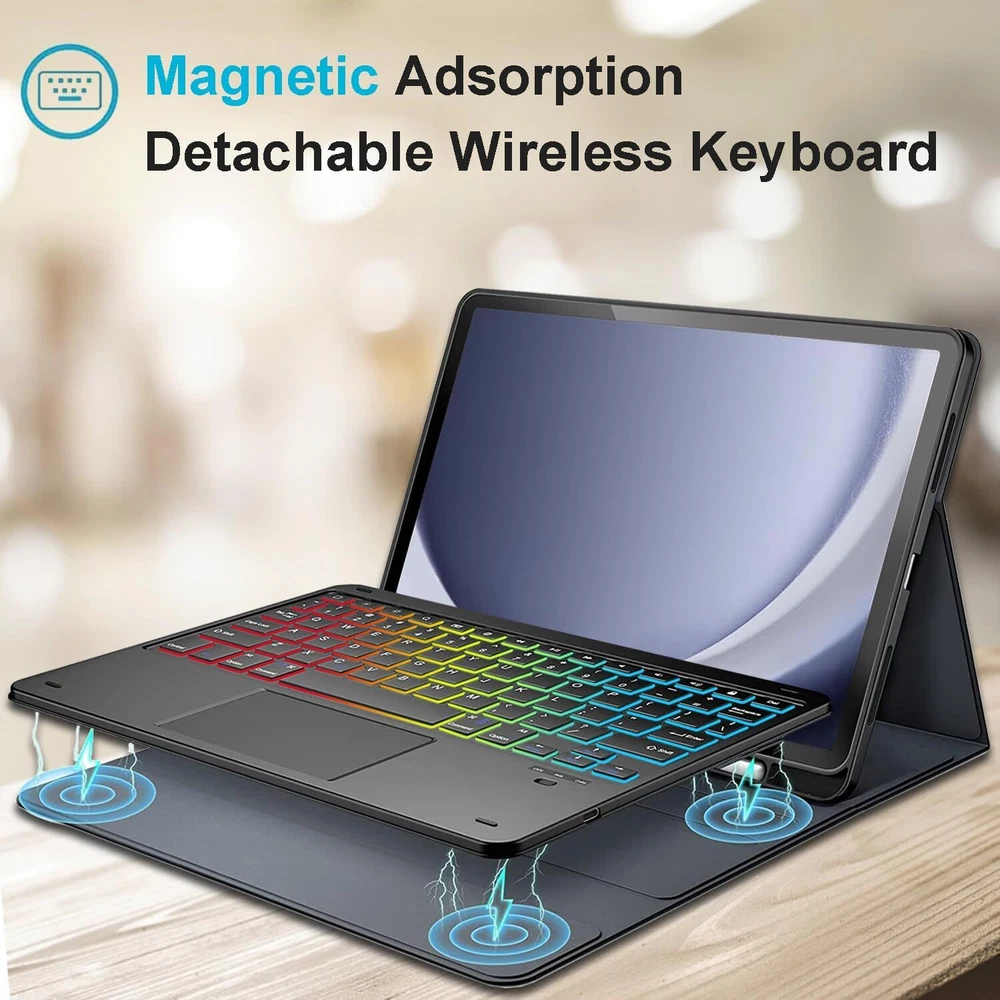 Touchpad Keyboard Case for Samsung Galaxy Tab A9 Plus 11 Inch Product Details Brand: Nanhent Color: Tab A9 Plus Compatible Devices: Samsung Galaxy Tab A9 Plus 11 Inch 2023 Material: Acrylonitrile Butadiene Styrene, Polycarbonate Special Feature: Backlit, Trackpad, Rechargeable 【Precise Hole Position, Honeycomb Design】The mold for A9+ case is made based on the real A9+ tablet, and the precise cutouts can make full use of all functions, and provide perfect protection and convenience for daily use. The soft TPU inner shell adopts a honeycomb design, which is beneficial to the heat dissipation of the tablet and improves the performance of the tablet. 【Rainbow Backlight】Suitable for Samsung tablet A9+ RGB rainbow backlight keyboard, 7 adjustable backlight colors, breathing light backlight mode can be automatically switched. The backlit keyboard can be used in the dark, providing a comfortable typing experience. 【Touchpad Keyboard + Multi Touch】The keyboard has a trackpad that supports multi-finger gesture functions.A single finger can slide to move the cursor,click to select a target,etc.Use two fingers to slide to switch pages,open/reduce images,etc.Use three fingers to slide down to take a screenshot,slide up to return to the main interface,etc 【Turn Your Tablet into A Laptop】Keyboard can support Android, iOS Systems, Windows Systems. Real hard laptop style keyboard with high end ABS material. Not cheap silicone keyboard as other cases in market. A spring mechanism underneath each key ensures a tactile response with every stroke, helping you to type faster and with less error than on a touchscreen. Nanhent 2024 Introduces this stunningly attractive and unique case. 7 Colors Rainbow Backlights Touchpad Keyboard Case for Samsung Galaxy Tab A9 Plus 11 Inch. Tablet Model: SM-X210/SM-X216/SM-X218, 2023 Release. How to connect the keyboard with the tablet? 1. Dial ON/OFF button on right direction for opening keyboard, press "FN+C" for 2 seconds into wireless matching condition.(The Bluetooth light blinks slowly) 2. Open Bluetooth on device, search keyboard name: [Keyboard] for matching device to keyboard. 3. Click the "Keyboard" to connect, finish. How to adjusts the colour of the backlight? 1.Click "Bulb" Key to toggle between breathing light and fixed light modes. 2.Fixed light modes, click "RGB key" to switch between 7 color schemes. Specification: Charging voltage: 5V Bluetooth version: Bluetooth 3.0 Transmission distance: up to 10 m Capacity of battery: 450 mAH Charging time: 2-3 hours Working time: 90 hours without backlight Working time: 10 hours with backlight Standby time: 180 days What's in the box? Tablet Case * 1 Rainbow Backlight Touchpad Keyboard * 1 USB-C Charging Cable * 1 Product Manual * 1