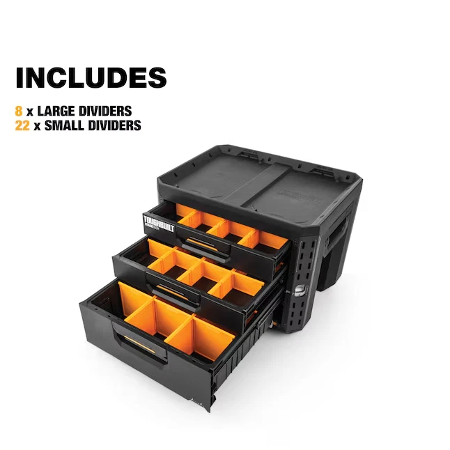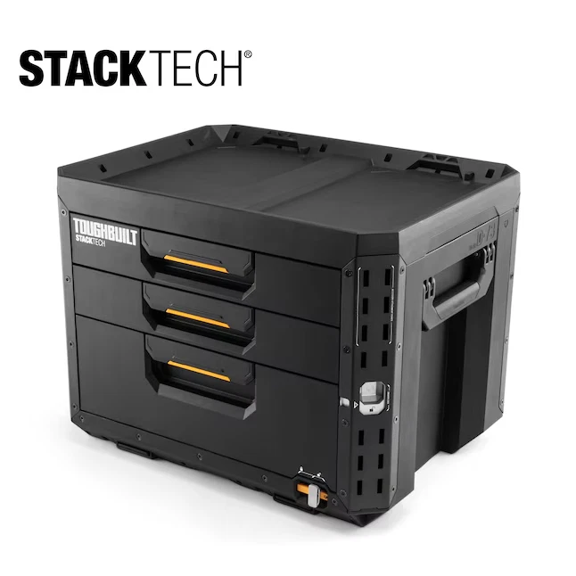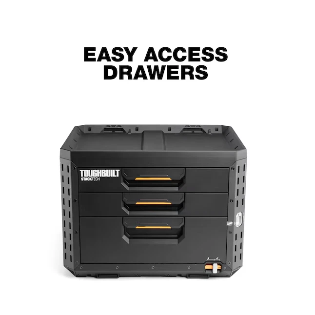 The ToughBuilt StackTech 3-Drawer Locking Box delivers deep, segmented storage in a compact modular footprint. Designed to organize a range of materials and accommodate the diverse needs of those who work across tools, kits, parts, precision gear and more. The multi-depth drawer arrangement balances form and flexibility, while offering rugged protection in the field. With updated drawer layouts, accessory rails, and full-stack integration, it’s a system component made to scale up performance. MULTI-DEPTH DRAWERS: Allow for quick access to storage space without the need to unstack LOCKABLE: Padlockable slide lock for added drawer security ACCESSORY RAILS: Allows adding quick-release accessories for a fully customizable solution INTUITIVE STACKING: The self-aligning, nesting architecture makes stacking boxes fast and hassle-free AUTO-LOCKING INTERFACE: A self-locking mechanism automatically engages when each box is dropped into place and unlocks simply with a single hand CLEAR LOCK INDICATOR: The latch position clearly indicates when it's safe to transport ARMORED STEEL CORNERS: Powder-coated, steel corners provide drop protection and added structural integrity HIGH-IMPACT TESTED: Our advanced structural engineering and high-performance polymers protect against deformation, drops, and shocks SIMPLIFIED TRANSPORTATION: ToughBuilt's category-leading mobility solutions provide a wide range of options to fit your needs and budget