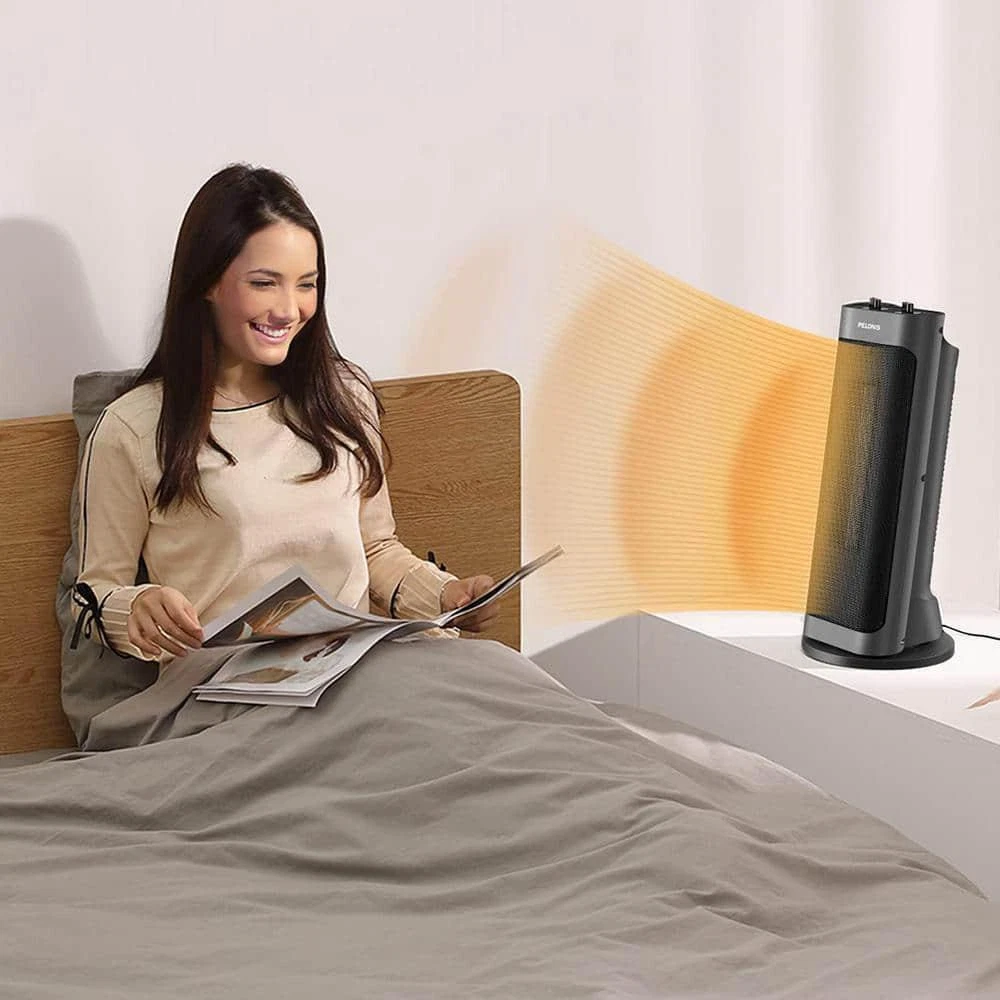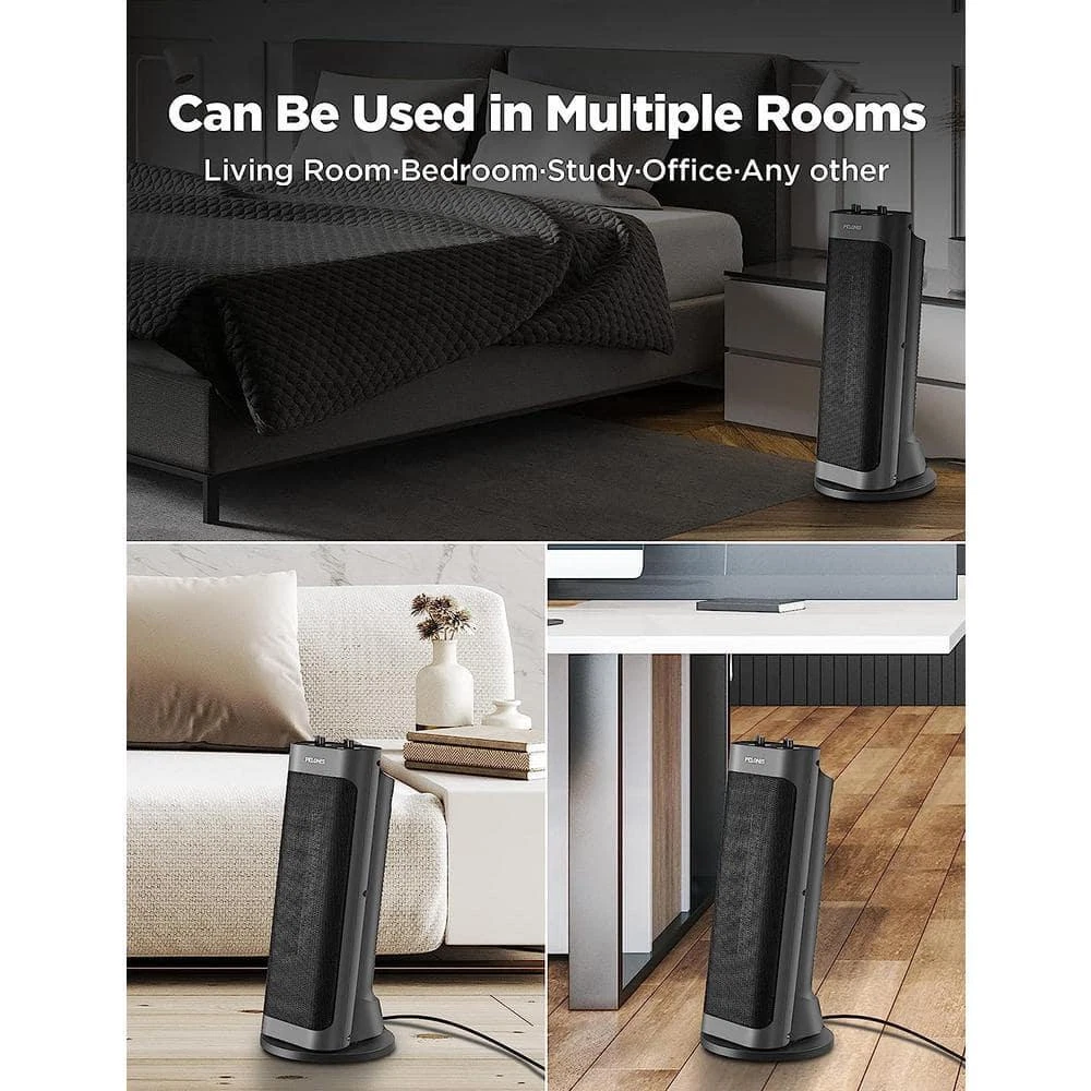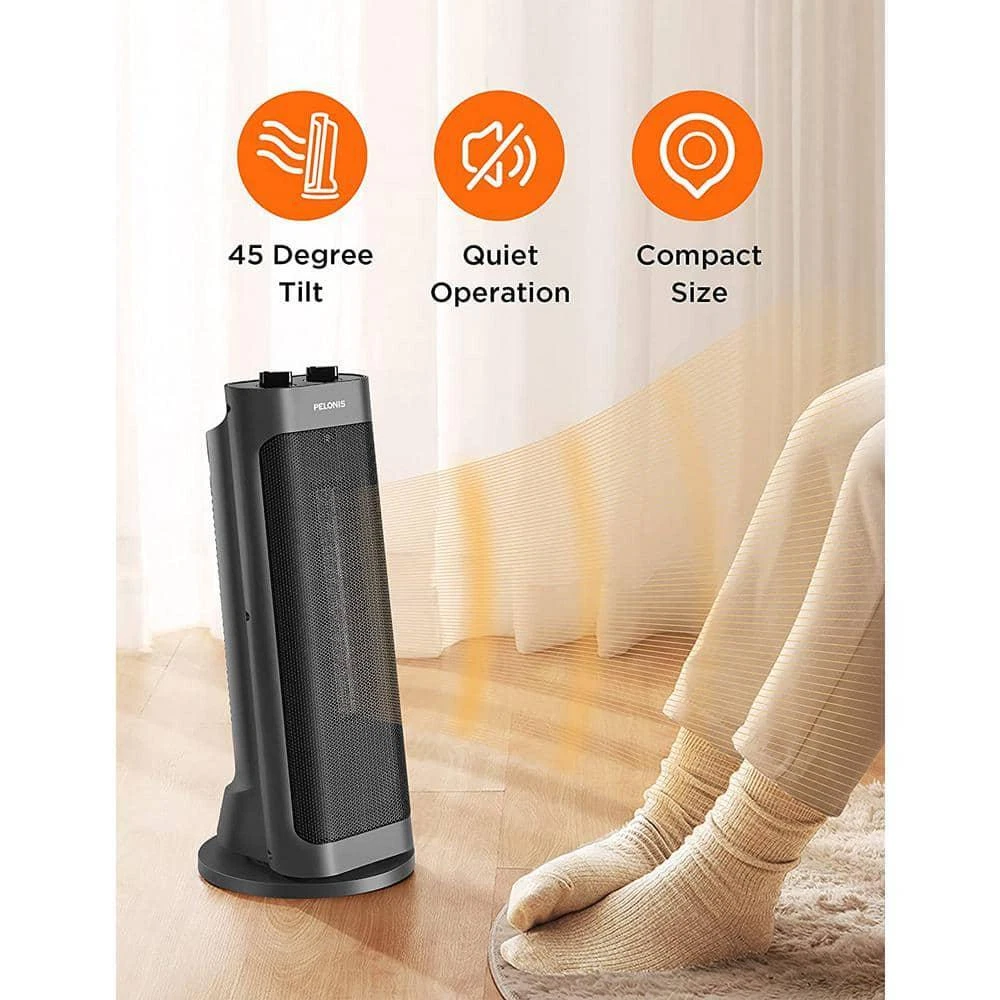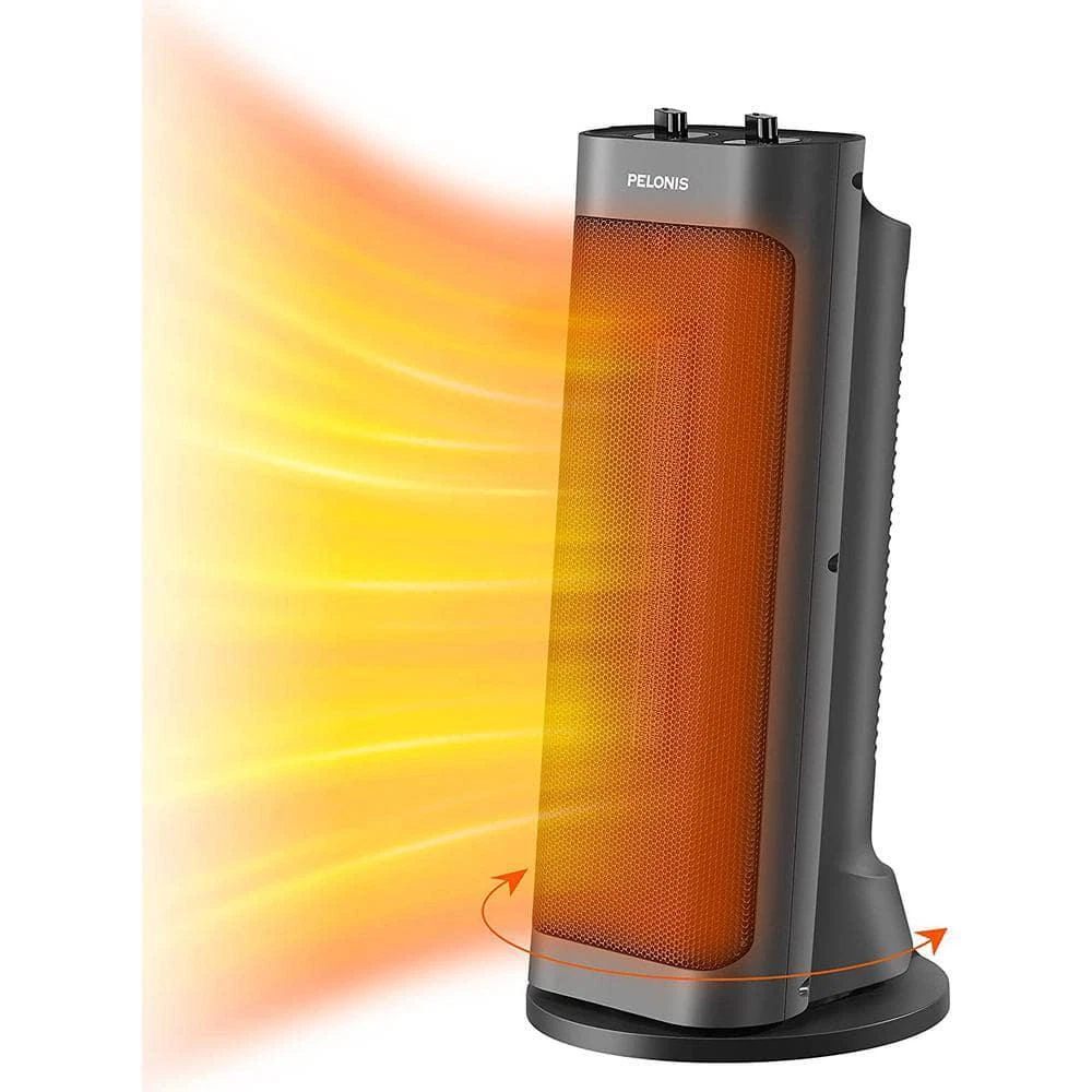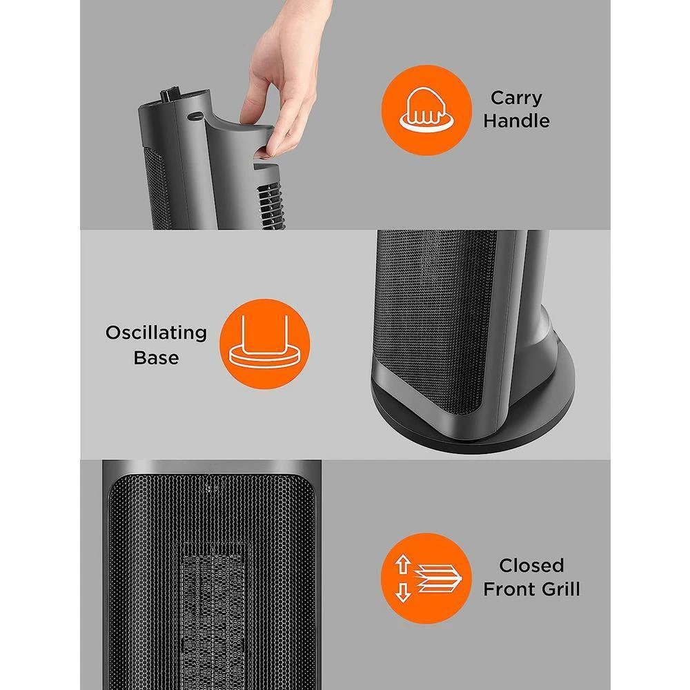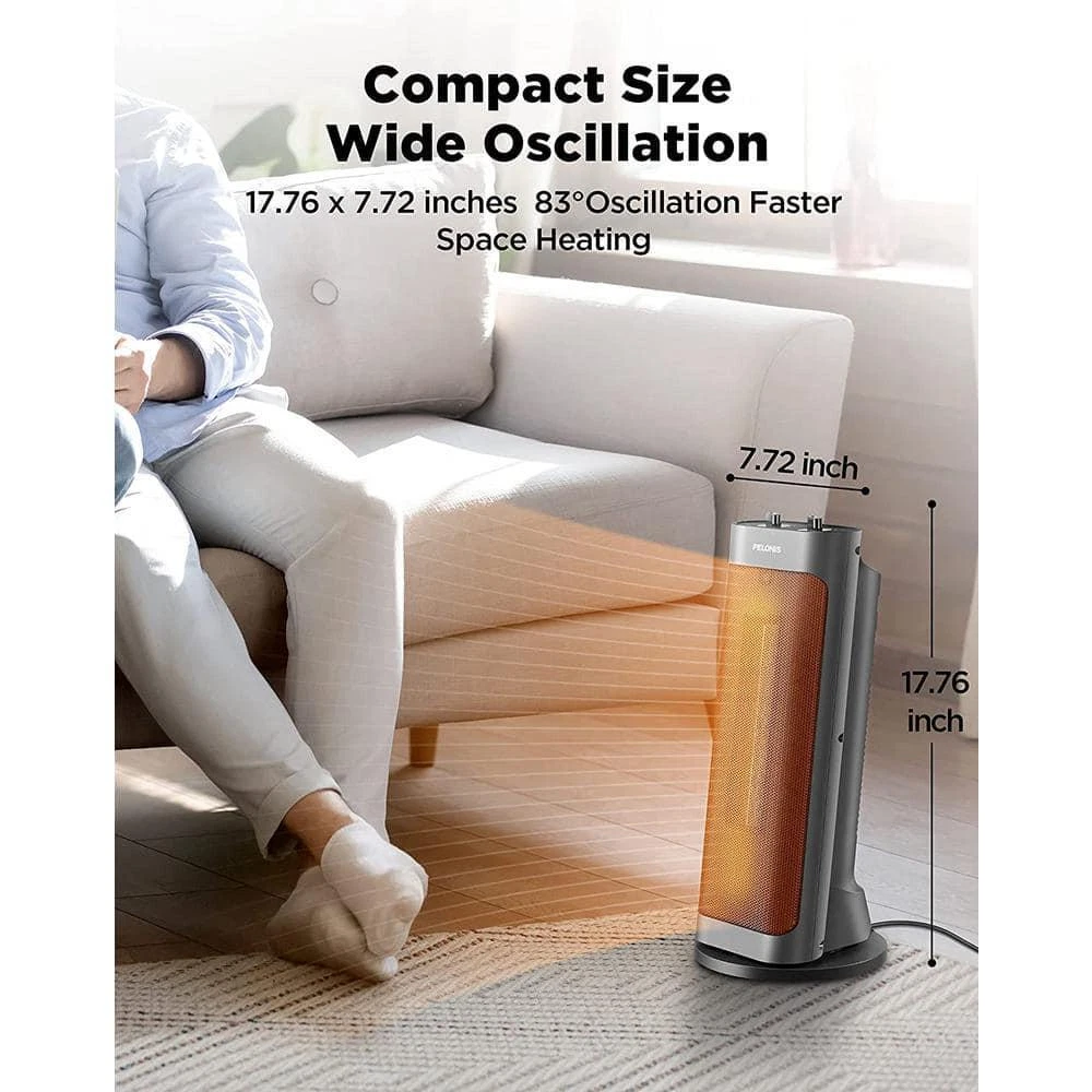 Tower 17.76 in.1500-Watt Electric Ceramic Oscillating Space Heater in Gray with Programmable Thermostat, Oscillation Heats up to 70°F in 3 seconds with ceramic heating technology Energy-efficient space heater with programmable thermostats Over-heating, tip-over switch protection and auto shut-off The unique electric heater features: The Special design is on a full screen with 83 degrees that can increase the heat dissipation area by 20% more than other heaters, making it easier to feel the wrap-around warmth. 3 seconds fast heating and over-heating protection. 2 heating levels: High (1500 Watts), Low (900 Watts) Over-heating protection and Tip-over switch protection Wide-angle oscillation, deliver warmth to an enormous scope (107 sq. ft) The design inspiration of this PTC electric heater comes from the Leaning Tower of Pisa. Amperage (A): 6.82 A Area Heated (sq. ft.): 160 sq ft Color: Black Color Family: Blue Control Type: Mechanical Fan Mode: No Fan Mode Features: Tip-Over Safety Switch Heat rating (BTU/hour): 5000 Btu/h Heater Type: Ceramic Heating Method: Radiant Indoor/Outdoor: Indoor Location Use: Living Space Material: Ceramic Number of Heat Settings: 2 Pack Size: 1 Portable Heater Features: Oscillating,Quiet Operation,Thermostat Power/Fuel Type: Electric Product Weight (lb.): 13.12 lb Returnable: 90-Day Room Size: Small Thermostat Settings: Adjustable Voltage (V): 120 V Wattage (W): 1500 W Certifications and Listings: ETL Listed Manufacturer Warranty: 1 year limited warranty Cord Length (in.): 40 in Product Depth (in.): 6.4 in Product Height (in.): 6.4 in Product Width (in.): 12.3 in