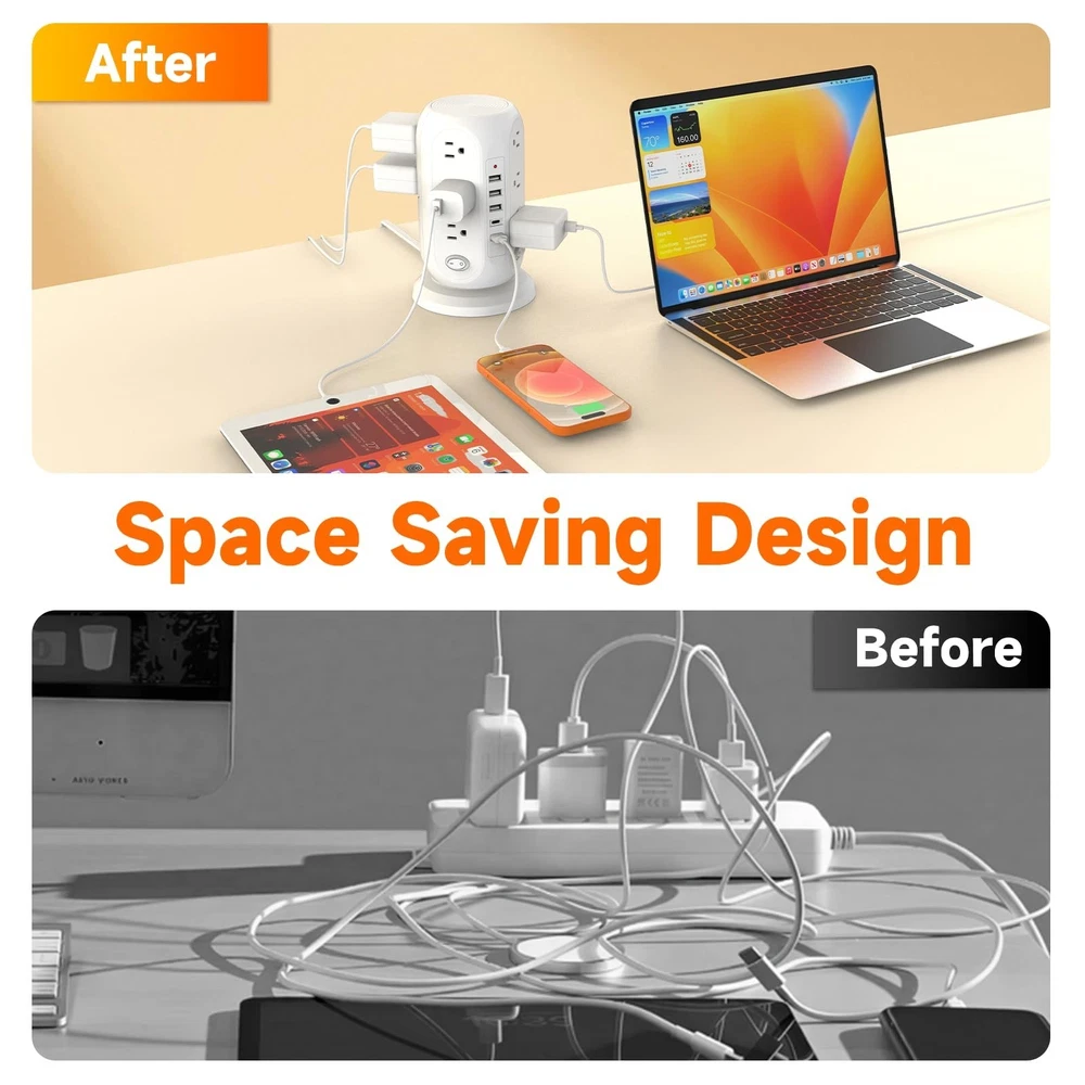 Tower Power Strip with 12 Outlets and 5 USB Ports (2 USB-C), Flat Extension Cord 10 Ft, Surge Protection 1250W Multiple Outlets Charging Station for Home Office Dorm Room Product Details Color: White Brand: FIYQVXK MPN: Does not apply UPC: Does not apply EAN: Does not apply Brand: FIYQVXK Color: White Total Power Outlets: 12 Voltage: 110 Special Feature: Lightweight Package Dimensions: 10 x 5.87 x 5.35 inches Item Weight: 1.7 pounds Date First Available: September 9, 2025 Manufacturer: FIYQVXK 17 IN 1 Power Strip Tower with USB- This vertical power strip with USB ports features 12 AC outlets and 5 smart-charging USB ports(2 USB-C), allowing you to power up to 17 devices simultaneously, widely use in office, school, and dorm room USB Power Strip- 5 USB Charging Ports- 3 USB A ports can charge up to 2.4A, and the 2 USB C ports provide charging speed up to 3A; which can power multiple devices. Such as PC, computers, laptops, phones, tablets, TV, printers, speakers, smartphone, smartwatch, and other office supplies Small Power Strip Tower with On/off Button- The vertical tower design takes up less desk space but offers multiple plugs. Four-sided tower also allows you to use bulky plugs without worrying about blocking adjacent outlets. The size is 558 inch 45 Angled Flat Plug with 10FT Extension Cord -The flat plug features a low profile fits easily in tight spaces, and the 45 degrees angled plug does not cover other outlets,This extension cord 10ft easily reaches distant outlets without excess length on the floor, Surge Protection & Overload Protection- This power strip surge protector with overload protection protects against spikes and fluctuations. This power strip tower has overload protection, short-circuit protection, over current protection, over-voltage protection, over-temperature protection, surge production, and lightning protection.