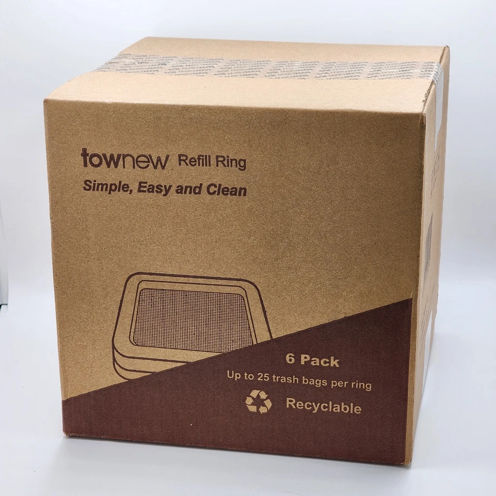 The product is a pack of 6 Townew Smart Trash Can Liner Refill Rings designed for the T1S model. These trash bag liners are square in shape with dimensions less than 6 inches in height, less than 5 inches in length, and less than 6 inches in width. The specific details of the brand, type, and unit quantity are provided, making it clear that these liners are compatible with the Townew smart trash can.