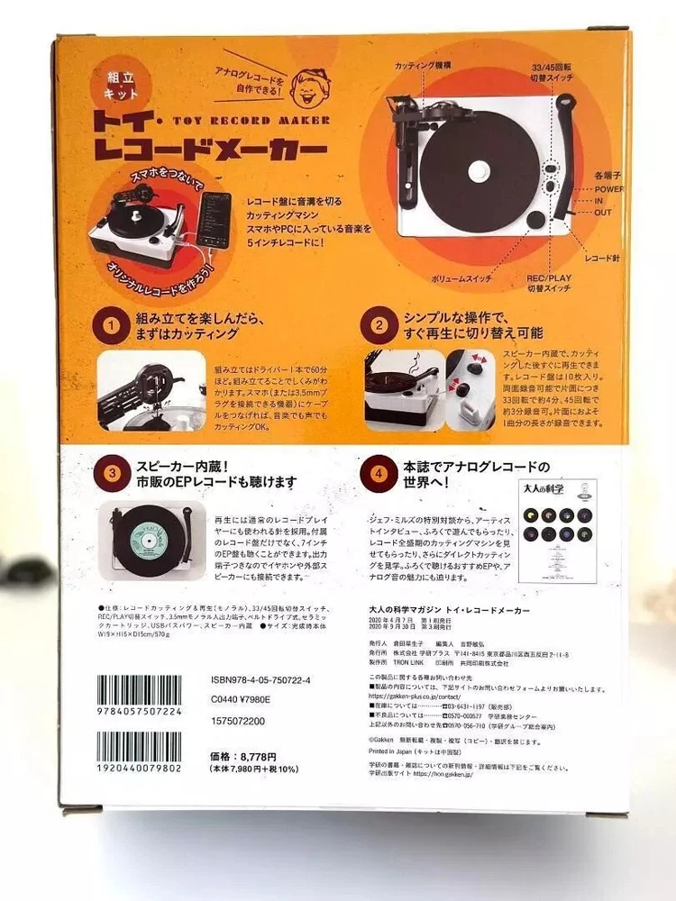 Adult Science Magazine Toy Record Maker Description About This Items Contents introduction (from the publisher) "Standard version with everything you need!!" Assembly kit that lets you connect your smartphone and create the only analog record in the world This kit lets you record (cut) music from your smartphone onto a 5-inch record and play it right away. The sound engraved into the grooves of the record is Lo-Fi, but you'll feel the analog flavor that makes you want to listen to it over and over again. Engrave your favorite songs or the voice of someone special onto the record. Your one-of-a-kind original record is complete. [Kit contents] ◆Specifications: Record cutting & playback (mono), 33/45 rpm switch, REC/PLAY switch, 3.5mm mono input/output terminal, belt drive type, ceramic cartridge, USB bus power, built-in speaker Shipping We always send the item with a tracking number. So please place an order without any concern on delivery. You can always track the delivery status. Shipping is only available to the address registered in eBay. If you want us to send another address, please change your address on eBay and then place an order. Shipping is available from Monday to Friday. Weekends are not available because freight (shipping) companies are closed. We do not mark merchandise values below value or mark items as “gifts” – Japan, US and International government regulations prohibit such behavior. About Importer's Obligation Import duties, taxes, and charges are not included in the item price or shipping cost. These charges are the buyer's responsibility. Please check with your country's customs office to determine what these additional costs will be prior to bidding or buying. Thank you for your understanding.