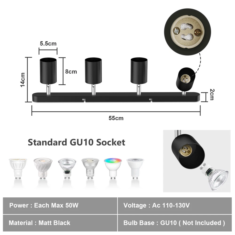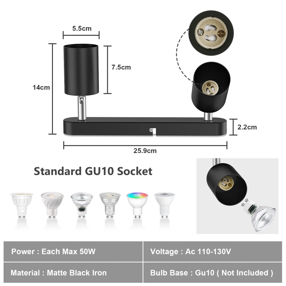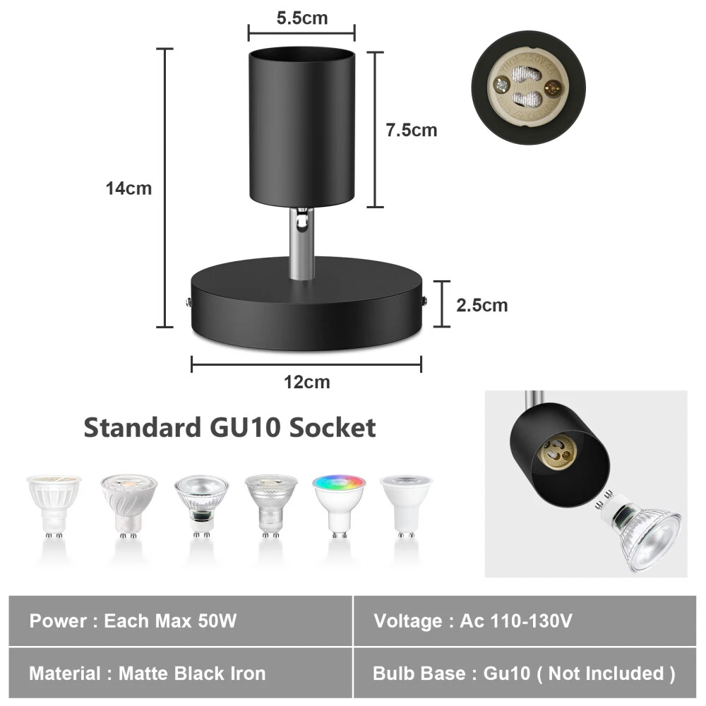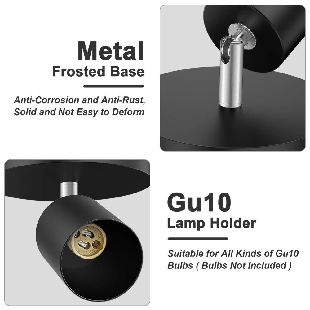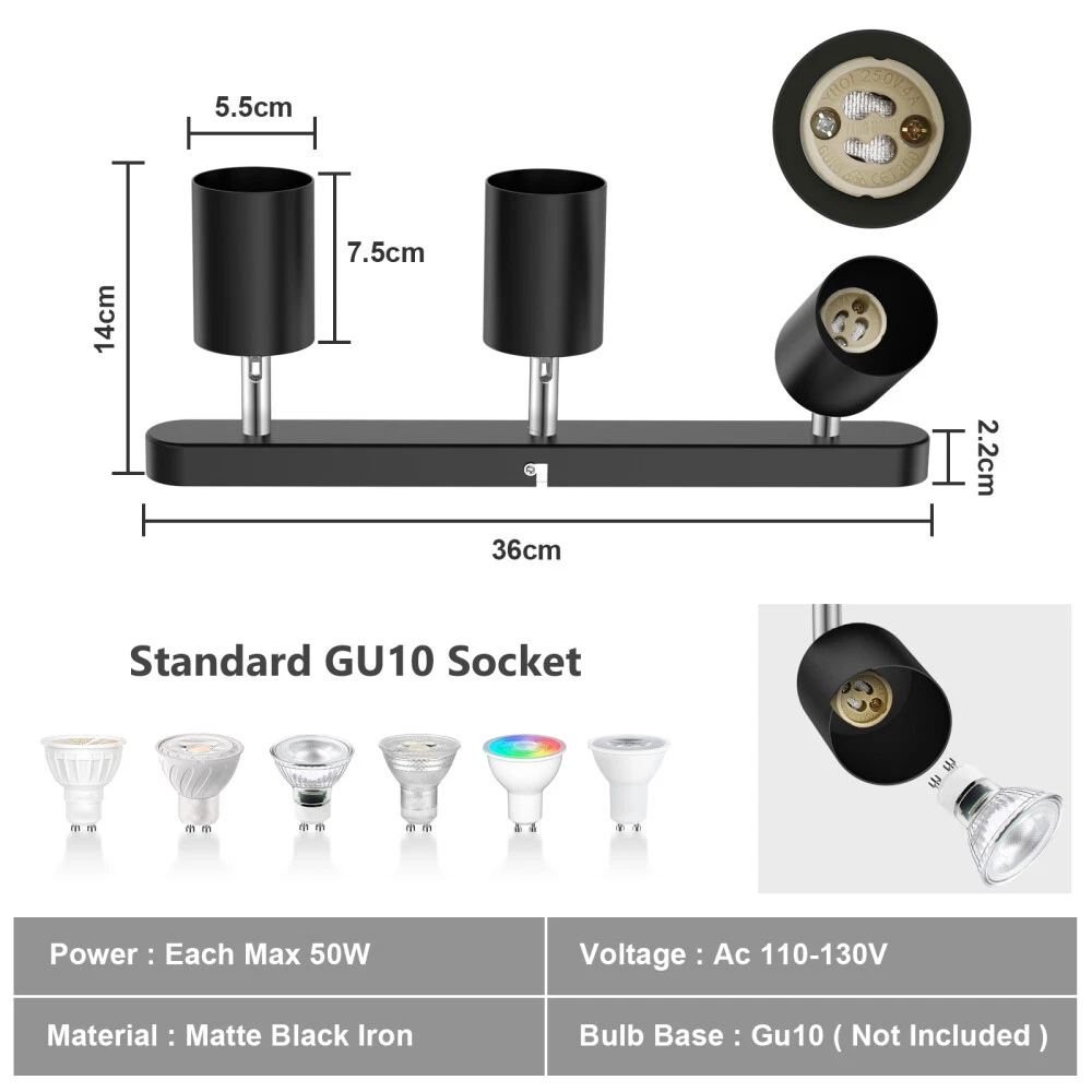 LED ceiling spotlight 4 b ulbs, ceiling spotlight LED swivel GU10(NO GU10 Bulb) 1.It can not only be mounted on the wall or ceiling, but can also be flexibly adjusted. 2.With its 4 spots, it illuminates the entire room perfectly. Optimal illumination by adjusting and rotating the lamp head so that the light reaches the ideal position. GU10 socket, bulbs no t included Thanks to the easily accessible GU10 sockets, because everyone has different requirements for the color temperature and wattage of the bulb. Therefore, we have not equipped the spotlight with a light source. This way you can choose the right light source according to your needs. It is recommended to use LED bulbs. Specifications: Type: 1/2/ 3/ 4 flames Socket: GU10(NO GU10 Bulb) Color: white/dark gray/matt black Material: aluminum; iron Voltage: AC100-240V Maximum power of the lamp: Max. 50W (per socket) Package includes: Ceiling spotlight * 1 Installation accessories * 1 Installation manual * 1 Tip: Bulbs not included