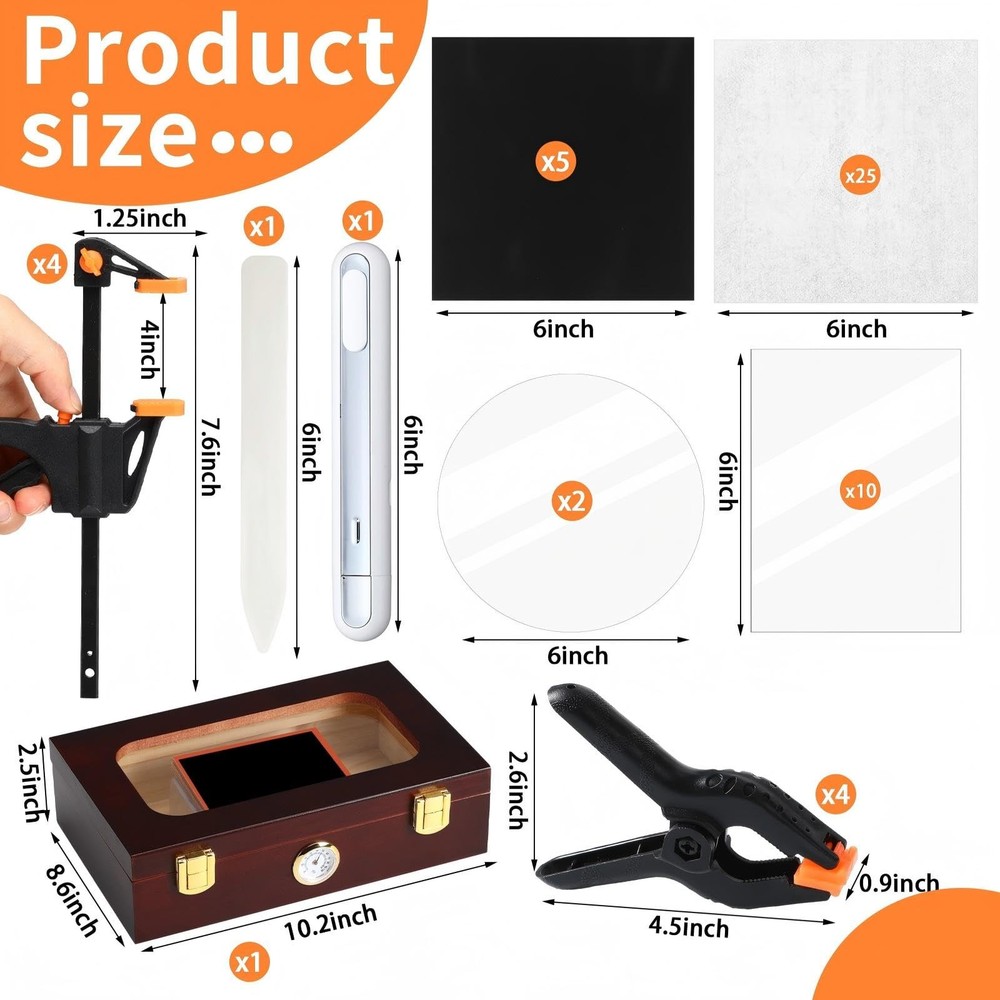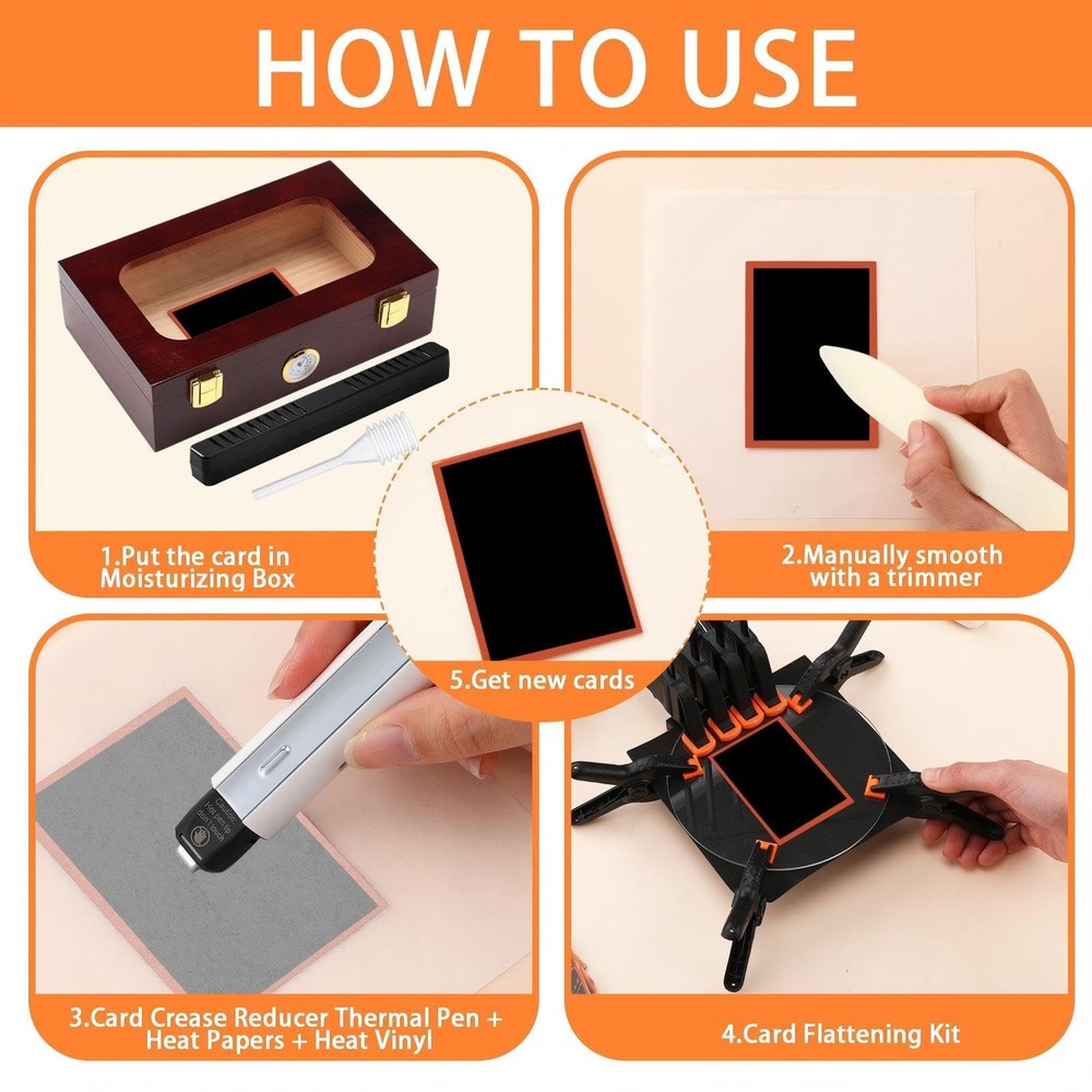 Trade Card Flattening Kit Sports Card Cleaning Kit Include 1 Moisturizing Box 2 Acrylic Sheets 8 Plastic Clamps 5 Pads 1 Bone Folder 1 Thermal Pen 10 PC Sheets 25 Heat Resistant Paper What's Included: our card flattening kit is for collectors who want to repair cards with curves, corners, dents, or creases; The kit includes: 1 clear moisturizing box, 2 clear 6'' acrylic Sheets, 5 black sponge pads, 1 bone folder, 1 Thermal Pen(USB powered, blade is not included), 10 Clear Heat Resistant PC sheets (about 6x4 inches); 25 Heat Resistant paper(about 6x6 inches) Safe and Effective: using 2 types of clamps and clear round acrylic sheets, this card flattening kit provides a secure and efficient method to ensure your cards remain flat without damage; The acrylic sheets protect while the plastic clamps secure, making it the ideal primary card flattening tool; While our bone folder and thermal pen can gently smoothes out deeper wrinkles, ensuring all your sports cards are ready for proper grading and display Card Restoration Upgrade: the main function of the moisturizing box is to soften and soothe the material of the card by controlling humidity, making it easier to straighten and flatten; When the card absorbs a certain amount of moisture in the box, it can be easier to carry out subsequent physical adjustment processes, such as flattening or removing bends; Note that when using the box, you need to carefully control the humidity to prevent the paper from being damaged by excessive moisture Thermal Pen Instructions: quick double-click to turn on (red light=180°C); Double-click again for blue light (110°C); One more double-click to turn off; Auto shuts off after 30 seconds of no use; After powering on (light flashes fast), press and hold the button to heat; Release to stop; Red+blue lights flashing=low battery; Red solid=charging; Blue solid=fully charged; Runtime: charging 2 hours; Full charged allows 17 mins of continuous high-heat use; Caution: do not touch hot tip-risk of burns Disclaimer: no responsibility is assumed for your actions with this kit; You should practice on basic cards first before using real cards; When using the dent removal method, make sure not to use too much spray on the mat, otherwise it will cause water spots on the card; Please note that the spray will evaporate, but never soak or spray the card directly Features: What's Included: Our card flattening kit is for collectors who want to repair cards with curves, corners, dents, or creases. The kit includes: 1 clear moisturizing box, 2 clear 6'' acrylic Sheets, 5 black sponge pads, 1 bone folder, 1 Thermal Pen(USB powered, blade is not included), 10 Clear Heat Resistant PC sheets (about 6x4 inches). 25 Heat Resistant paper(about 6x6 inches) Versatile Card Care Essentials: Designed for both beginners and seasoned collectors, this sports card cleaning kit is intuitive and easy to use. All components work in harmony, delivering a thorough cleaning and card centering grading experience. Whether at home or a professional setting, this kit offers everything needed to maintain and enhance the quality of your card collection, proving its worth as an essential card grading kit Specifications: Material: plastic, acrylic, paper Color: black, white Package includes: 1 x Clear moisturizing box 2 x Acrylic Sheets 5 x Black sponge pads 1 x Bone folder 1 x Thermal Pen 10 x Heat Resistant PC sheets 25 x Heat Resistant paper Notes: Manual measurement, please allow slight errors on size. The color may exist a slight difference due to different screen displays Shipping We offer FREE shipping on all orders! We ship within Three business days of payment, usually sooner. We use a selection of shipping services such as UPS, FedEx, USPS etc. We only ship to the lower 48 states, no APO/FPO addresses or PO Boxes allowed. Local pickups and combined shipping options are not provided at this time. Return You can return a product for up to 30 days from the date you purchased it. Any product you return must be in the same condition you received it and in the original packaging. Please keep the receipt. Payment We accept payment by any of the following methods: PayPal Please pay as soon as possible after winning an auction, as that will allow us to post your item to you sooner! Feedback Customer satisfaction is very important to us. If you have any problem with your order, please contact us and we will do our best to make you satisfied. Contact Us If you have any queries, please contact us via ebay. We usually respond within 24 hours on weekdays. Please visit our eBay store to check out other items for sale! Thank you for shopping at our store.