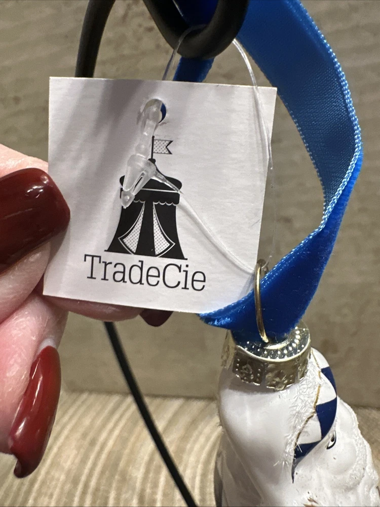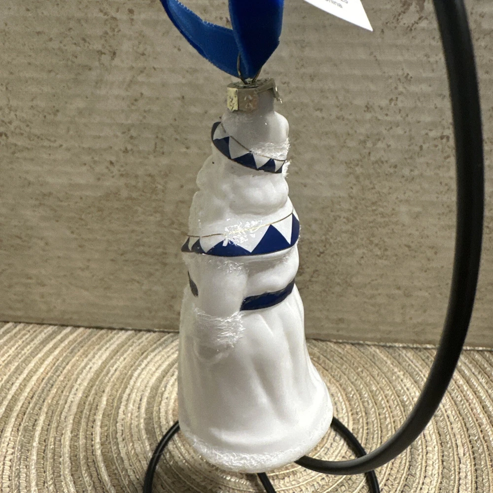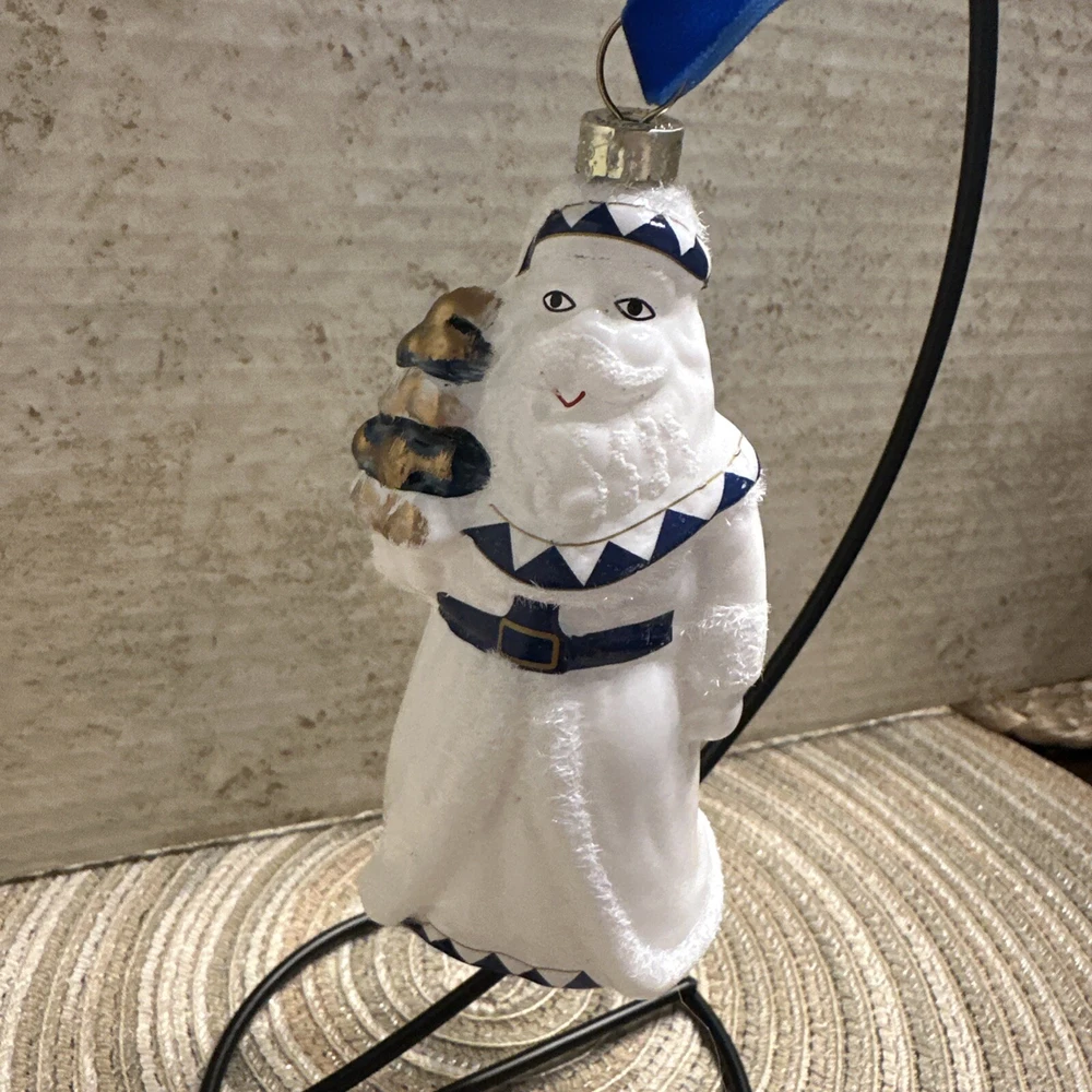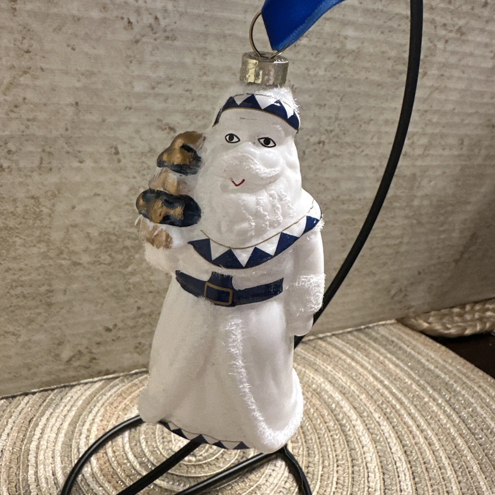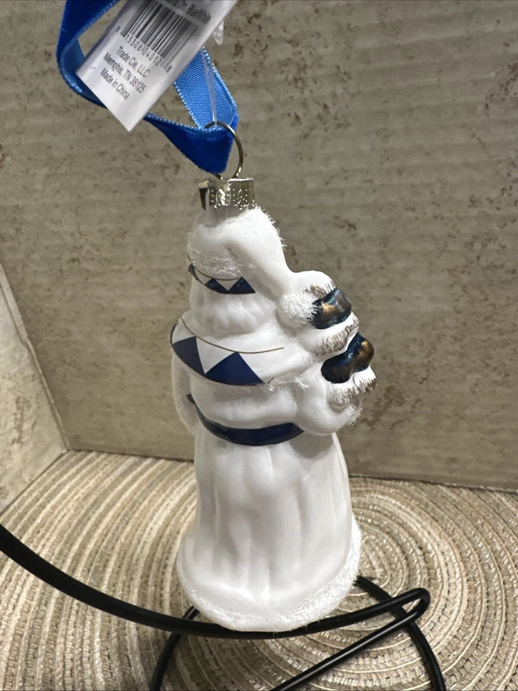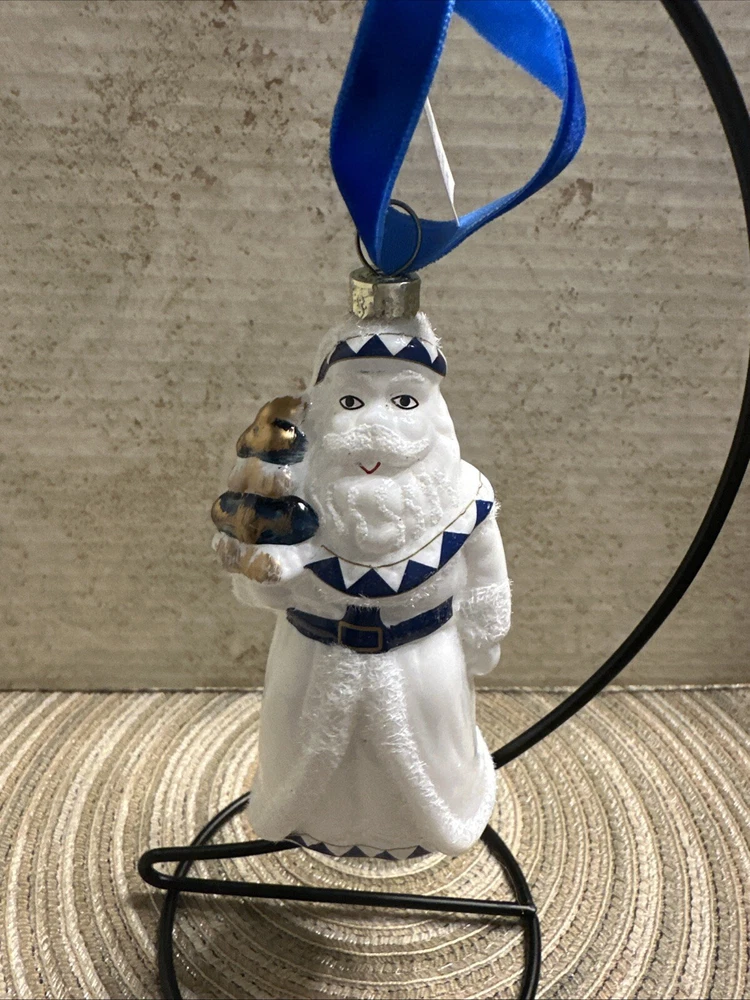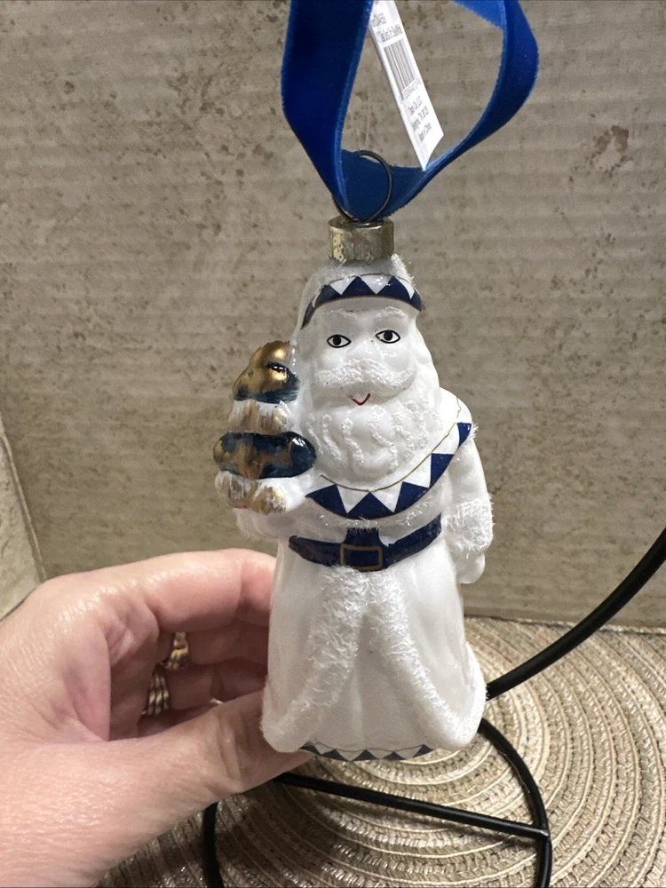 Add a touch of elegance to your Christmas decor with this exquisite Trade Cie glass ornament featuring a charming Santa Claus design. The blue and white color scheme and intricate Chinoiserie pattern make this ornament a unique and beautiful addition to your holiday collection. This handmade, artist-designed ornament is embellished with delicate details and hangs gracefully on any Christmas tree. Perfect for the holiday season, this Santa Claus ornament is a must-have for any festive decor enthusiast.