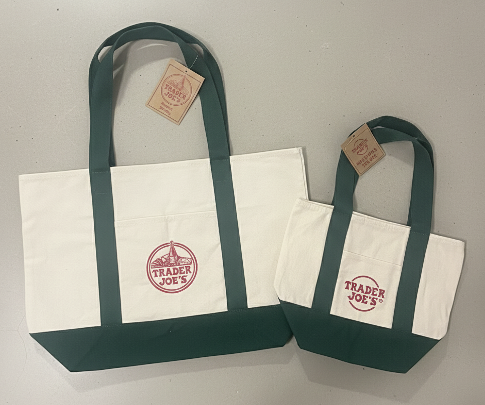 You are purchasing a brand new Trader Joe’s canvas tote bag set in green. This set includes: • 1 Large Trader Joe’s Canvas Shopping Tote – Green (New with Tags) • 1 Trader Joe’s Mini Canvas Tote – Green (New) Both bags are authentic Trader Joe’s items and are brand new, unused, and clean. Perfect for grocery shopping, everyday errands, gifting, or collecting popular Trader Joe’s merchandise. Large Tote Features: • Durable canvas material • Spacious interior for groceries or daily use • Reusable and eco-friendly • Classic Trader Joe’s green color • New with original tags attached Mini Tote Features: • Same sturdy canvas style in a compact size • Great for lunch, small items, or gifting • Matching green color Condition: • Brand new This listing is for the SET (both bags together). They will be carefully packed to arrive in excellent condition. Great as a gift or for Trader Joe’s fans.