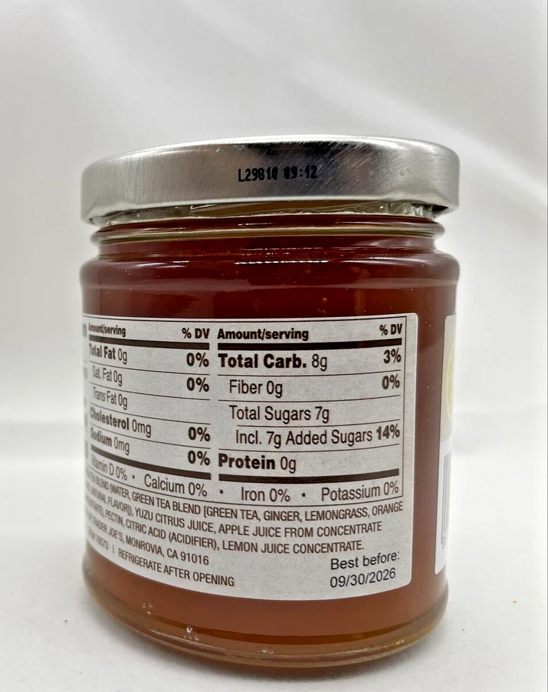 Enjoy the seasonal limited time Trader Joe's Green Tea and Yuzu Spread, perfect for your daily course. This jam and preserve is made with citrus as the main ingredient, and is California Certified Organic Farmers (CCOF) labeled. The jar packaging contains 7.75 oz of the spread, with 15 servings of 40 grams each. This modern style jam is made in Belgium and is perfect for those who are caffeine-free, dairy-free, and vegan. It contains alcohol and has less than 50 calories per serving. The Trader Joe's Green Tea and Yuzu Spread is a must-have for any tea lover's pantry, and is a great addition to any breakfast or afternoon snack. Ships free one business day.
