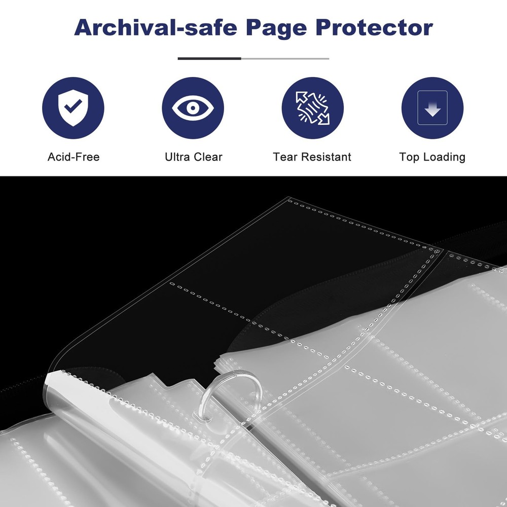 Trading Card Binder, 9 Pocket Card Binder with Sleeves 720 Double Sided Pocket Sports Card Binder, Premium Card Binders Compatible with MTG, TCG, Baseball Cards, and Football Cards(Blue) 【Unique Display Design】The newly upgraded card binder seamlessly integrates display and storage functions. Equipped with 4 punched hard plastic card protectors and 2 hanging chains, it is meticulously designed to showcase your treasured cards, while the trading card binder itself offers ample storage space for your collection. 【Large Capacity】The 3 ring design allows you to easily add or remove pages. The baseball card binder includes 40 pages of double-sided 9 pocket card sleeves binder sheets, with a total capacity of up to 720 cards, offering ample space to organize and display your precious collection. 【Exquisite Details】Crafted with high-quality PU leather exterior, the sports card binder is waterproof and durable. The card sleeves are acid-free, non-toxic, and highly transparent, ensuring card safety while providing perfect display clarity. The wristband design makes it easy to carry, allowing you to enjoy your collection on the go. 【Wide Compatibility】Compatible with MTG, PKM, TCG, baseball cards, football cards, the trading card binder meets all your card collection and protection needs. It's a must-have for all trading cards aficionados 【Perfect Gift】The card binder is an ideal gift for card enthusiasts. Whether it's a birthday, holiday, or any special occasion, it will delight your friends or children. They can store their favorite trading cards in it and showcase and share them anytime, anywhere.