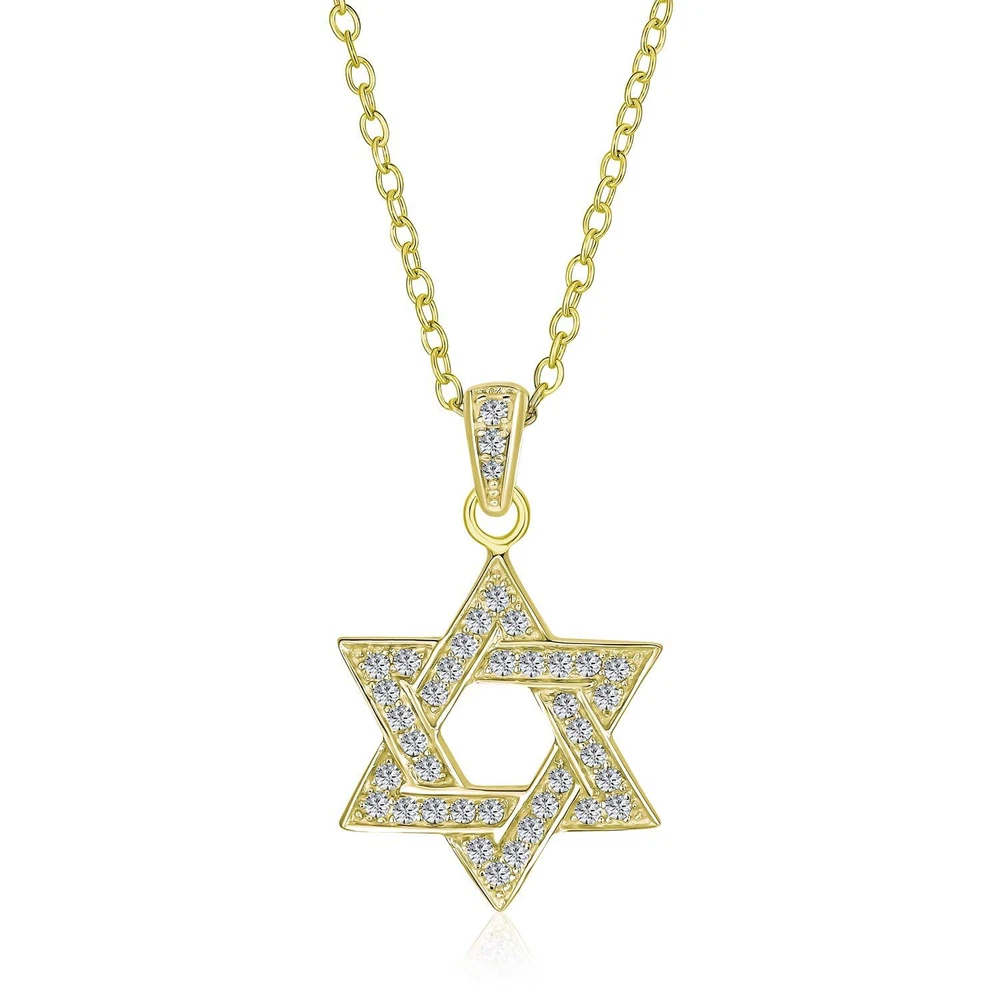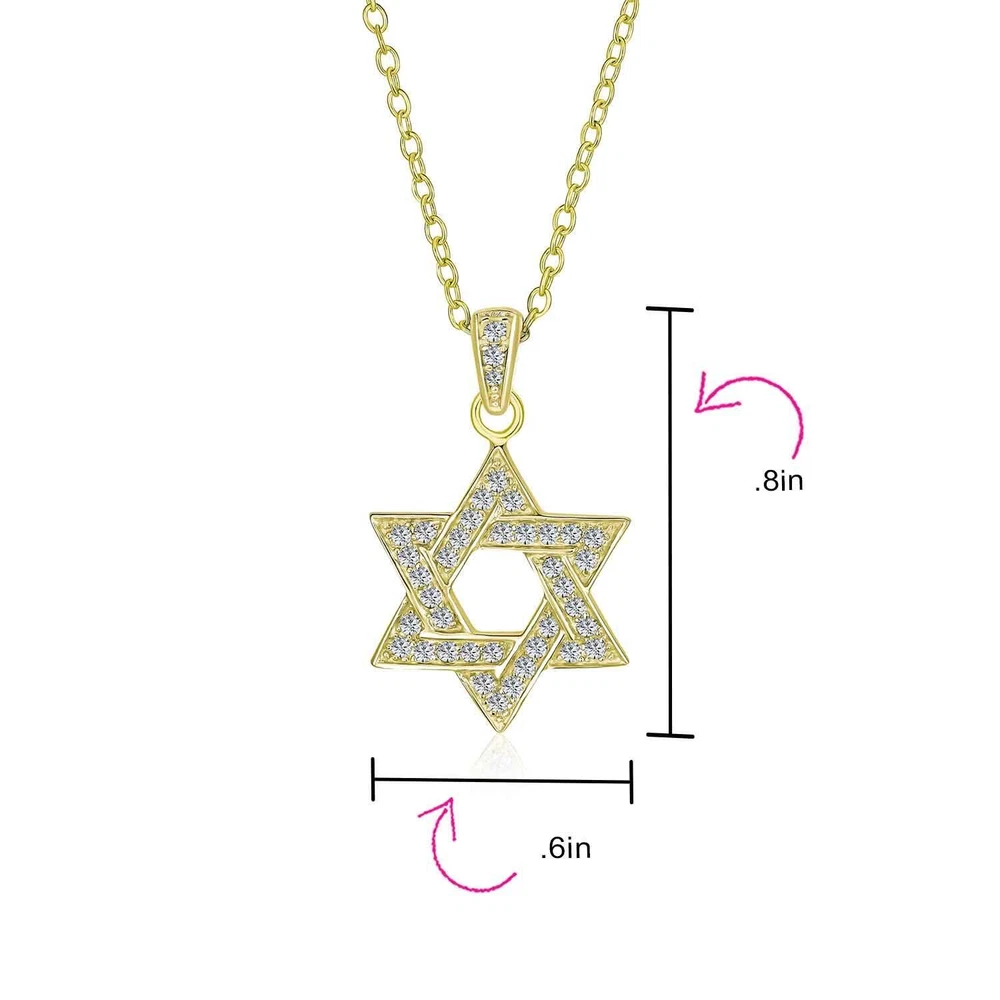 Description Showcase your faith with our stunning Star of David pendant. Crafted from .925 Sterling Silver, it features sparkling Cubic Zirconia stones. The silver and gold combination ensures this charm stands out. Elevate your outfit with this elegant Star of David necklace. Perfect for any formal or casual event. An ideal gift for any celebration. Add this beautiful religious jewelry piece to your collection today. Chain included. Spiritual Style: Celebrate your faith with brilliant style in this beautifully designed necklace featuring a cutout open Magen star charm. A wonderful gift for Passover or Hanukkah, CZ studded star is fine Judaic Jewelry to share your faith or heritage with this pave sparkling Star of David necklace, perfect for Bat Mitzvah, Passover, or Chanukah. Material: Genuine .925 Sterling Silver Yellow 14K Gold Plated, Cubic Zirconia, HYPOALLERGENIC - Lead-Free Nickle-free. Each piece is stamped .925 guarantees quality and craftmanship. Measure: 0.75 inch , With 16-18 inch 2 inch Extender Chain Adjustable, Weight: 1.3 gram Affordable Alterative to Diamonds-Buy Cubic Zirconia: Show your love for the Earth and your sweetheart by choosing cubic zirconia jewelry gifts. Lab created CZ reduces social and destructive environmental impact caused by the mining of diamonds. CZ Jewelry is virtually flawless and only a jeweler can tell the difference. Thoughtful Gifts for Every Occasion: Whether its Mothers Day, an Anniversary, Wedding, Birthday, Holiday, Stocking Stuffer, Christmas, Valentines Day, or Graduation, our exquisite jewelry is the perfect present. Ideal for expressing your love to your Sister, Mother, Grandmother, Daughter, Wife, Girlfriend, Aunt, Mum, Mommy, Grandma, or even for yourself. Its the ultimate gift for anyone special in your life USA-Based Company with 30-Day After-Sale Service: We take pride in our craftsmanship and product quality. Rest assured, if you receive an item with manufacturing defects, weve got you covered. Click on Sold by to contact our customer service. Your satisfaction is our top priority, and well do everything we can to make it right.